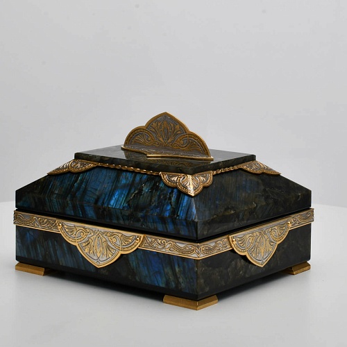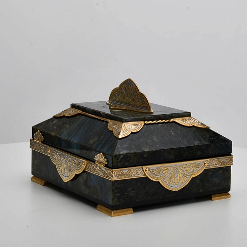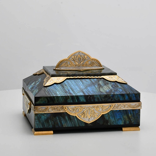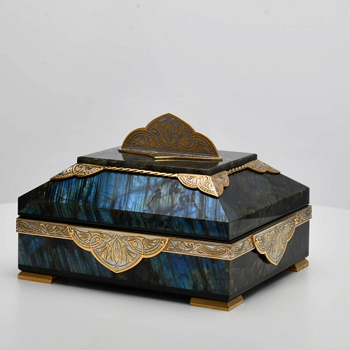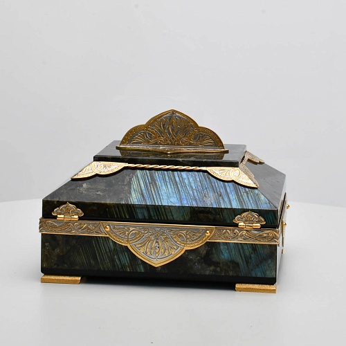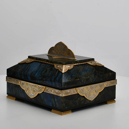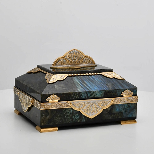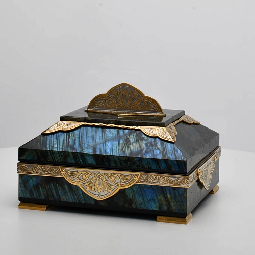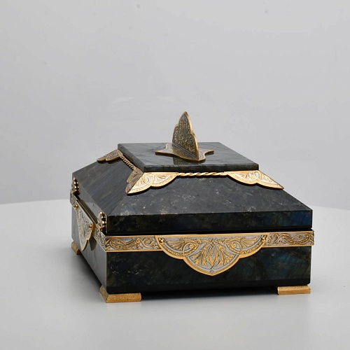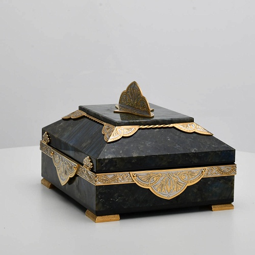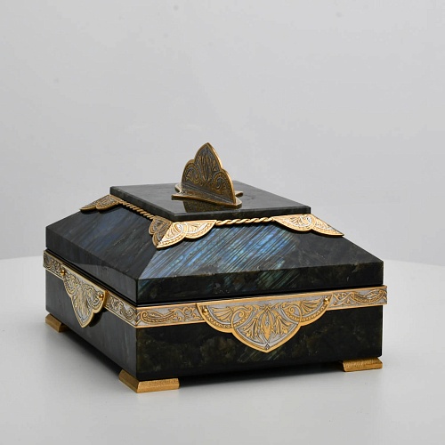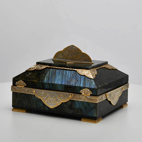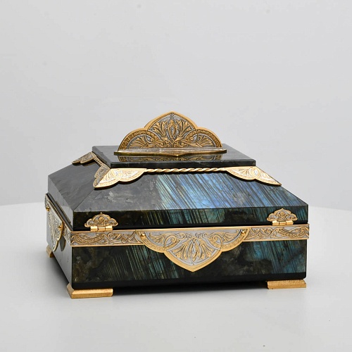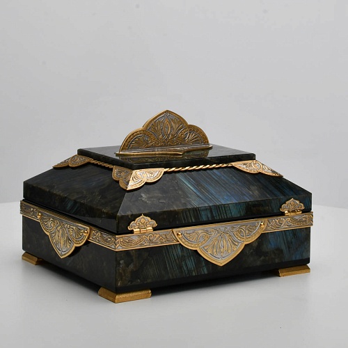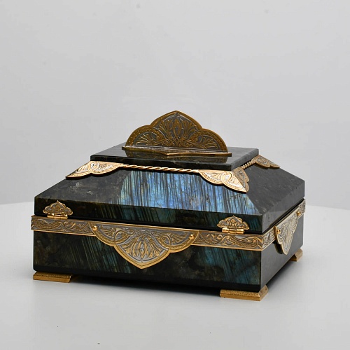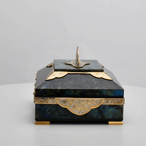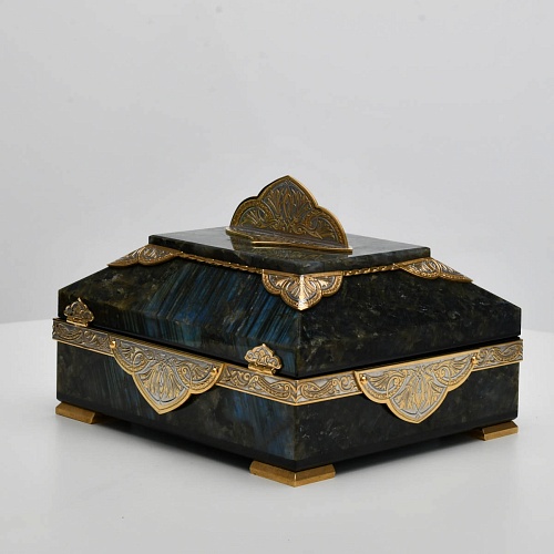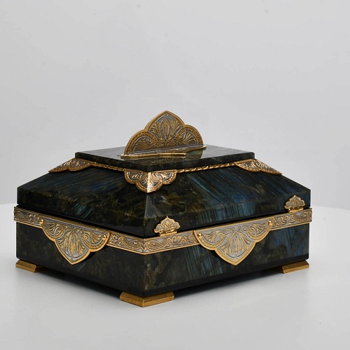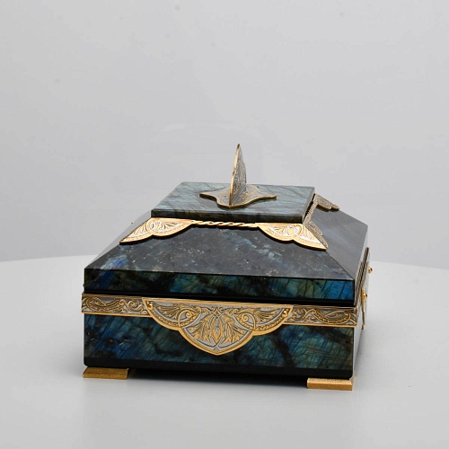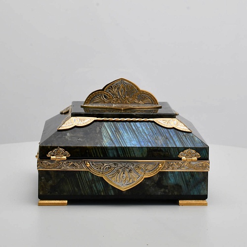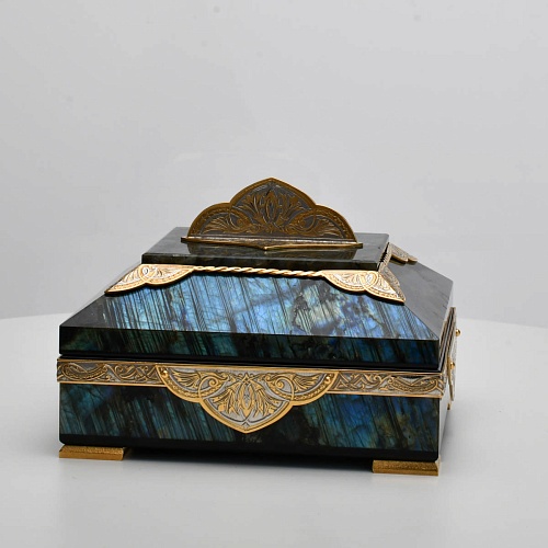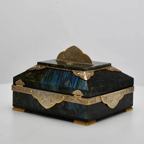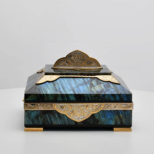 Шкатулка "Таинственная ночь" изготовлена из лабрадорита редкой красоты и украшена декоративными накладками с изображением цветочных орнаментов. Такая вещь, безусловно, украсит собой интерьер и станет изящным местом хранения для самых любимых и дорогих украшений.