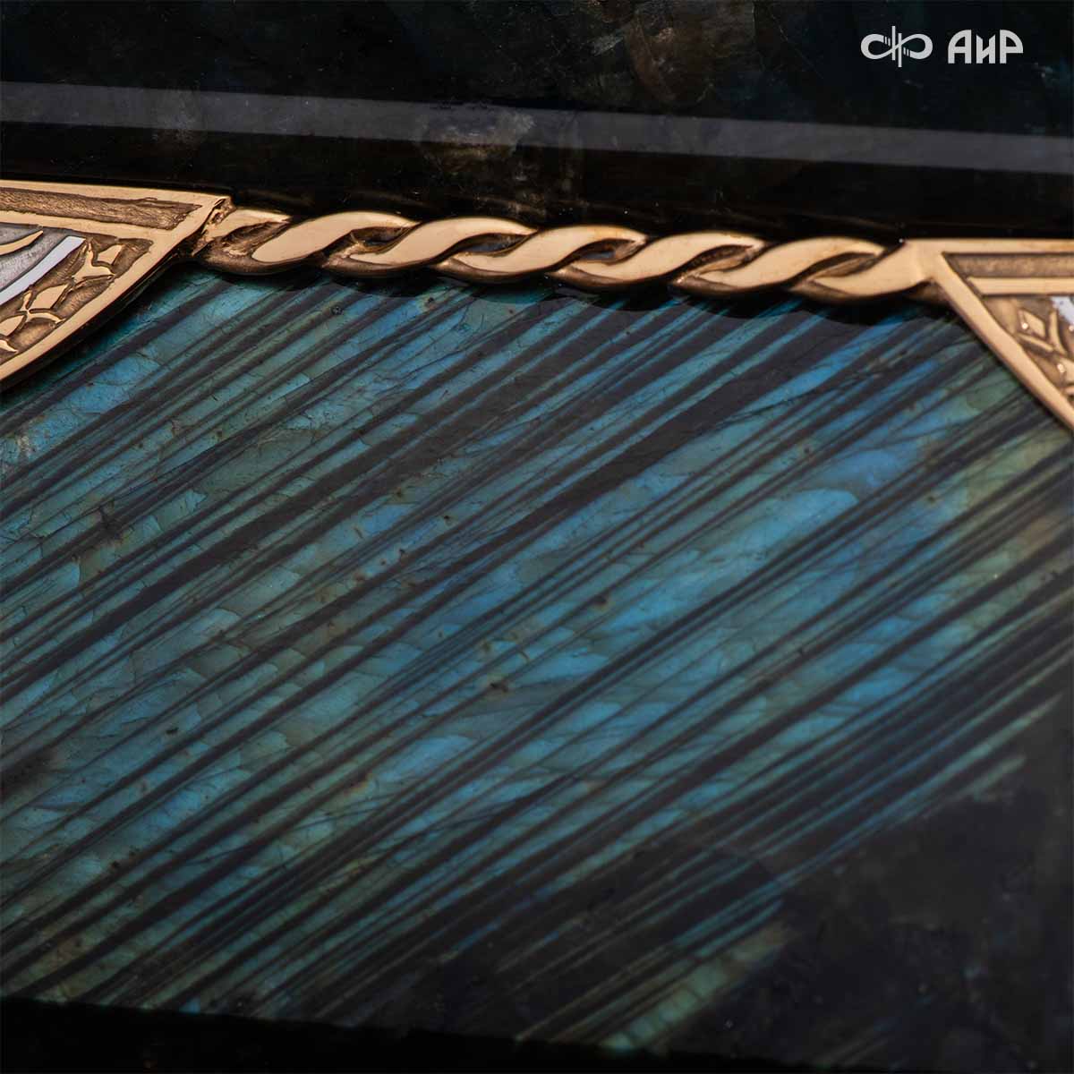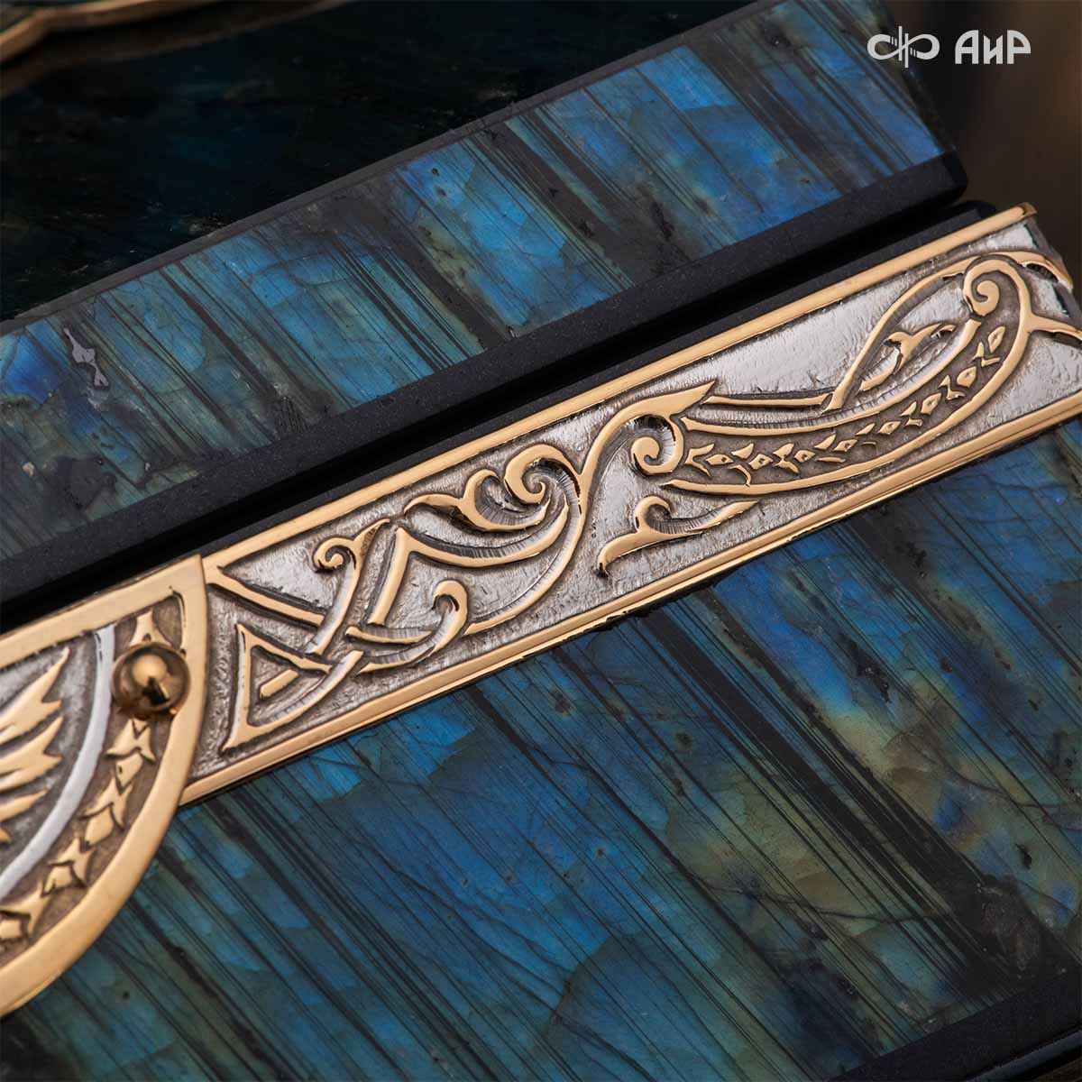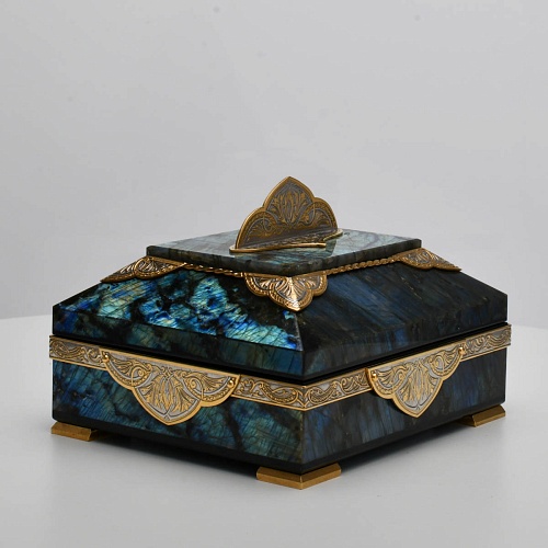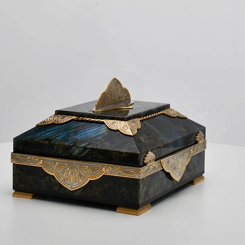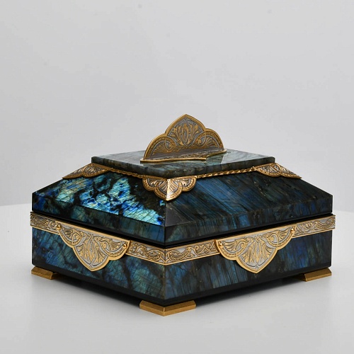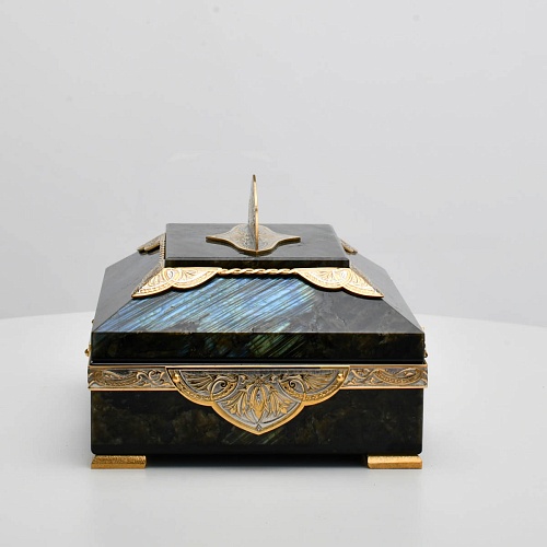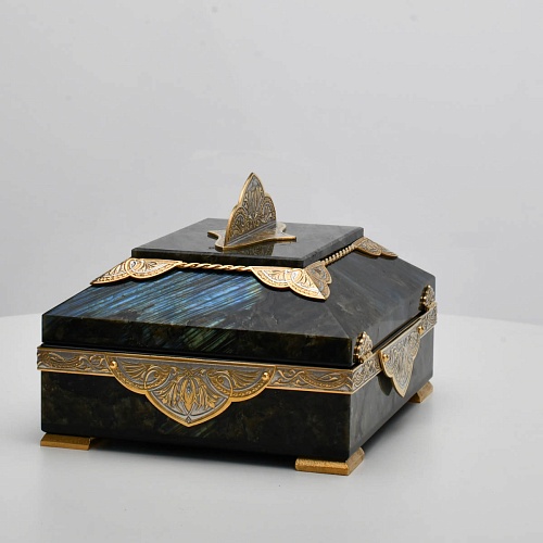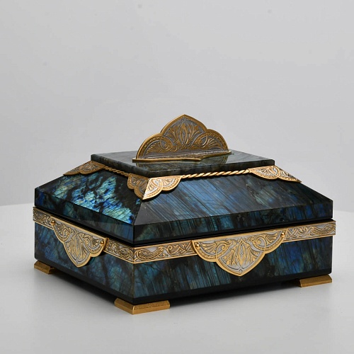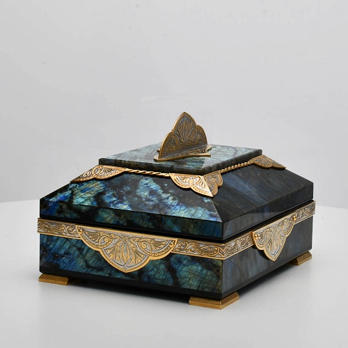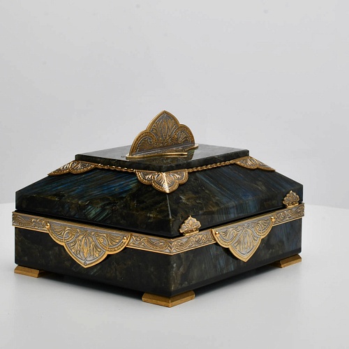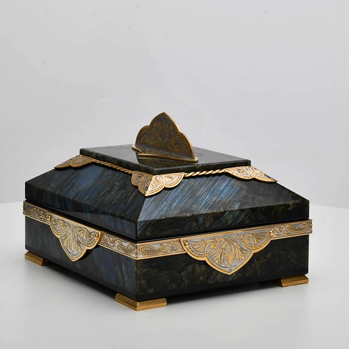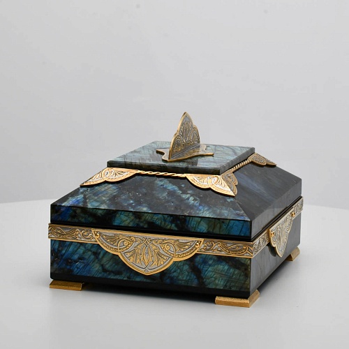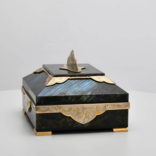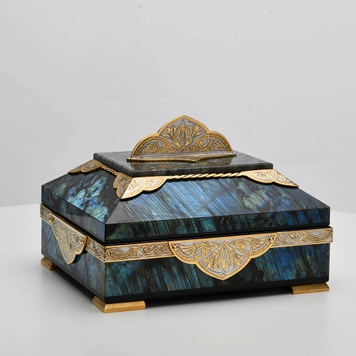 Шкатулка "Таинственная ночь" изготовлена из лабрадорита редкой красоты и украшена декоративными накладками с изображением цветочных орнаментов. Такая вещь, безусловно, украсит собой интерьер и станет изящным местом хранения для самых любимых и дорогих украшений.