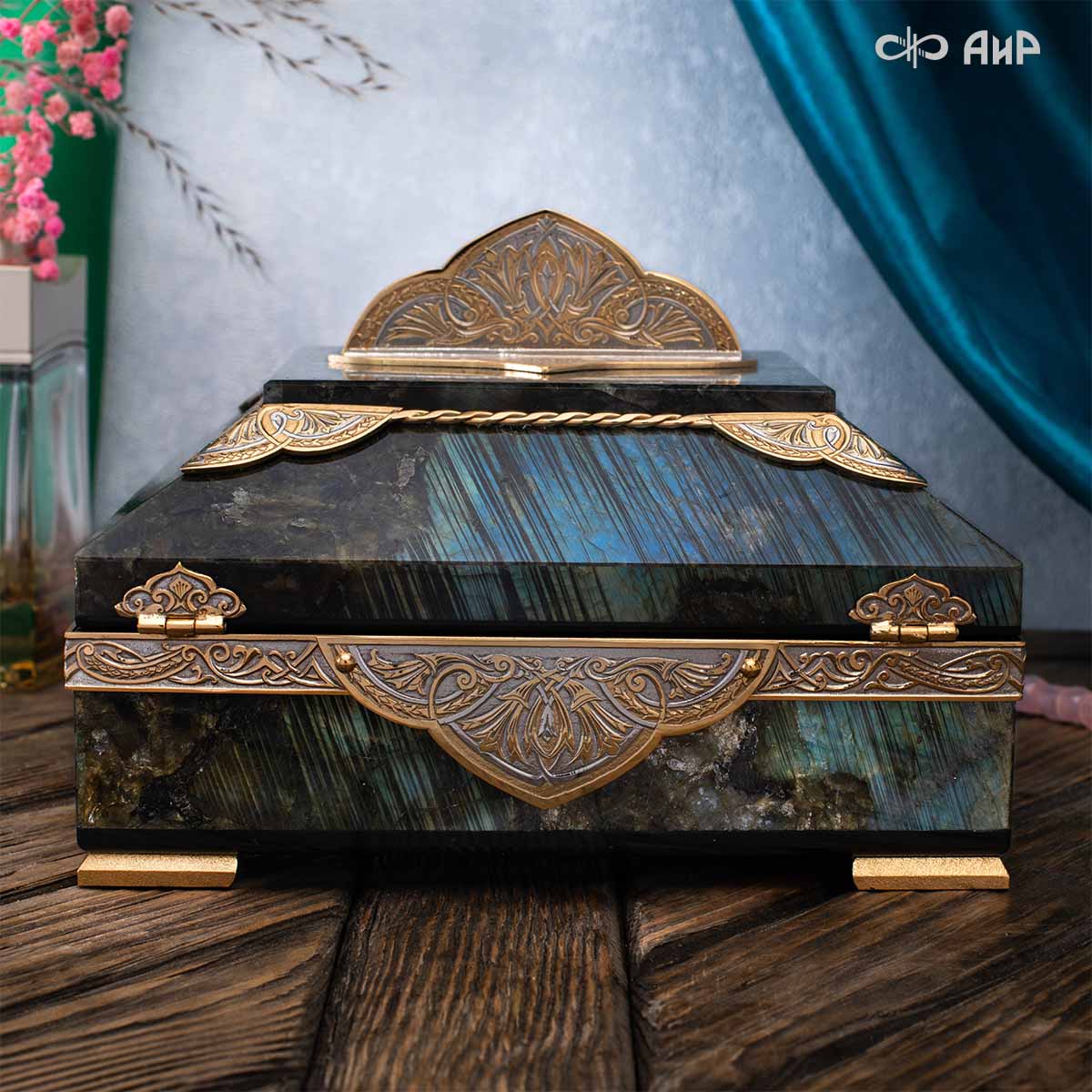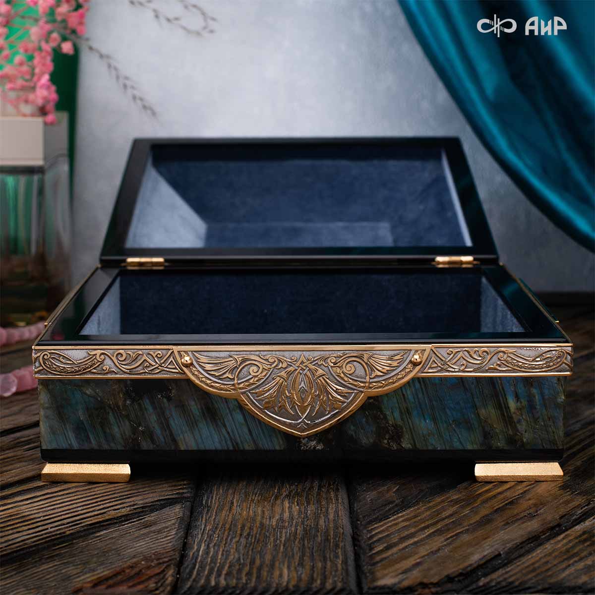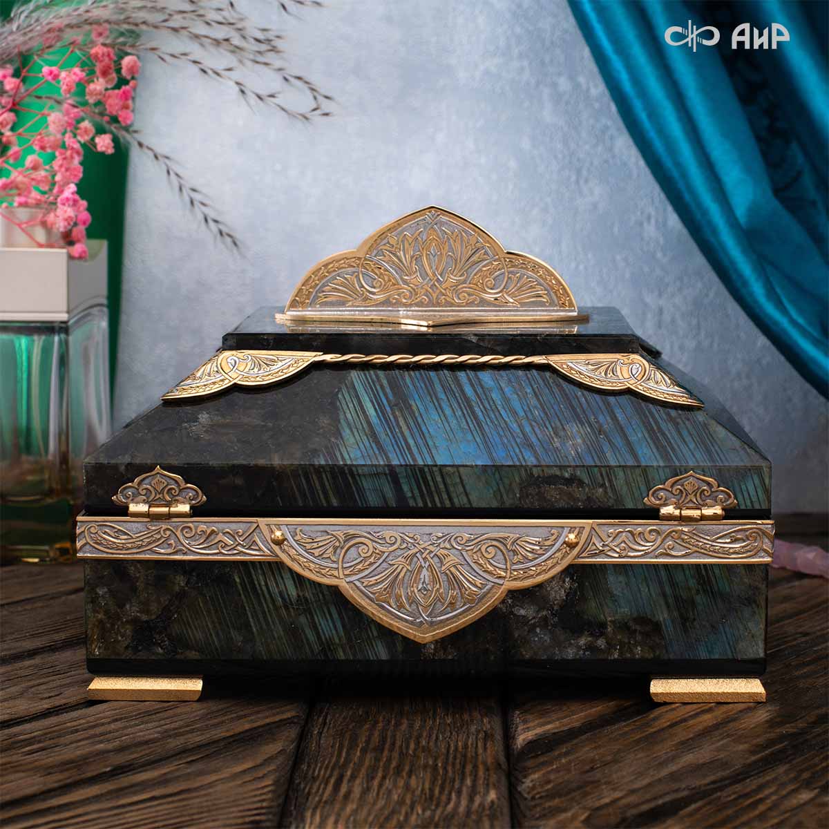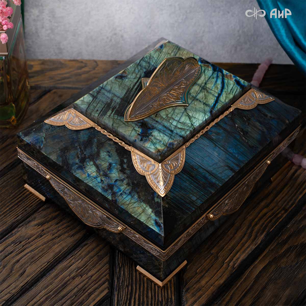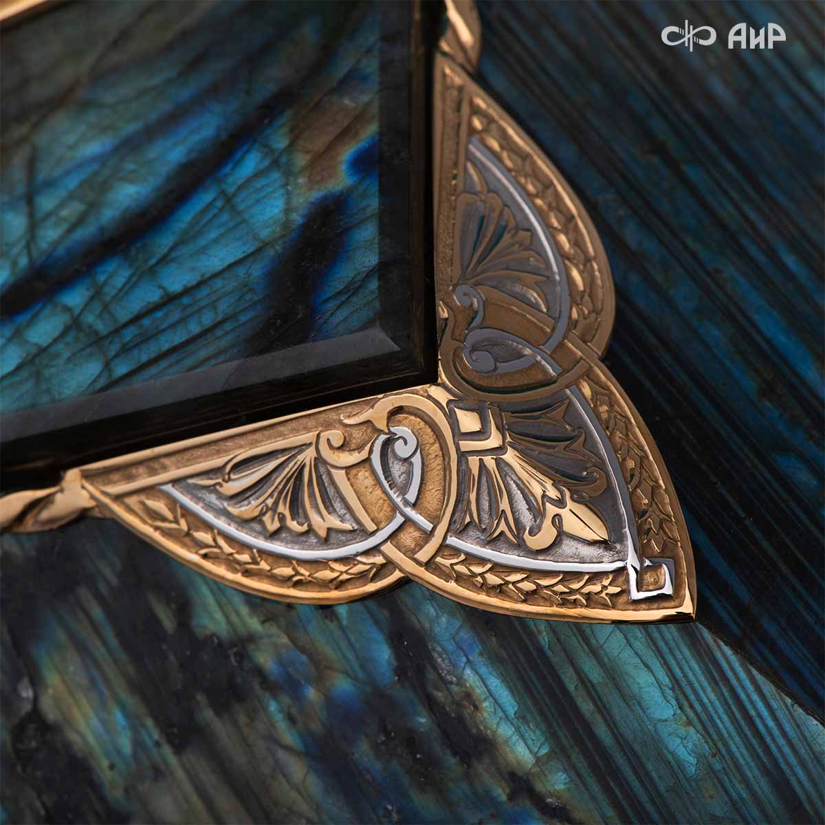 Шкатулка "Таинственная ночь" изготовлена из лабрадорита редкой красоты и украшена декоративными накладками с изображением цветочных орнаментов. Такая вещь, безусловно, украсит собой интерьер и станет изящным местом хранения для самых любимых и дорогих украшений.