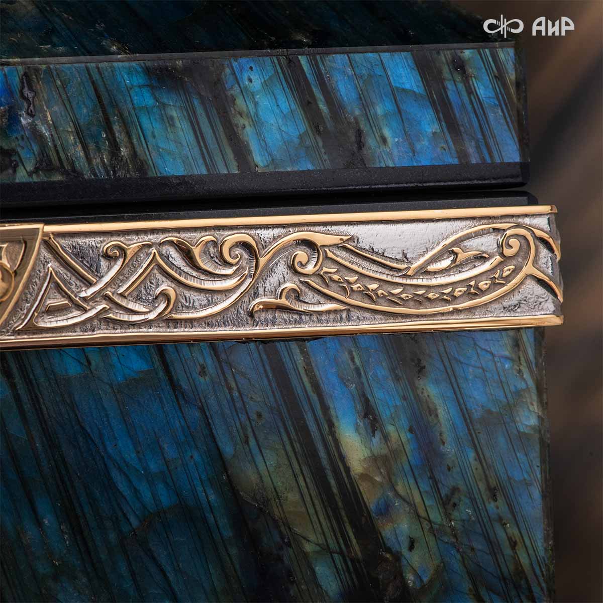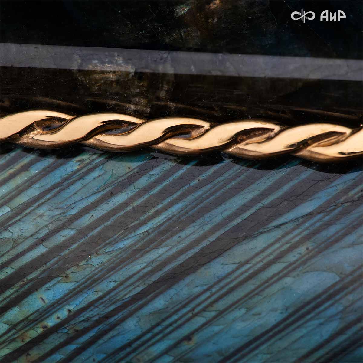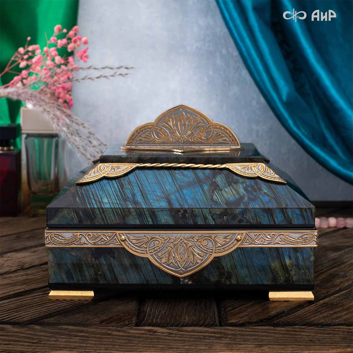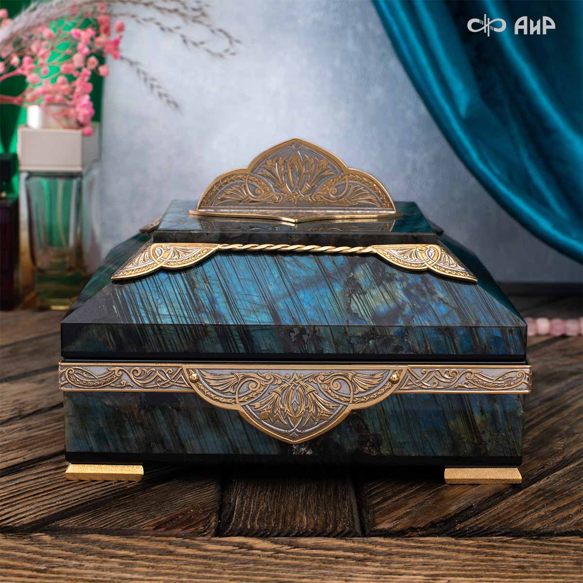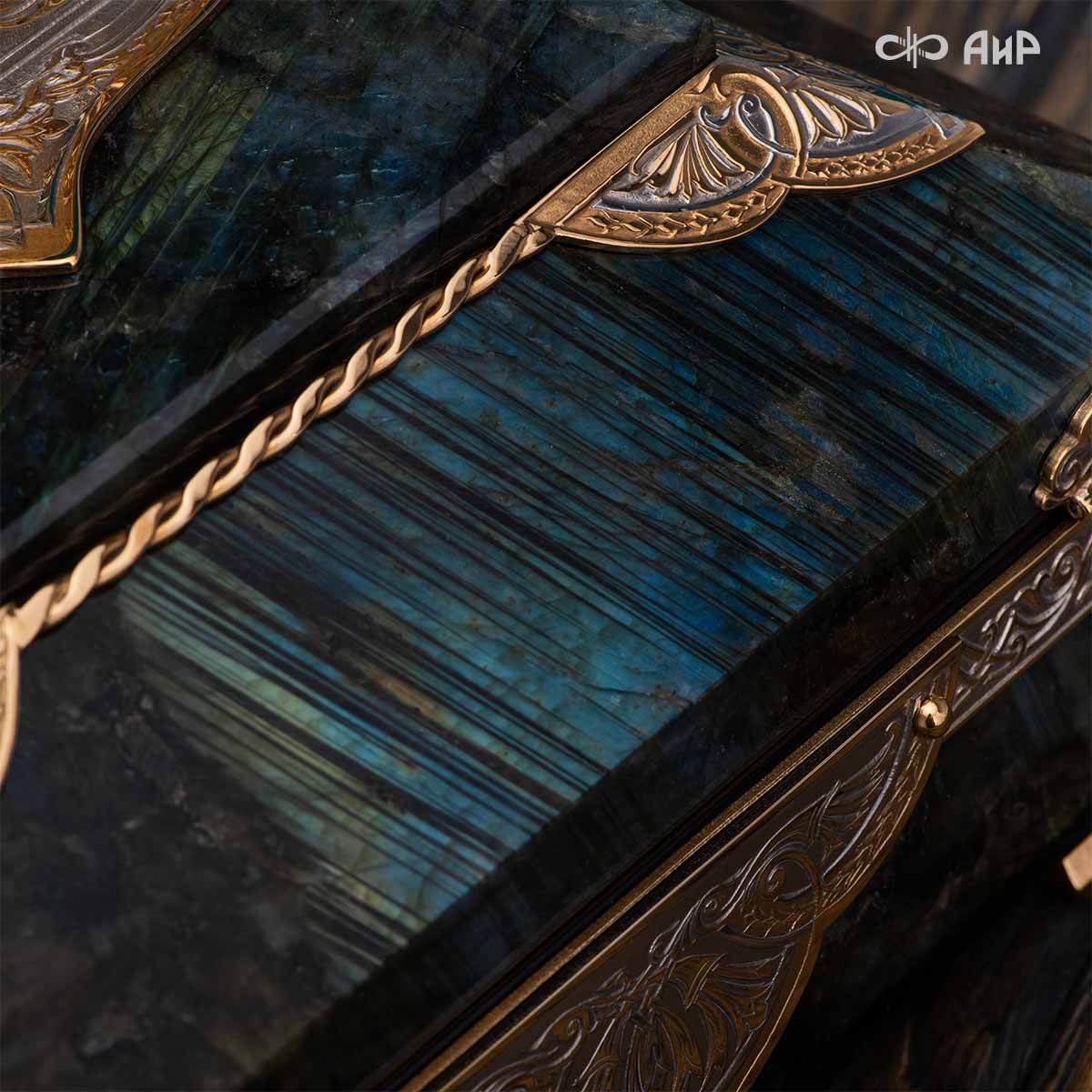 Шкатулка "Таинственная ночь" изготовлена из лабрадорита редкой красоты и украшена декоративными накладками с изображением цветочных орнаментов. Такая вещь, безусловно, украсит собой интерьер и станет изящным местом хранения для самых любимых и дорогих украшений.