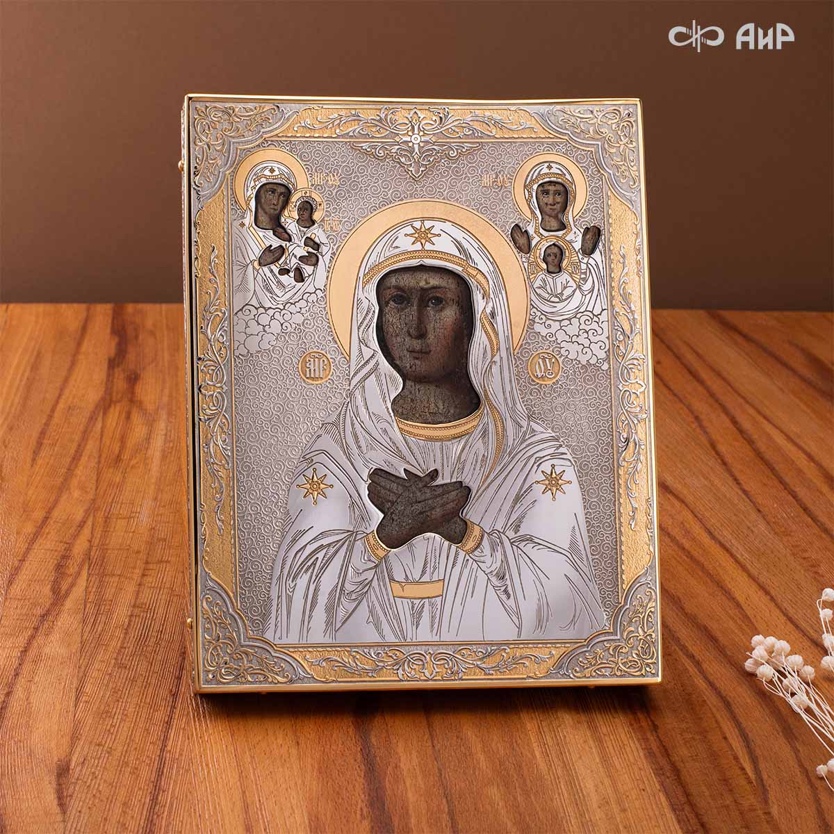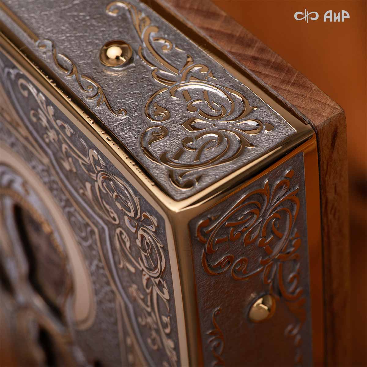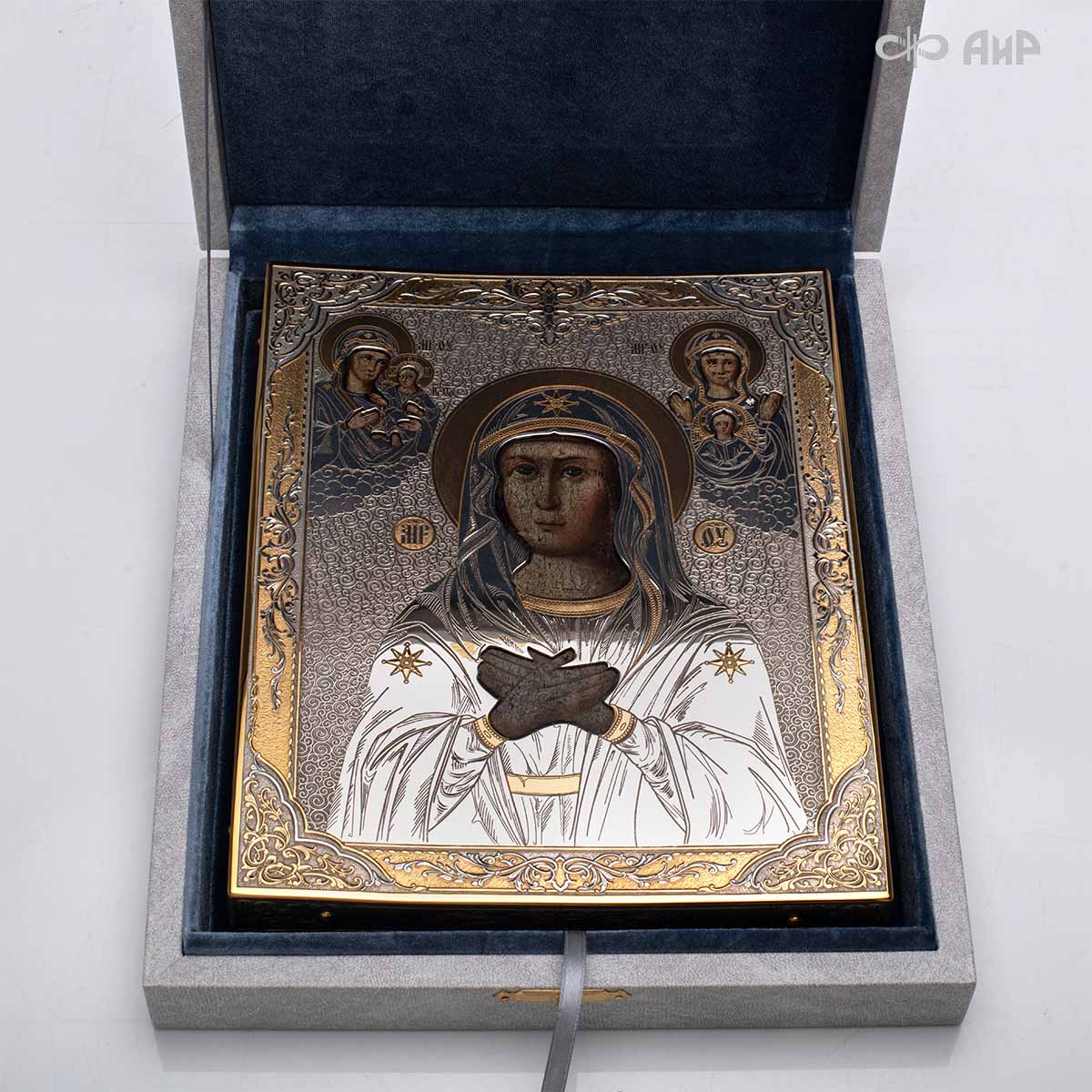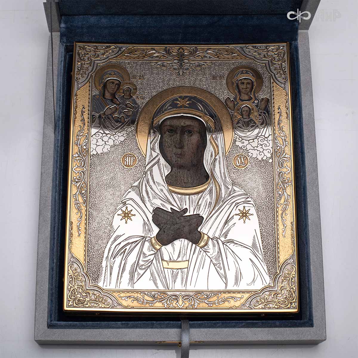 Современный оклад иконы Божьей Матери (икона заказчика, XIX век), выполненный мастерами компании “АиР”, является настоящим произведением искусства. Он изготовлен с использованием высочайших технологий и материалов, каждый его элемент выполнен с тщательной проработкой деталей, что делает икону настоящим произведением искусства. Златоуст известен своими уникальными традициями художественного ремесла, и этот оклад является ярким примером мастерства и преданности своему делу. Мастера “АиР” использовали уникальные технологии и традиционные приёмы художественной обработки металлов, чтобы создать этот шедевр. Оклад покрыт золотом высшей пробы (999,9°) толщиной в 1 микрон, что придает иконе особую ценность и благородство. Золото символизирует чистоту, вечность и божественное сияние. Золотой оклад не только подчеркивает духовное значение иконы, но и делает её ещё более величественной и торжественной, привлекая внимание верующих и ценителей искусства.