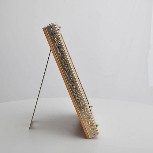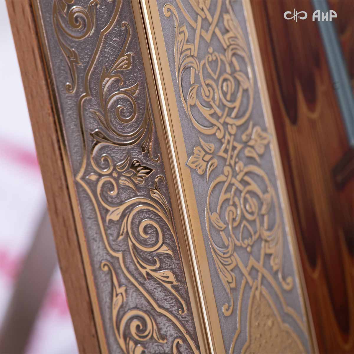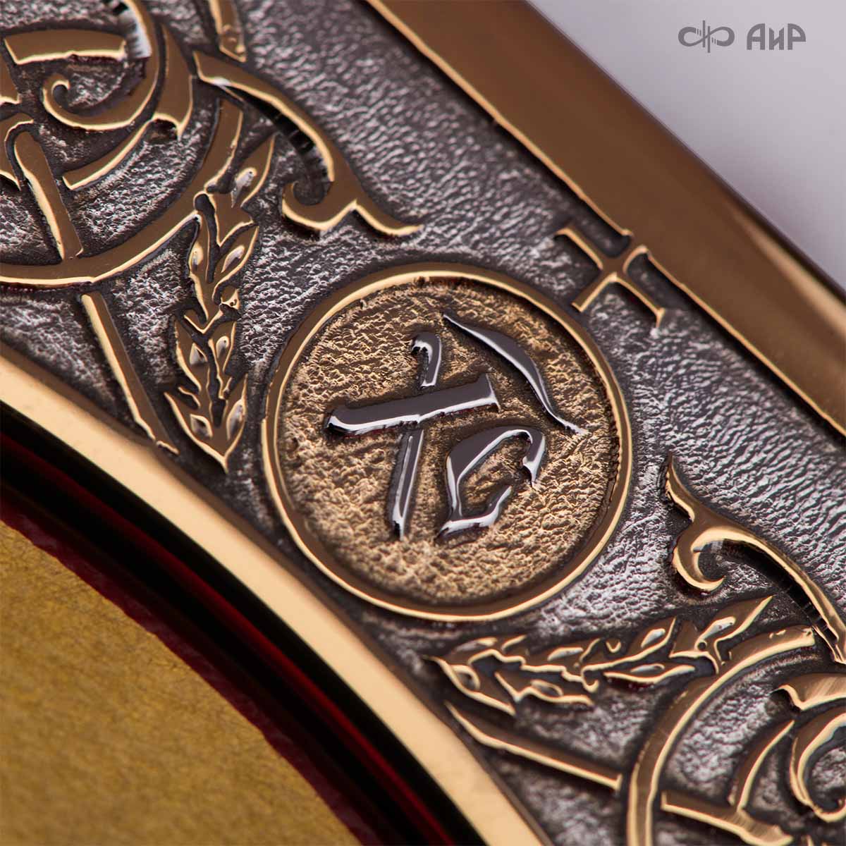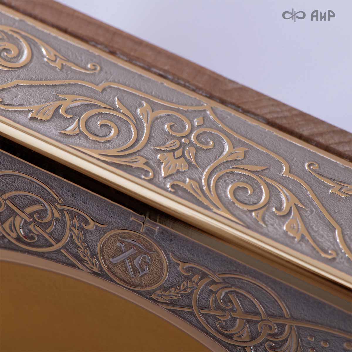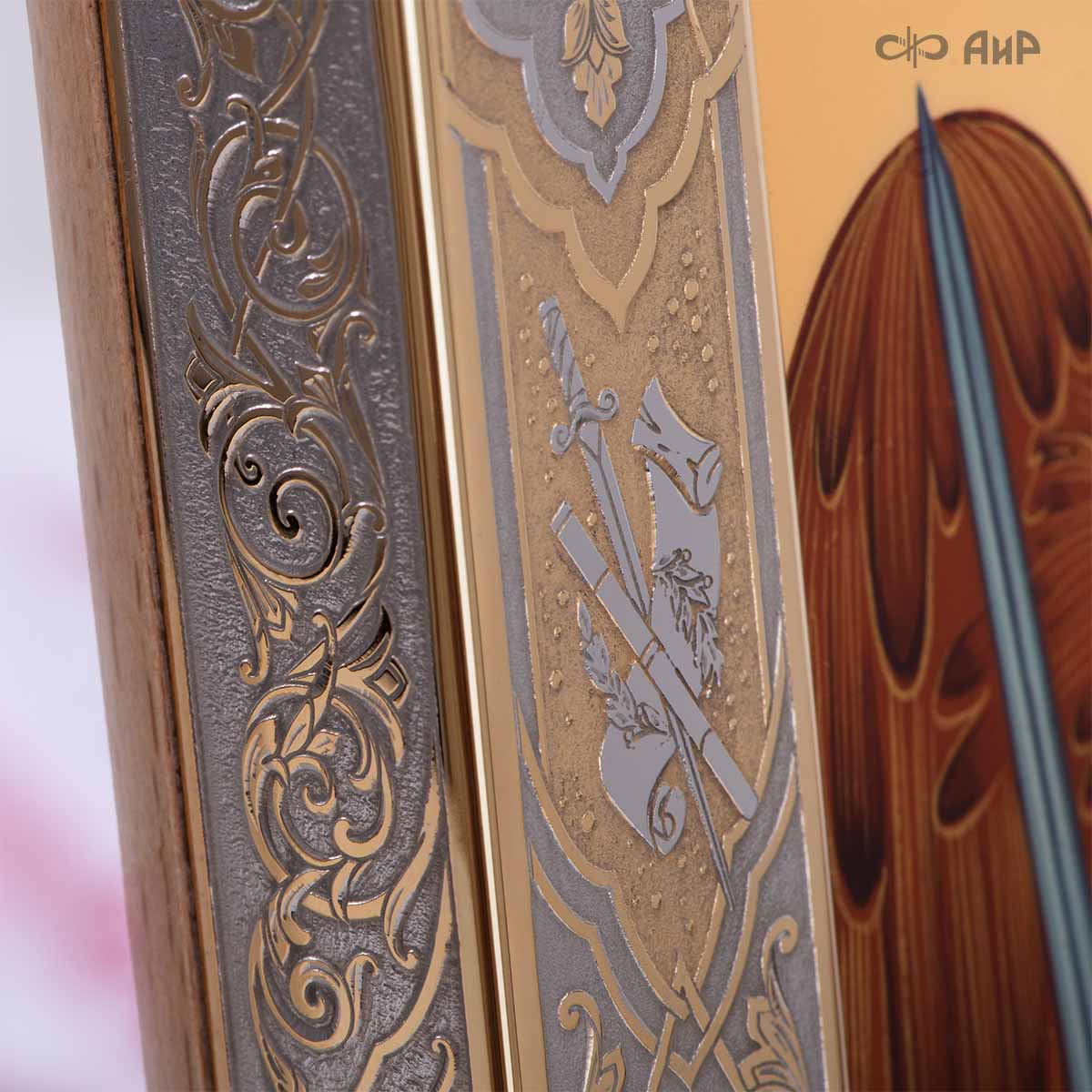 Оклад иконы «Архангел Михаил», выполненный мастерами компании «АиР» в г. Златоуст, придает ей особую ценность и торжественность. Оклад покрыт золотом высшей пробы (999,9°) толщиной в 1 микрон, что подчеркивает высокое мастерство и искусство создателей. Золотое покрытие не только украшает икону, но и символизирует вечность и непреходящую ценность духовного наследия. Оно защищает икону от внешних воздействий и придает ей дополнительное сияние, усиливая впечатление от образа святого. Такой оклад делает икону не только объектом религиозного почитания, но и произведением искусства, достойным восхищения и уважения.