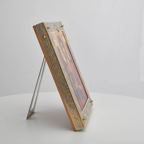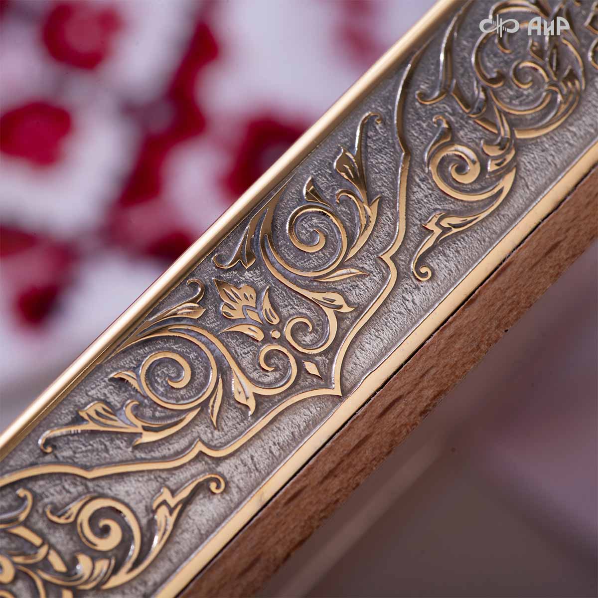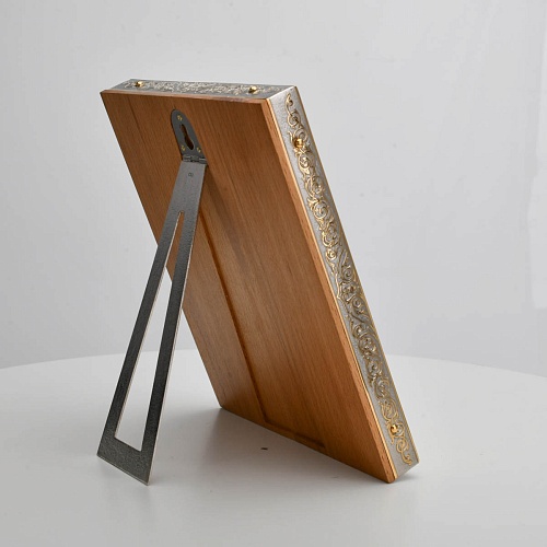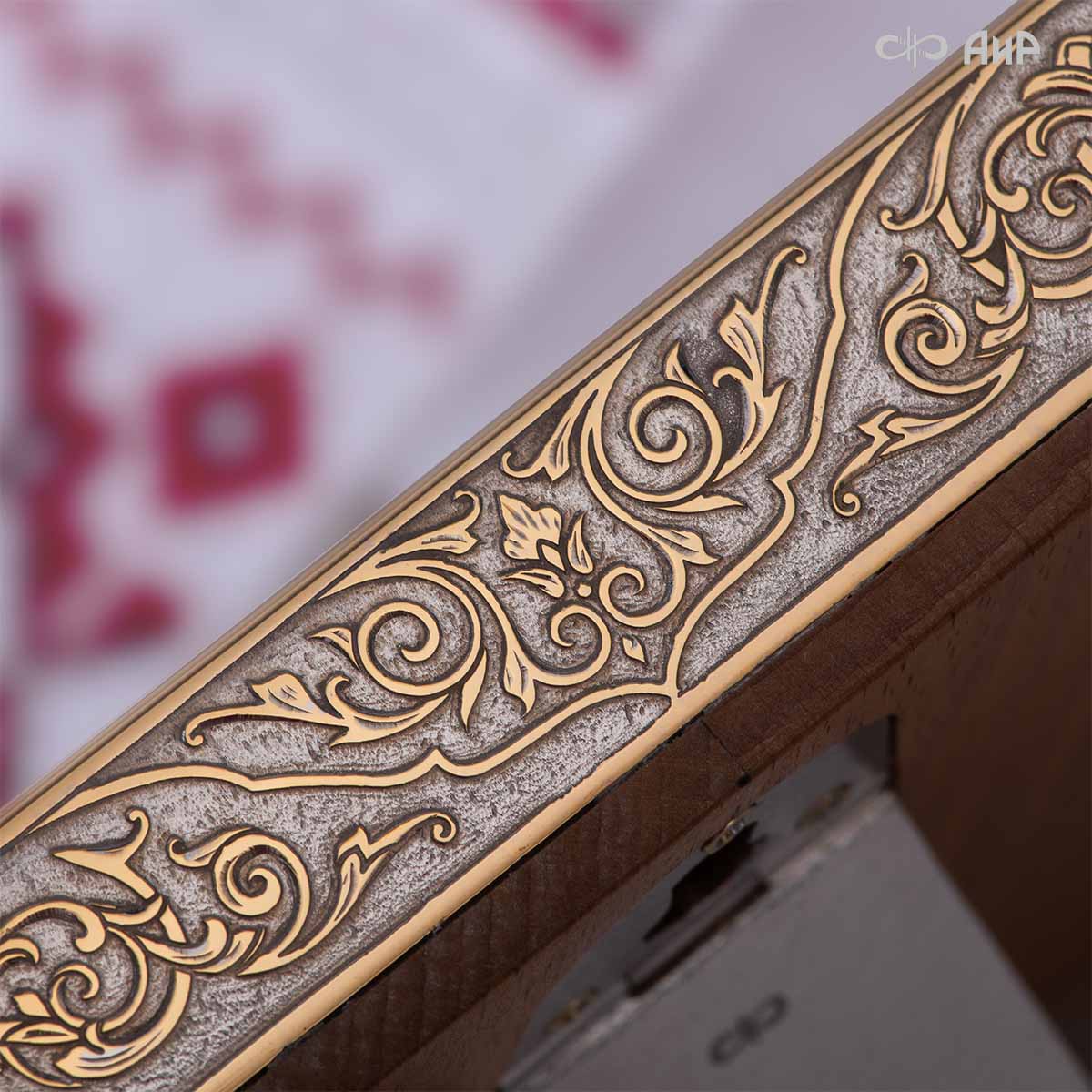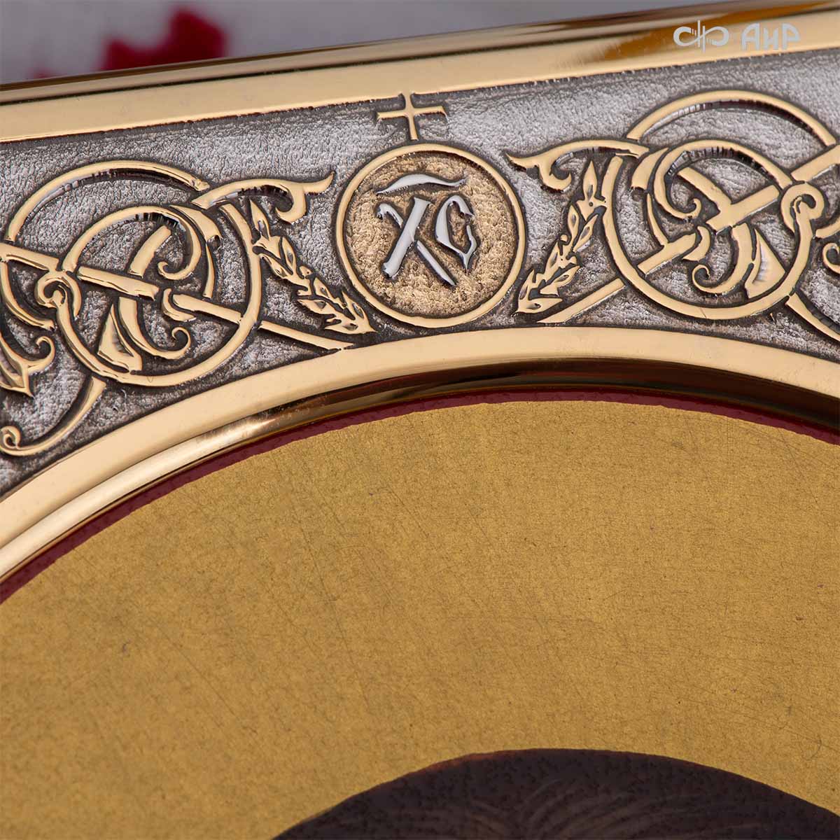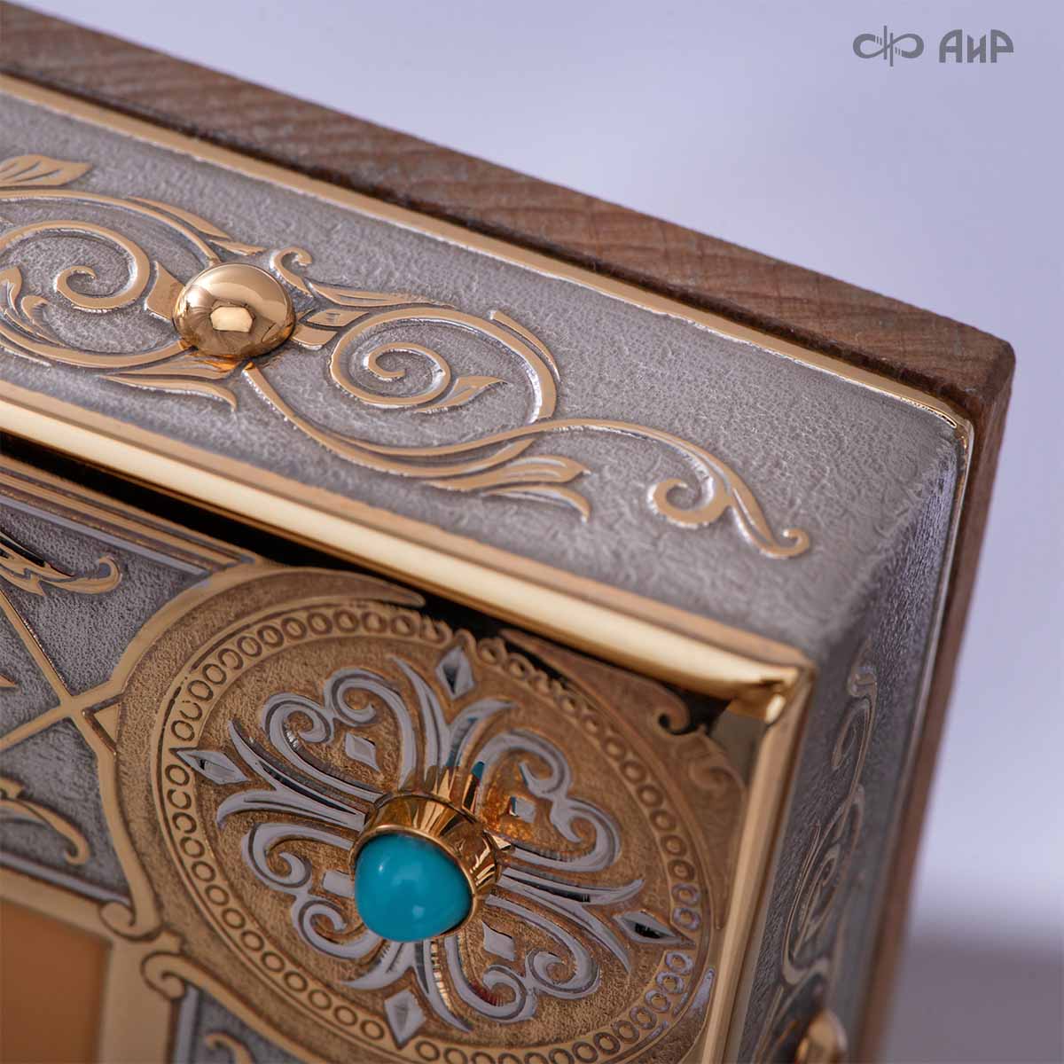 Оклад иконы «Архангел Михаил», выполненный мастерами компании «АиР» в г. Златоуст, придает ей особую ценность и торжественность. Оклад покрыт золотом высшей пробы (999,9°) толщиной в 1 микрон, что подчеркивает высокое мастерство и искусство создателей. Золотое покрытие не только украшает икону, но и символизирует вечность и непреходящую ценность духовного наследия. Оно защищает икону от внешних воздействий и придает ей дополнительное сияние, усиливая впечатление от образа святого. Такой оклад делает икону не только объектом религиозного почитания, но и произведением искусства, достойным восхищения и уважения.