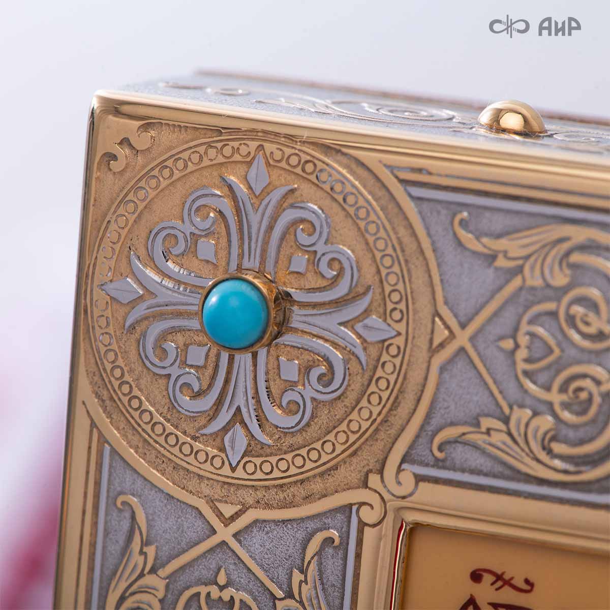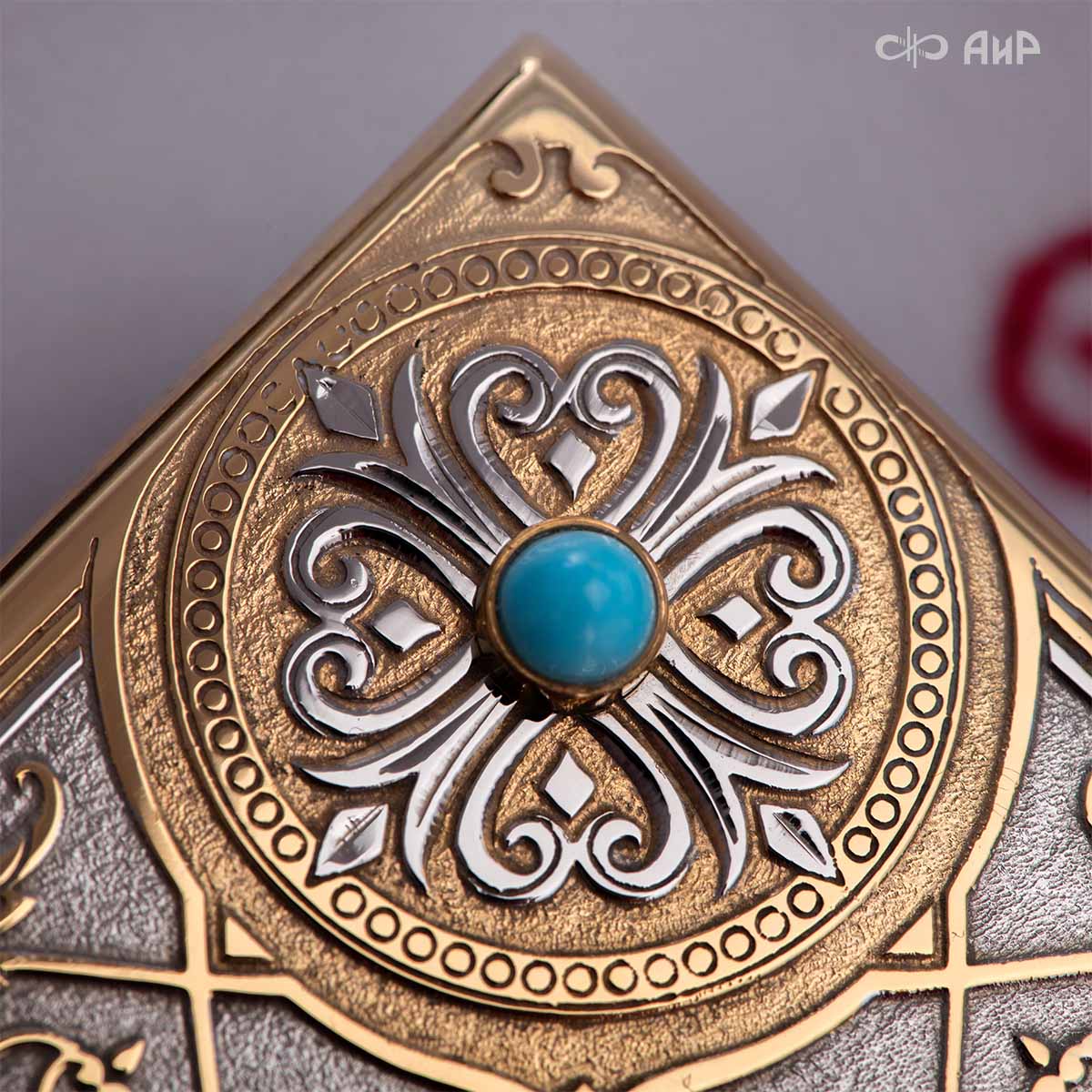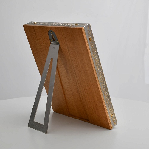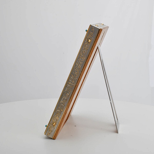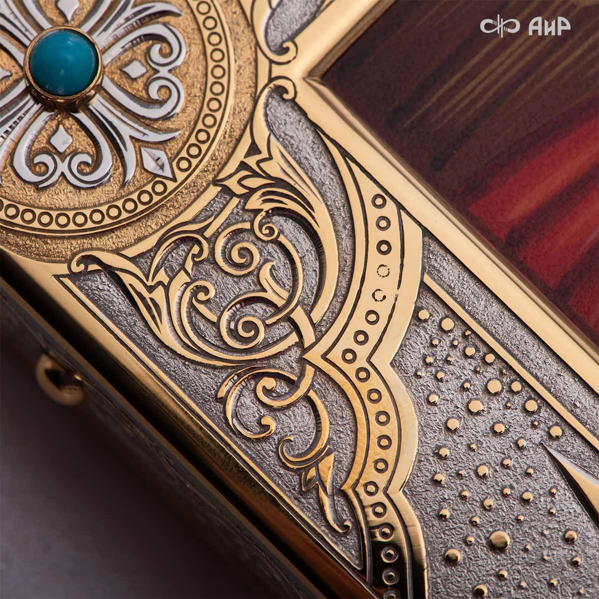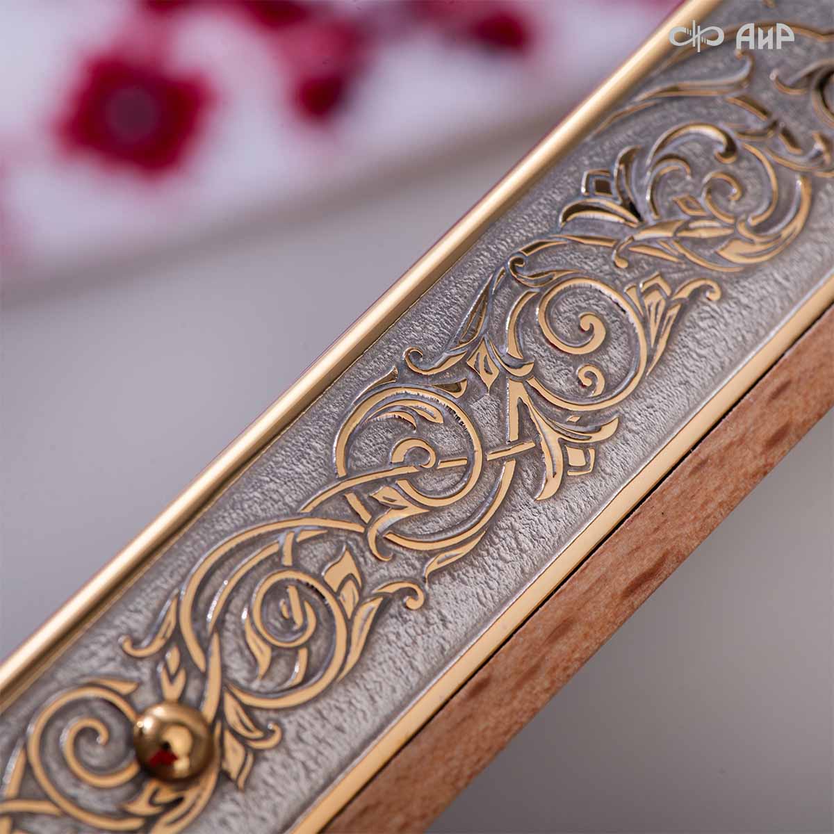 Оклад иконы «Архангел Михаил», выполненный мастерами компании «АиР» в г. Златоуст, придает ей особую ценность и торжественность. Оклад покрыт золотом высшей пробы (999,9°) толщиной в 1 микрон, что подчеркивает высокое мастерство и искусство создателей. Золотое покрытие не только украшает икону, но и символизирует вечность и непреходящую ценность духовного наследия. Оно защищает икону от внешних воздействий и придает ей дополнительное сияние, усиливая впечатление от образа святого. Такой оклад делает икону не только объектом религиозного почитания, но и произведением искусства, достойным восхищения и уважения.