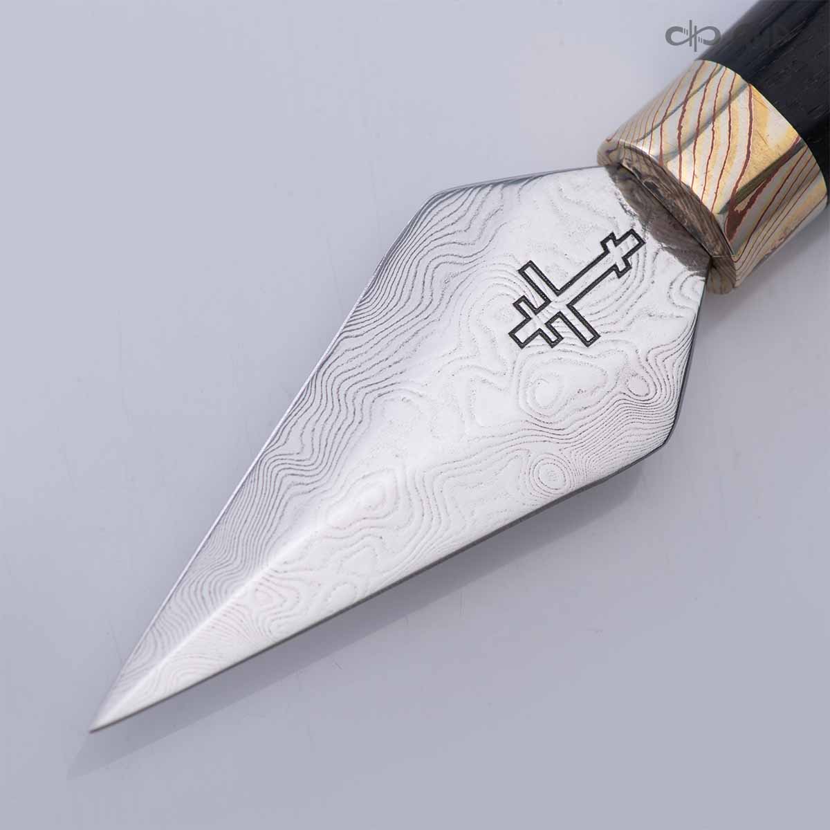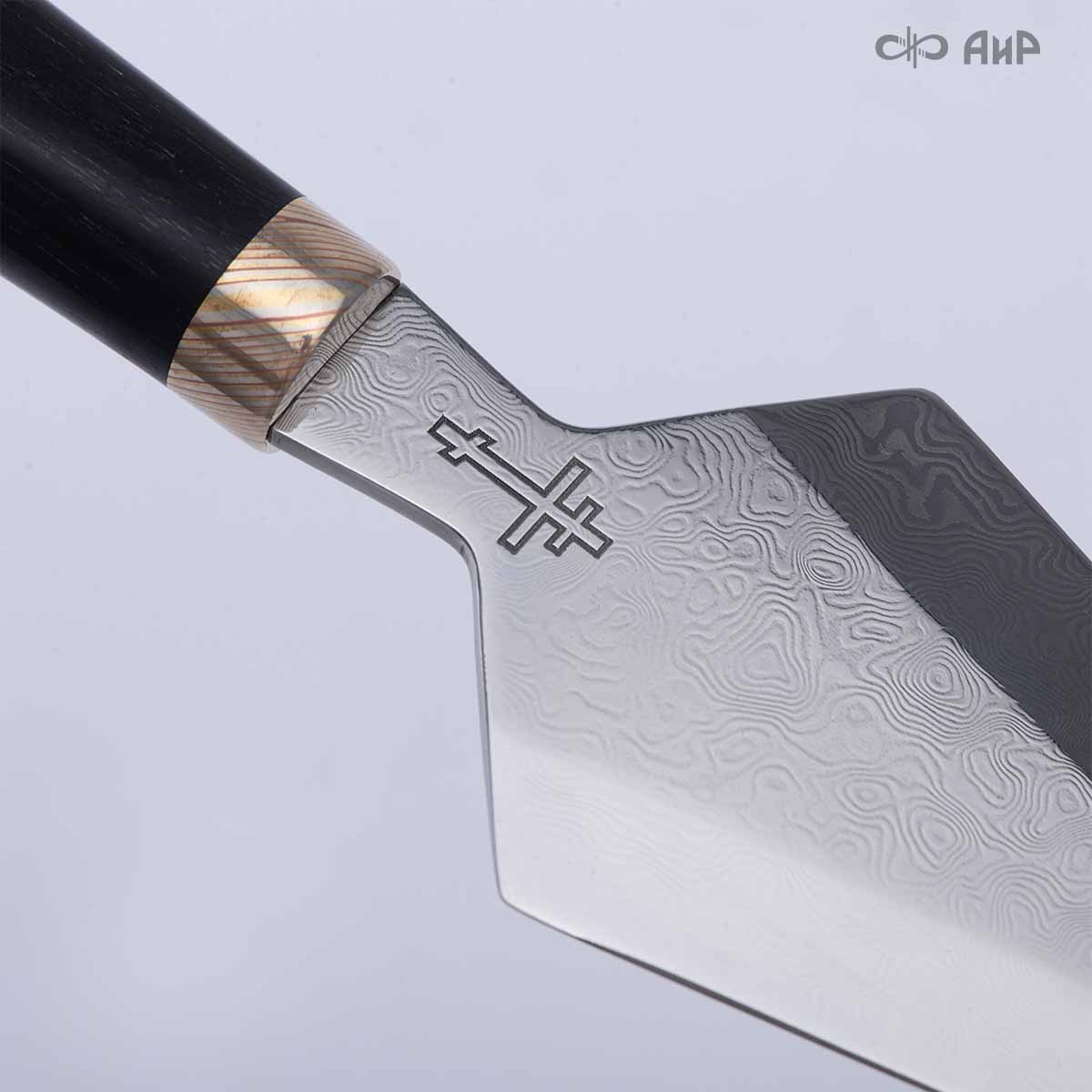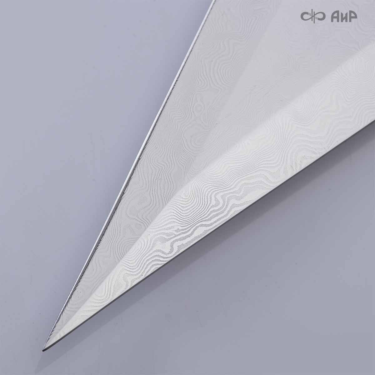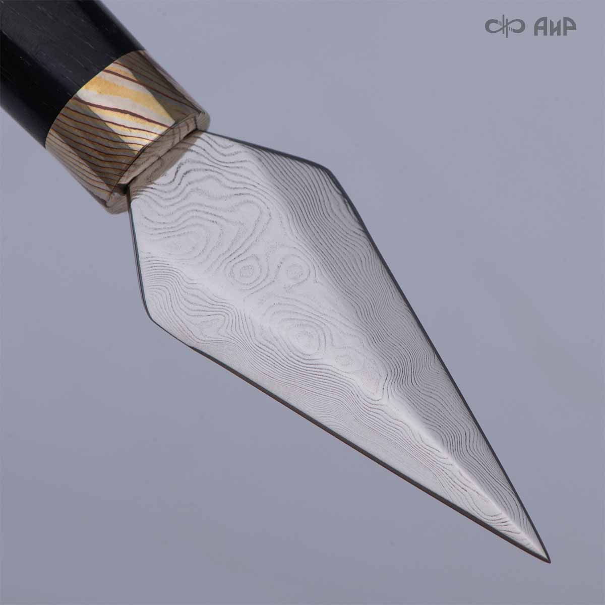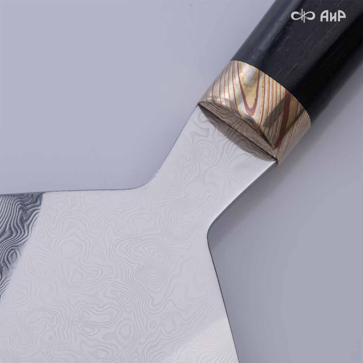 Рукоять - стабилизированный граб, гарда - мокуме гане, клинок - дамасская сталь ZDI-1016. Ручная работа.