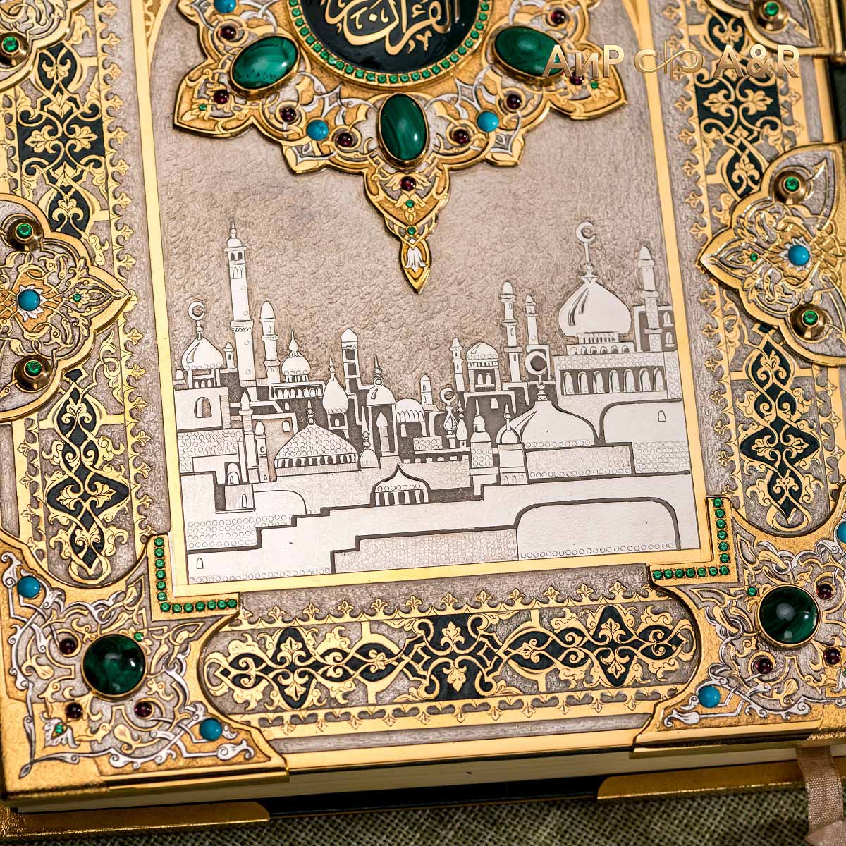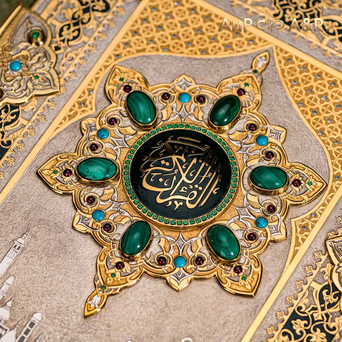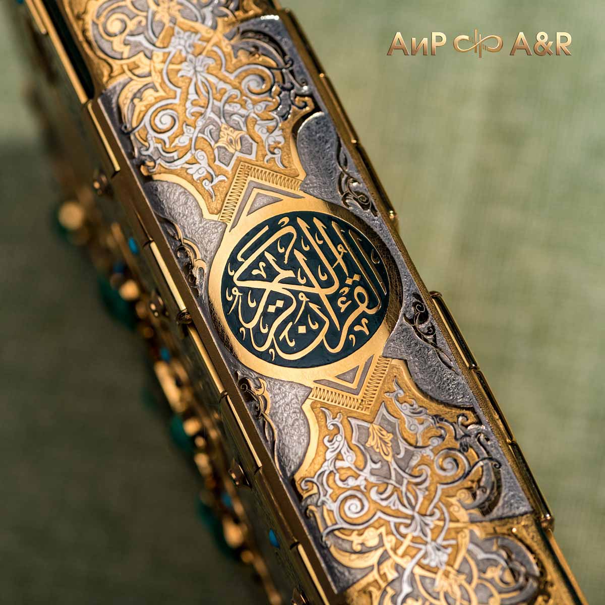 Оклад для Корана - священной книги мусульман, изготовлен в стиле златоустовской гравюры на металле, покрыт золотом высшей пробы. Узор на лицевой и оборотной сторонах оклада выполнен в восточных мотивах с арабской вязью.