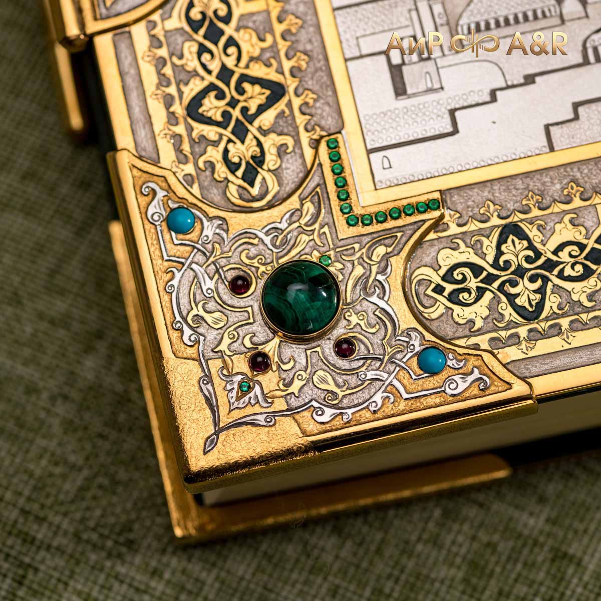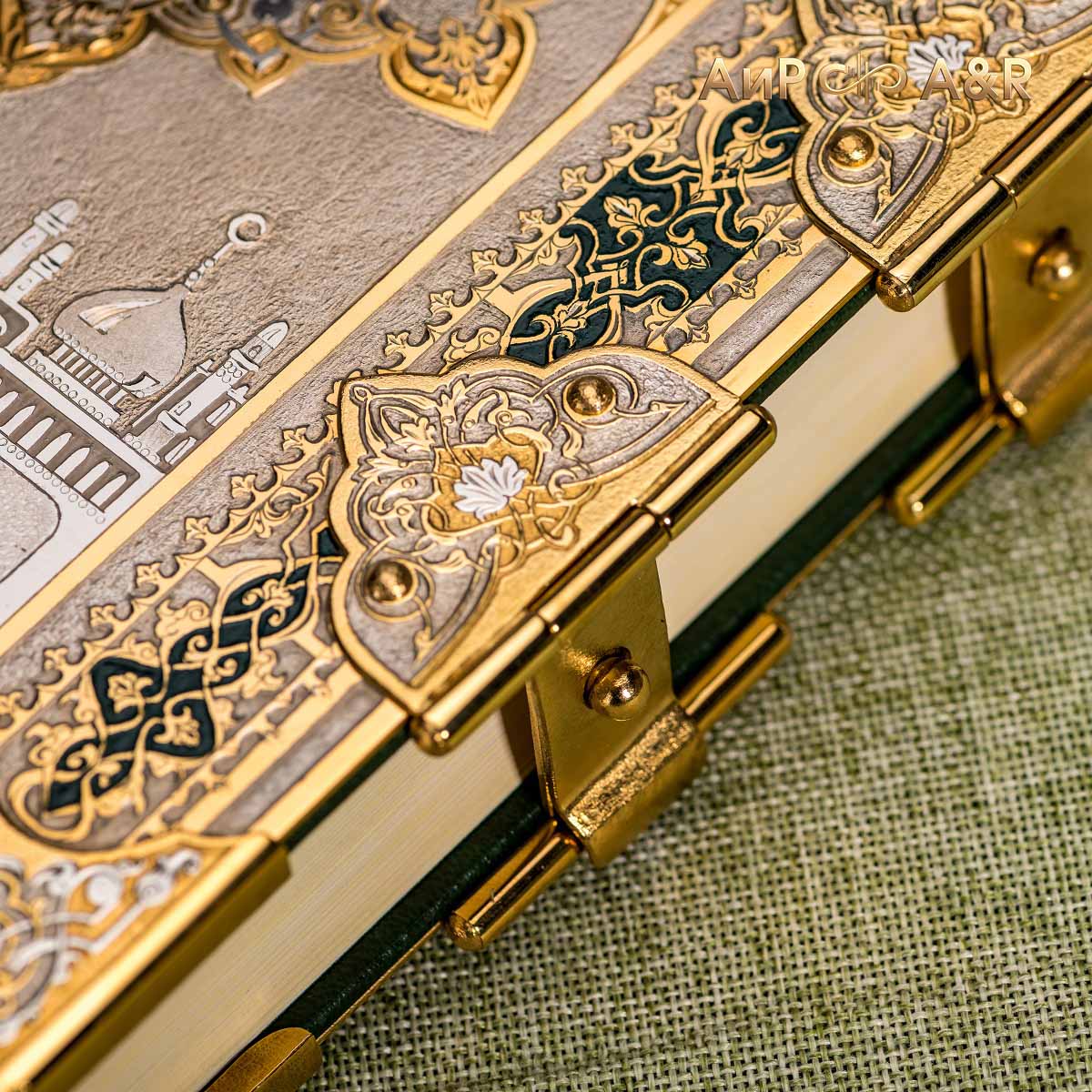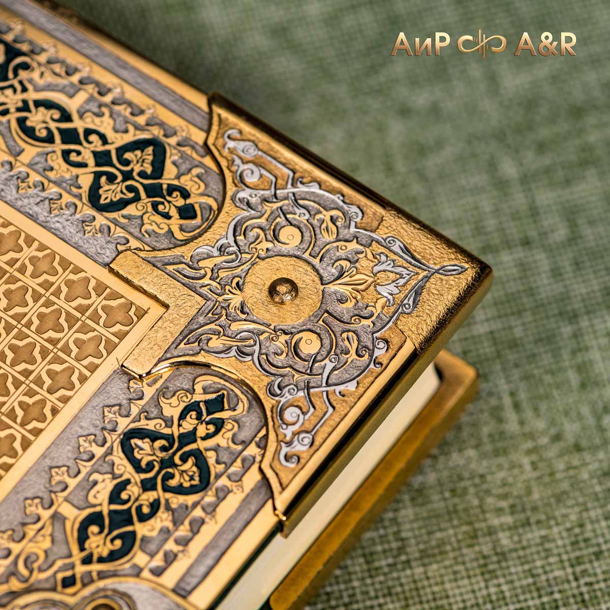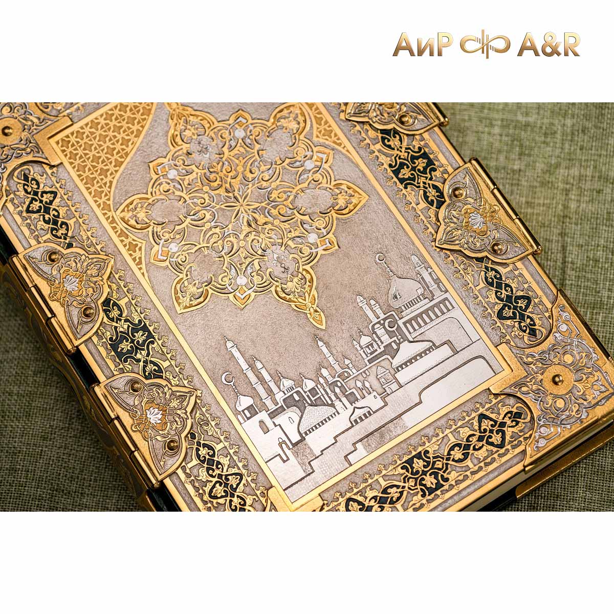Оклад для Корана - священной книги мусульман, изготовлен в стиле златоустовской гравюры на металле, покрыт золотом высшей пробы. Узор на лицевой и оборотной сторонах оклада выполнен в восточных мотивах с арабской вязью.