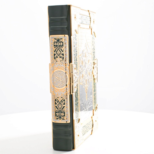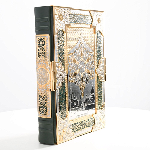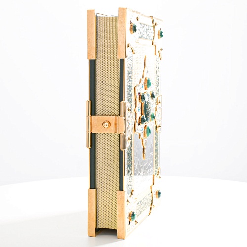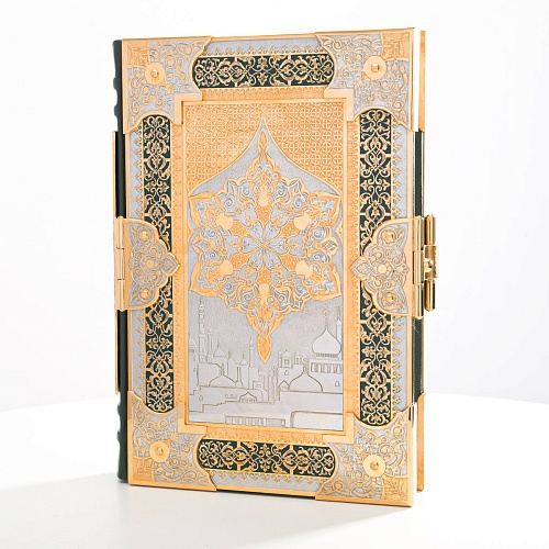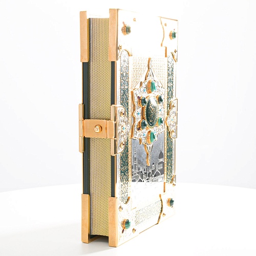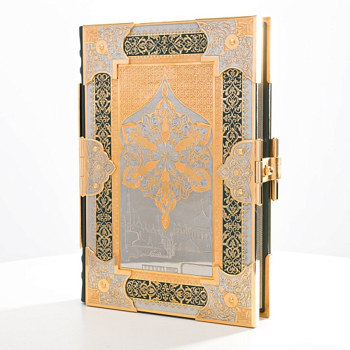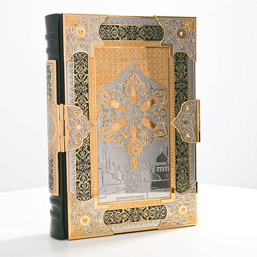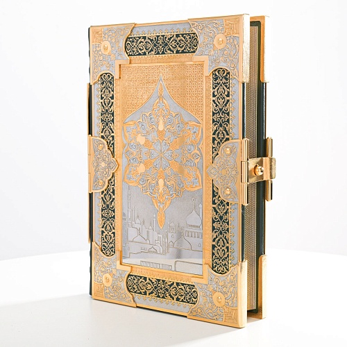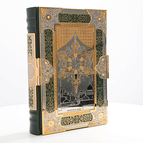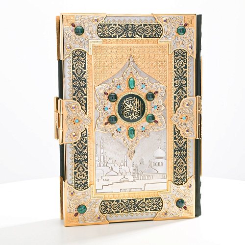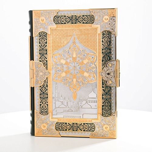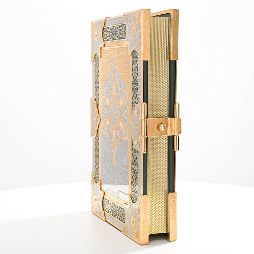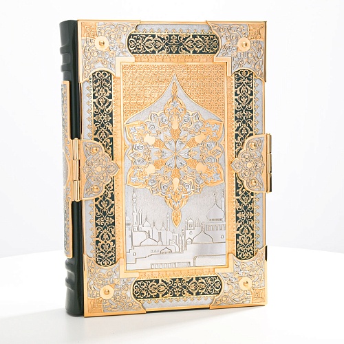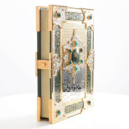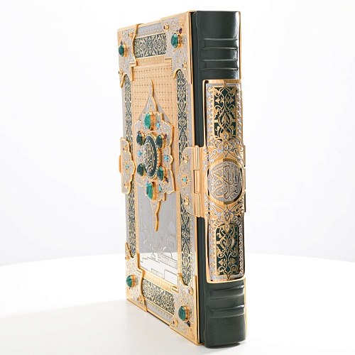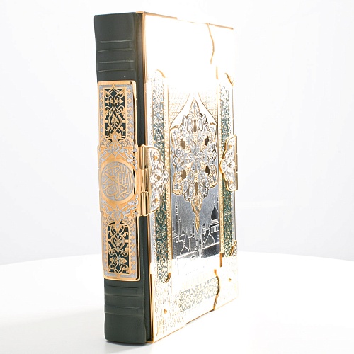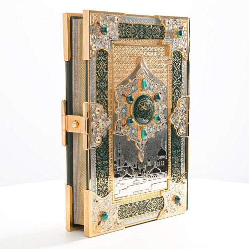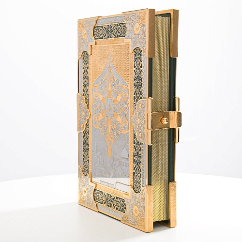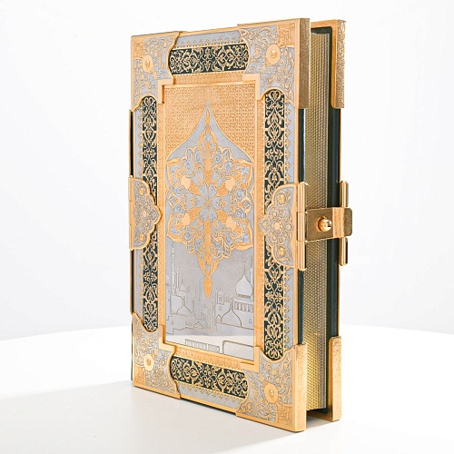 Оклад для Корана - священной книги мусульман, изготовлен в стиле златоустовской гравюры на металле, покрыт золотом высшей пробы. Узор на лицевой и оборотной сторонах оклада выполнен в восточных мотивах с арабской вязью.