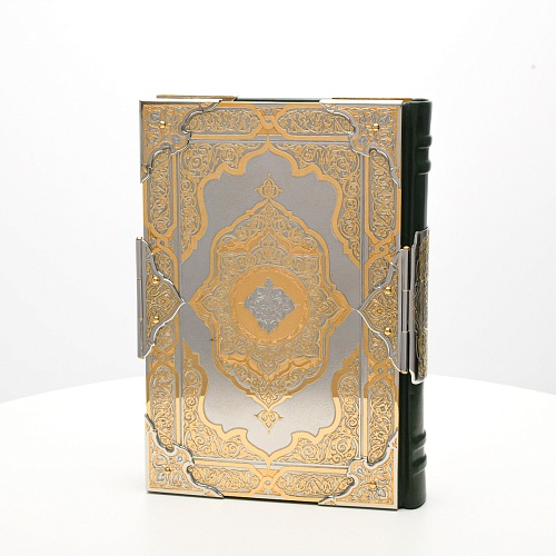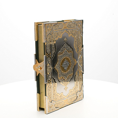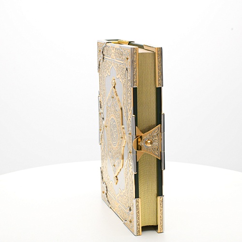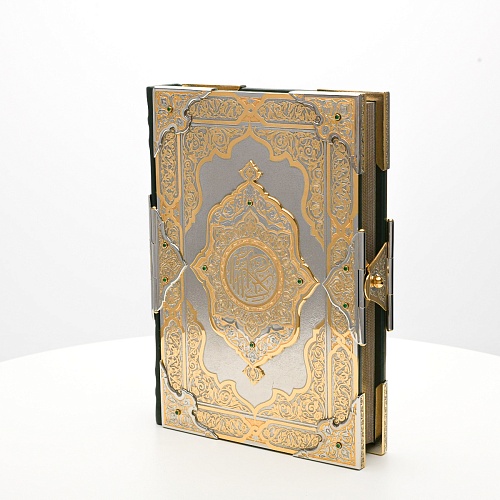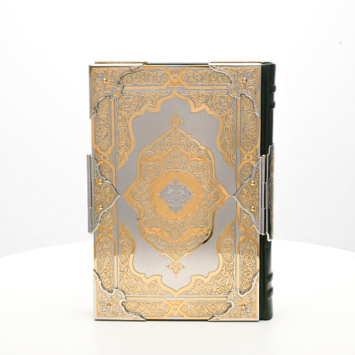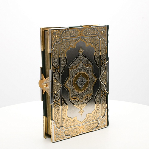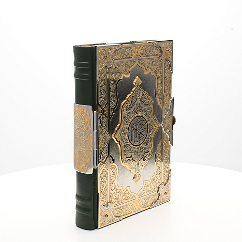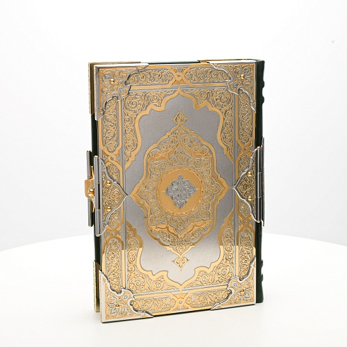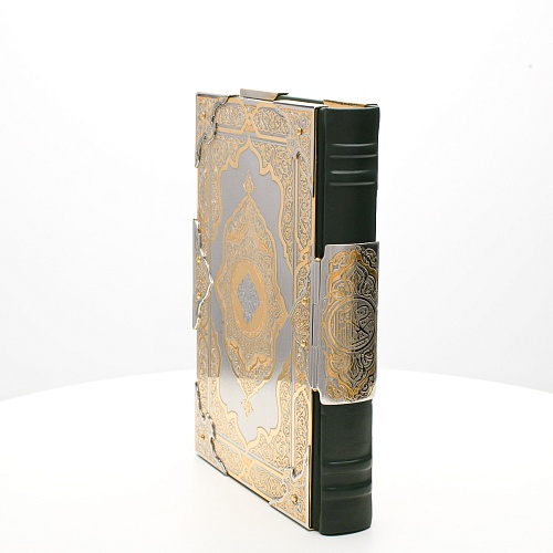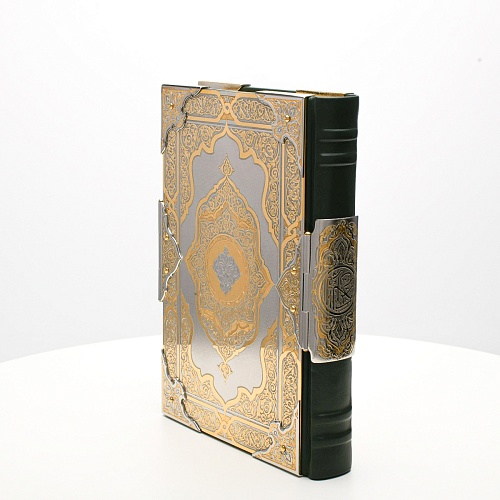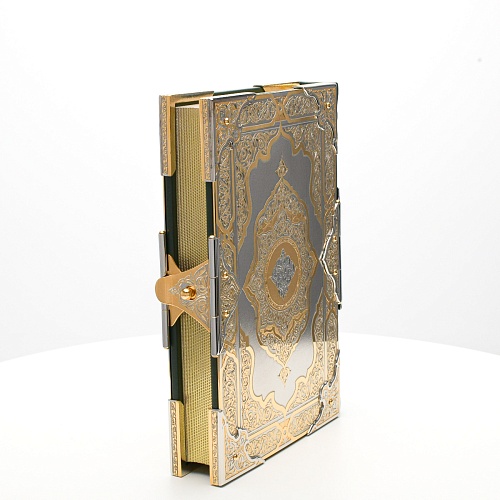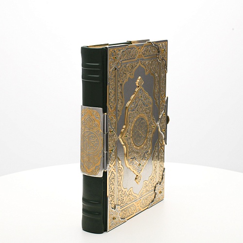Оклад для Корана - священной книги мусульман, изготовлен в стиле златоустовской гравюры на металле, покрыт золотом высшей пробы. Узор на лицевой и оборотной сторонах оклада выполнен в восточных мотивах с арабской вязью.