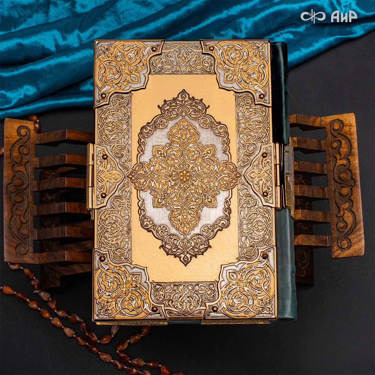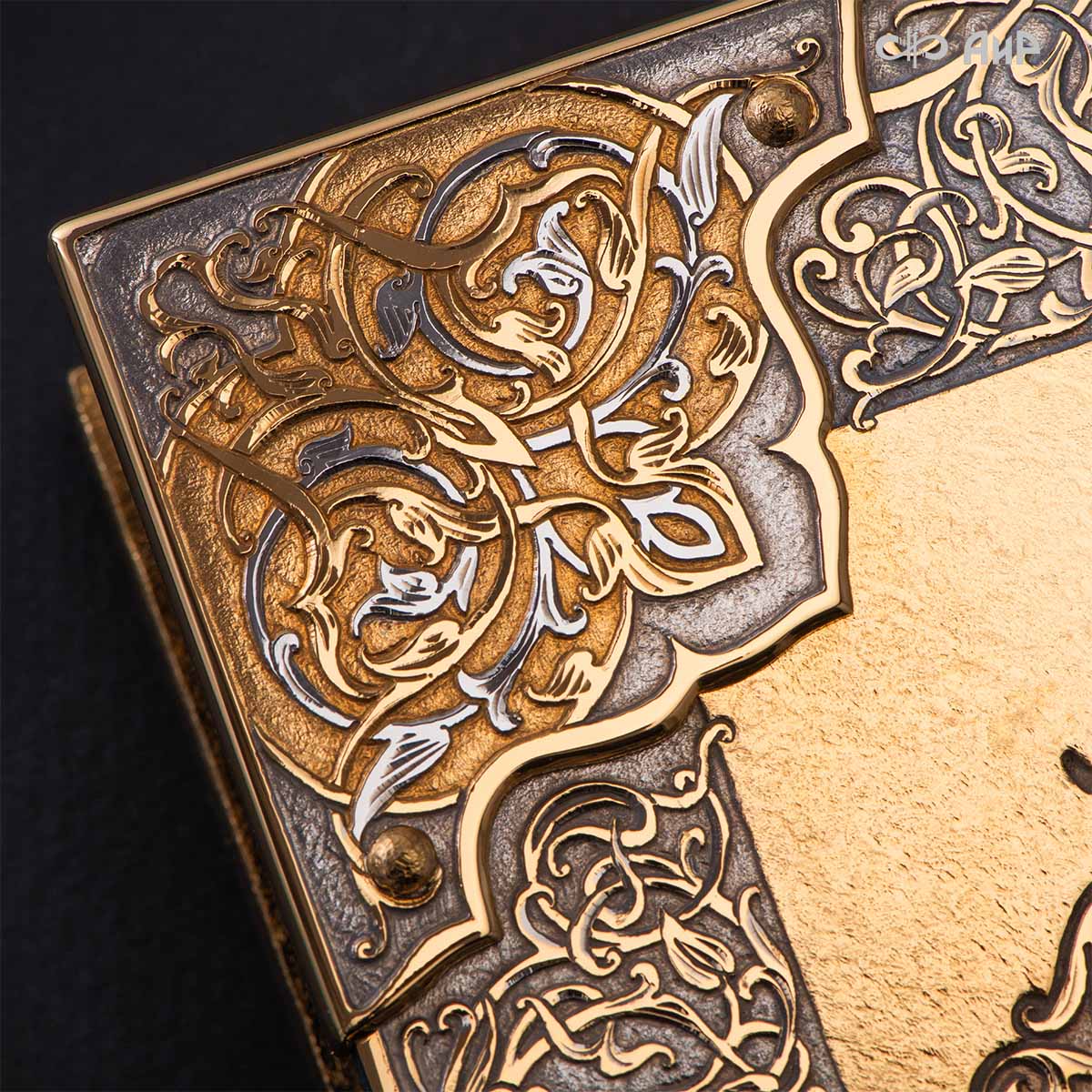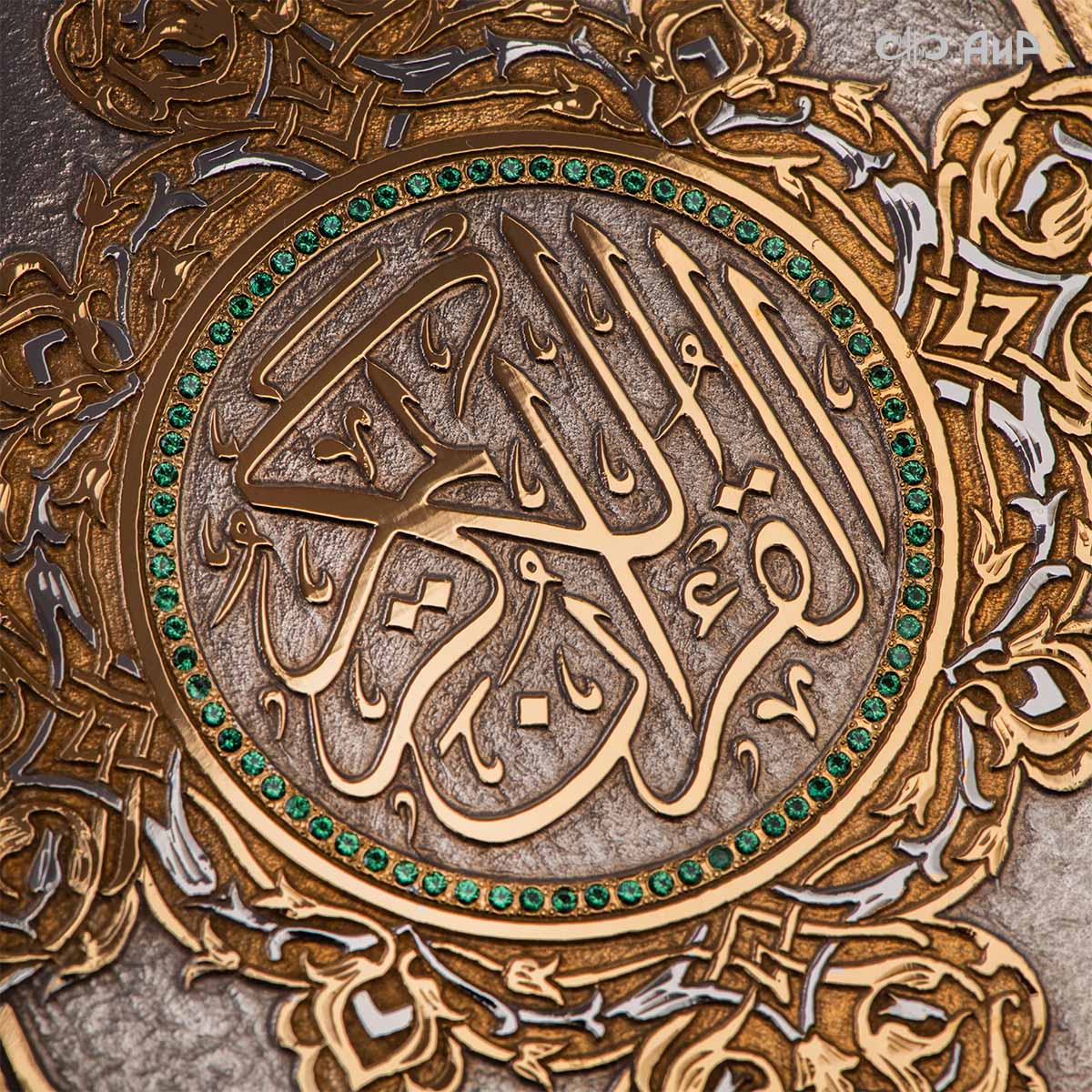 Оклад для Корана - священной книги мусульман, изготовлен в стиле златоустовской гравюры на металле, покрыт золотом и серебром высшей пробы. Узор на лицевой и оборотной сторонах оклада выполнен в восточных мотивах с арабской вязью.