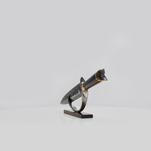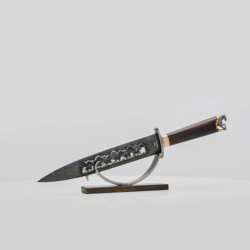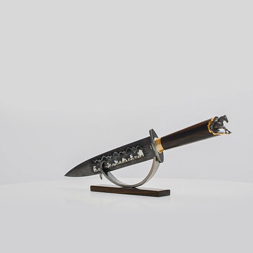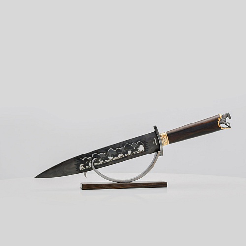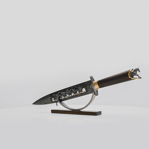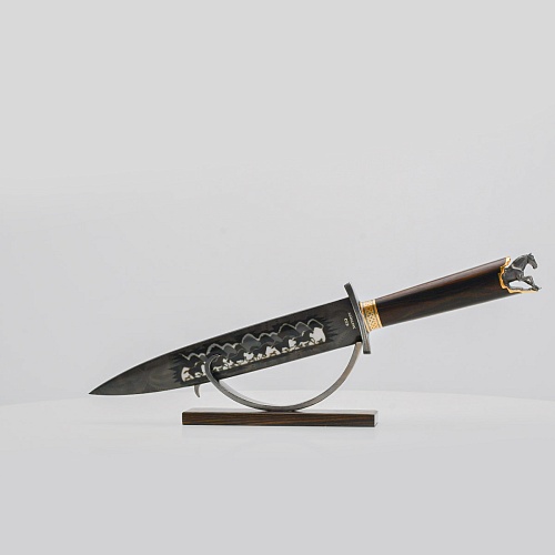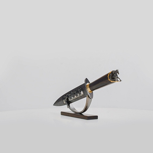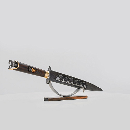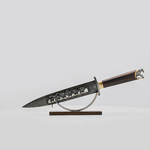 Выкованные кони продолжают свой бег по рукояти, их объемные фигурки будто оживают, выступая из рельефа рукояти. А самый стремительный скакун вырывается вперед и словно вылетает из навершия кинжала. Изящная гарда и украшенный златоустовской гравюрой больстер придают всему изделию совершенный вид.