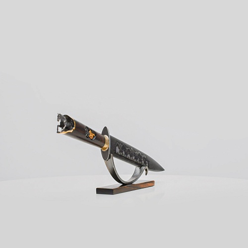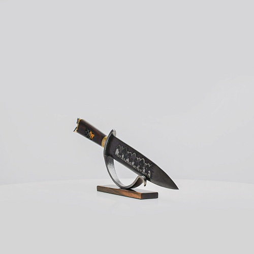 Кинжал комплектуется ножнами из натуральной кожи, также его можно установить на декоративную подставку, предоставив обзор со всех сторон.