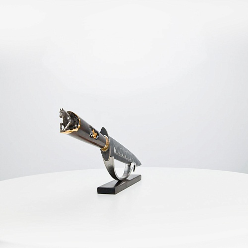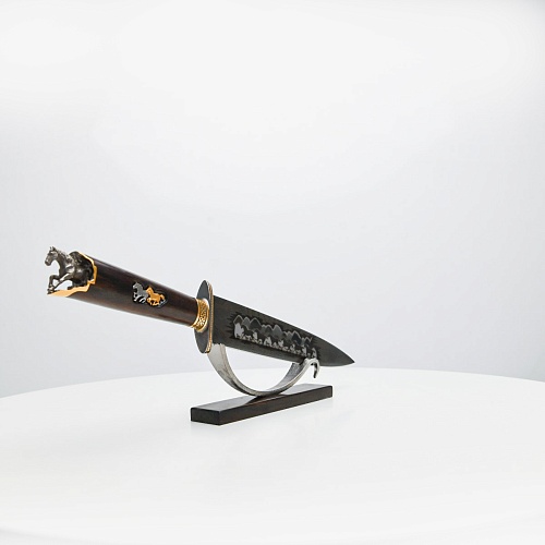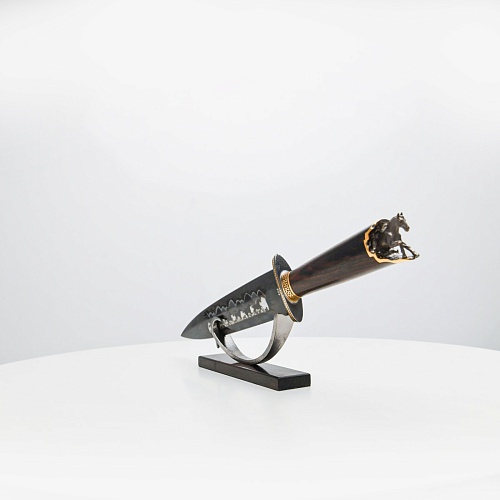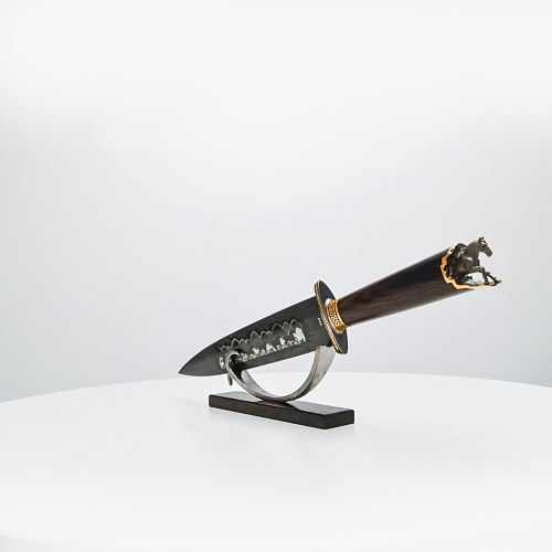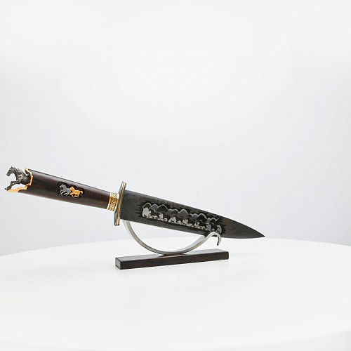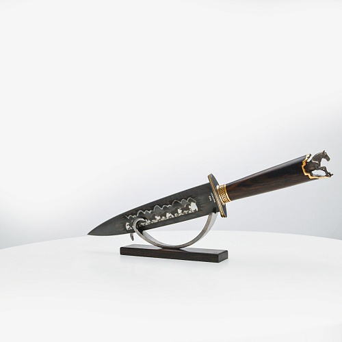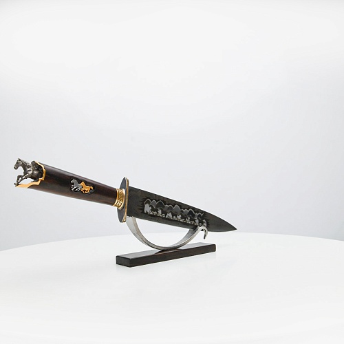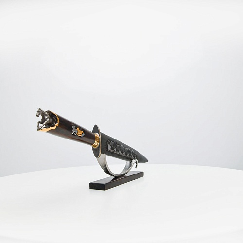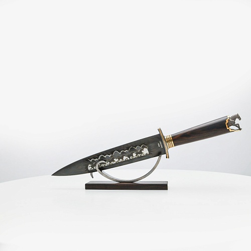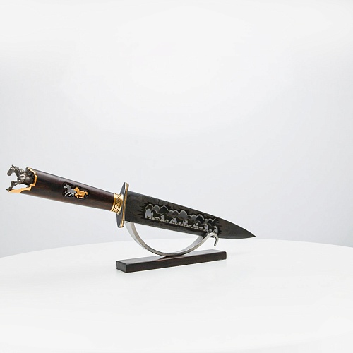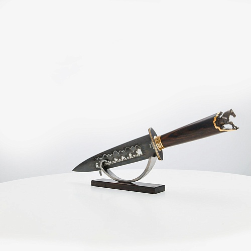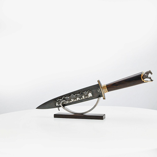 Выкованные кони продолжают свой бег по рукояти, их объемные фигурки будто оживают, выступая из рельефа рукояти. А самый стремительный скакун вырывается вперед и словно вылетает из навершия кинжала. Изящная гарда и украшенный златоустовской гравюрой больстер придают всему изделию совершенный вид.