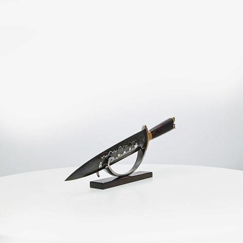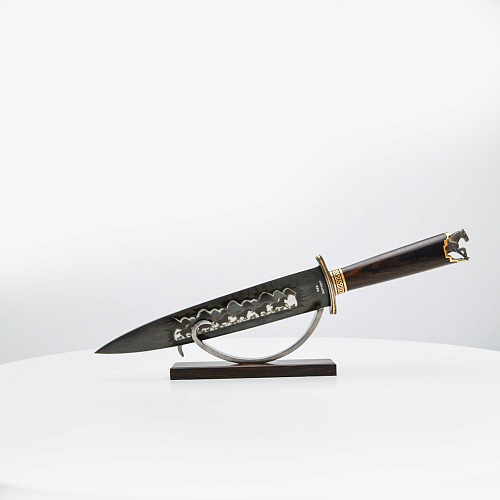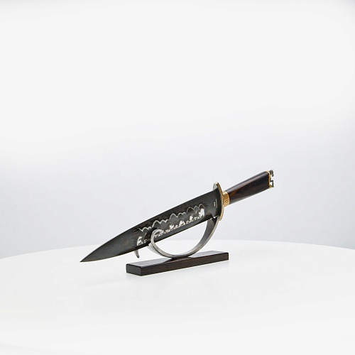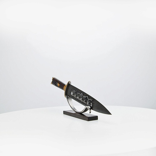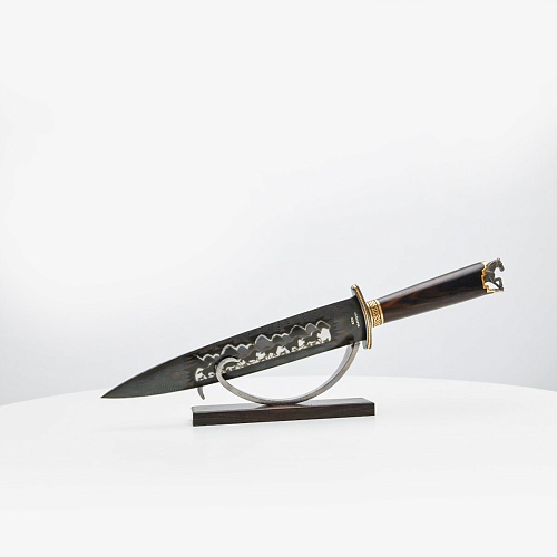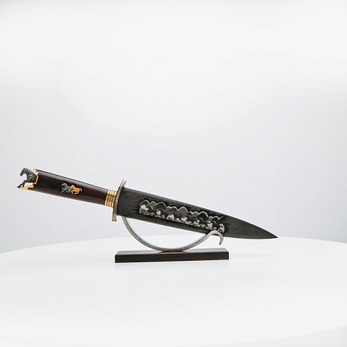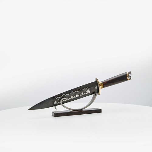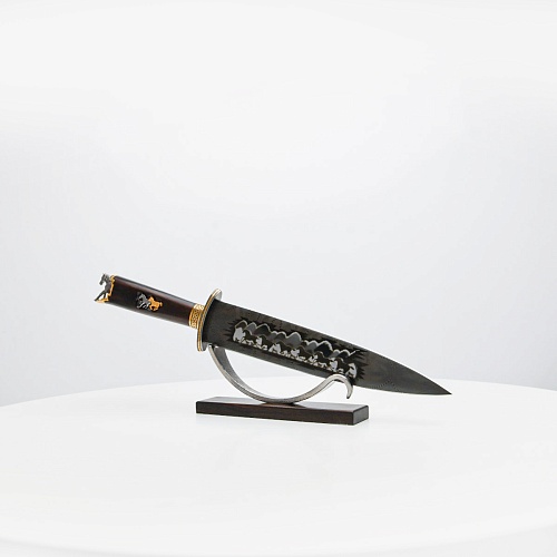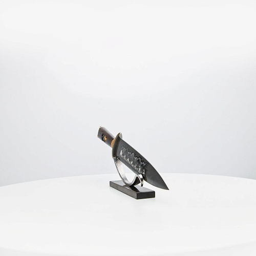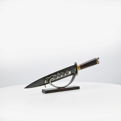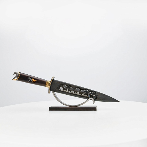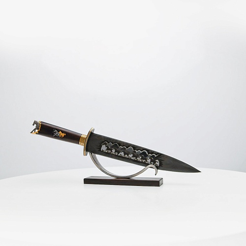 Кинжал комплектуется ножнами из натуральной кожи, также его можно установить на декоративную подставку, предоставив обзор со всех сторон.