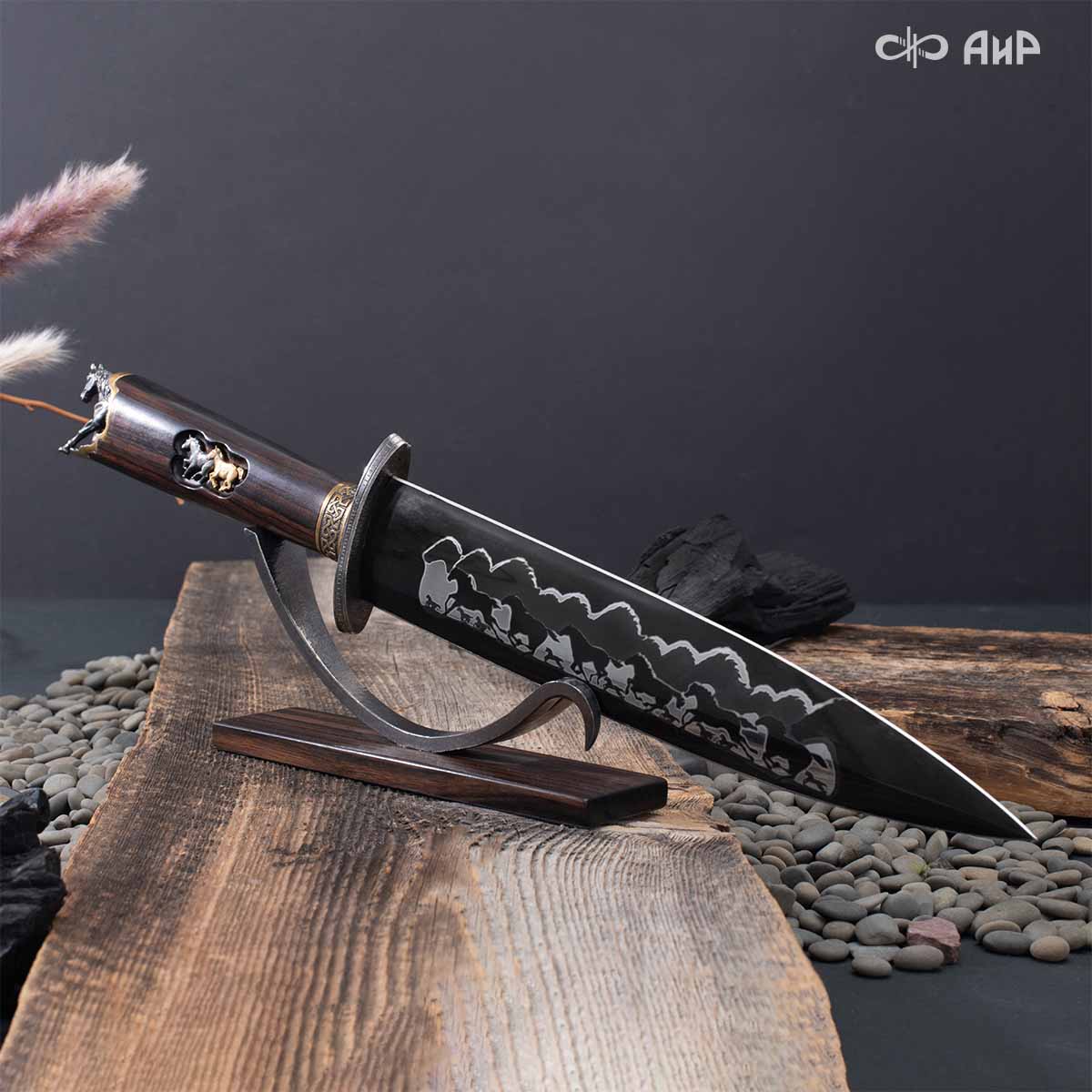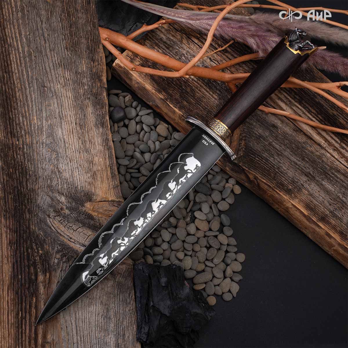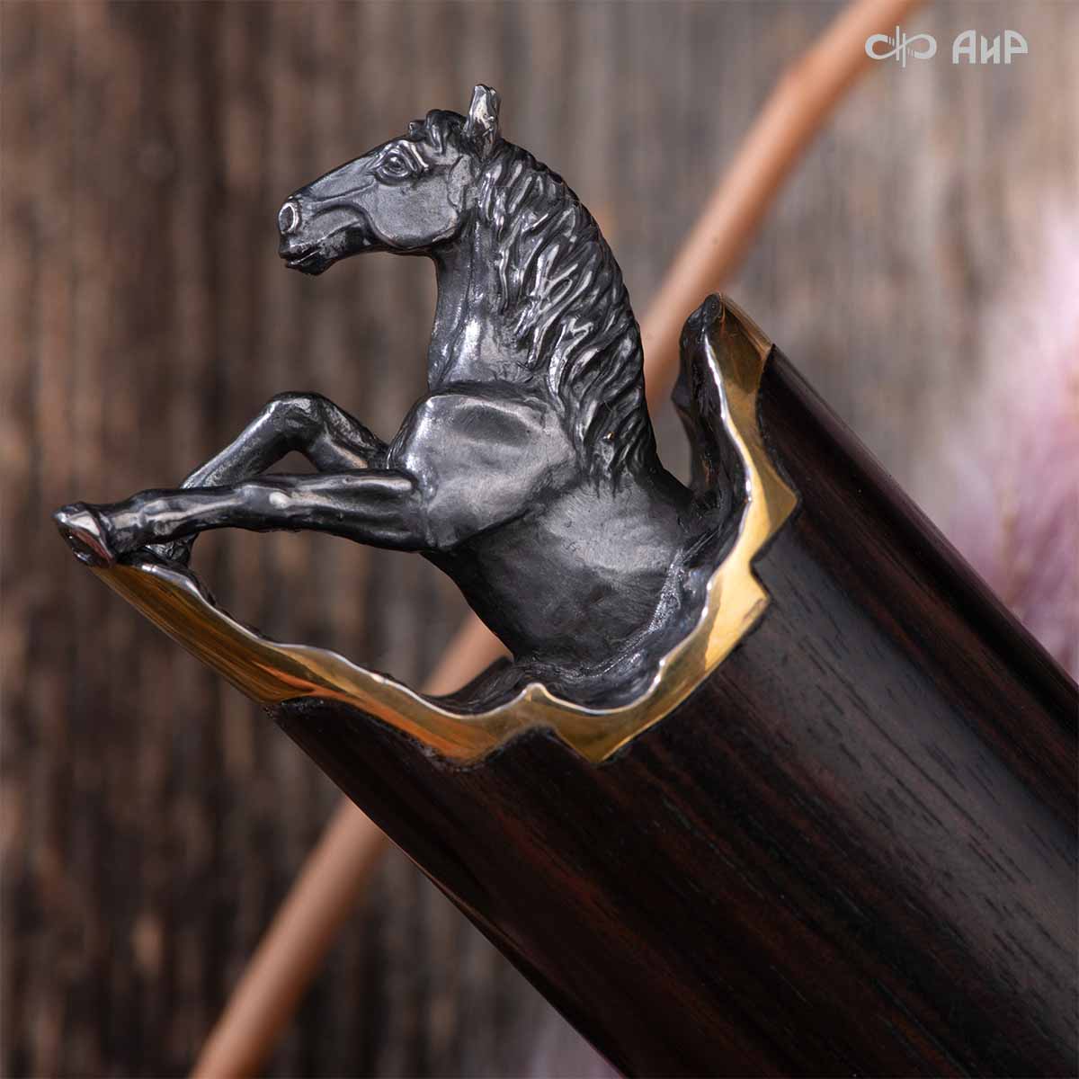Выкованные кони продолжают свой бег по рукояти, их объемные фигурки будто оживают, выступая из рельефа рукояти. А самый стремительный скакун вырывается вперед и словно вылетает из навершия кинжала. Изящная гарда и украшенный златоустовской гравюрой больстер придают всему изделию совершенный вид.