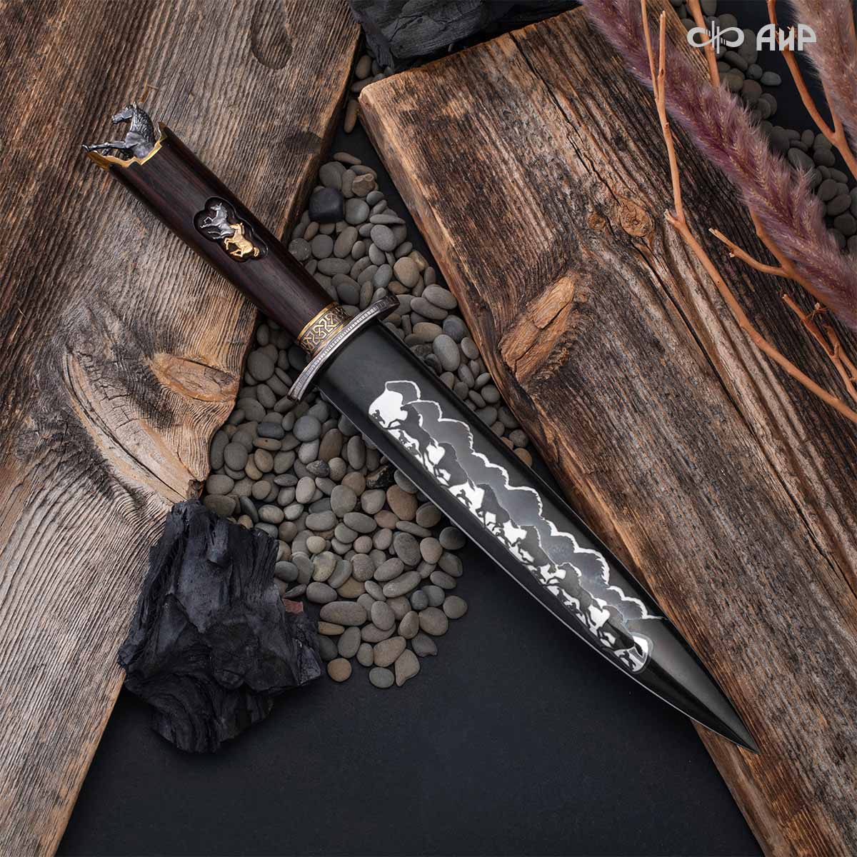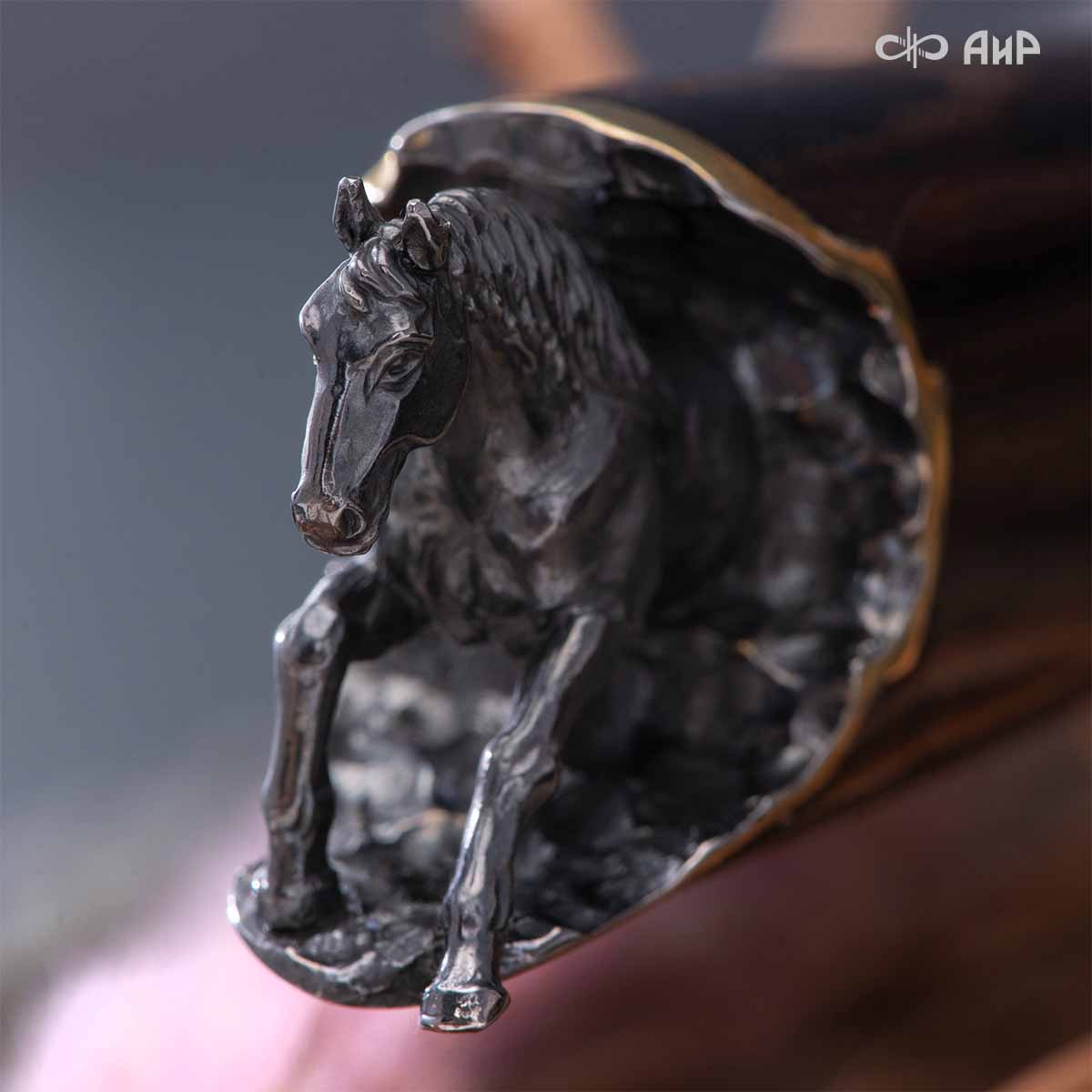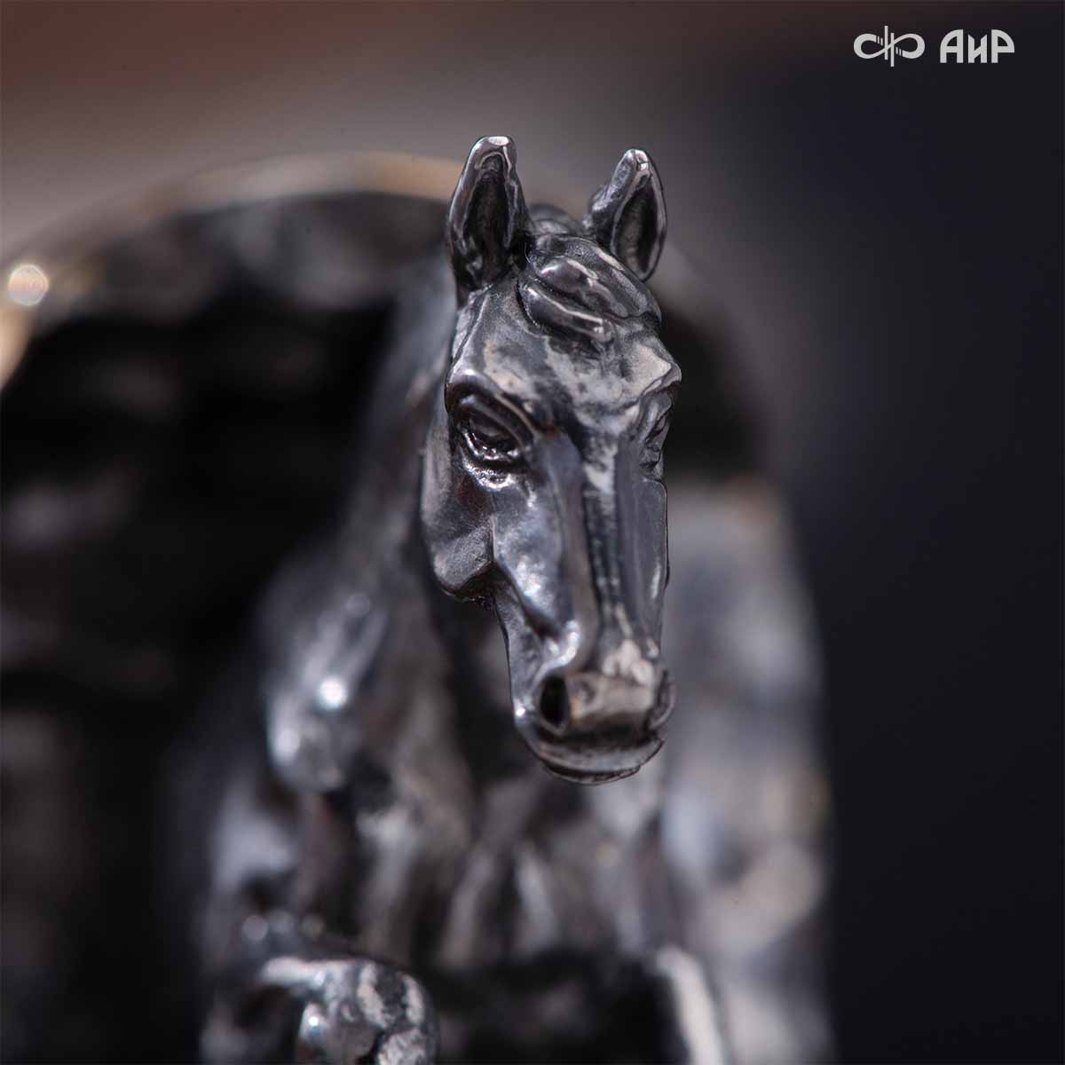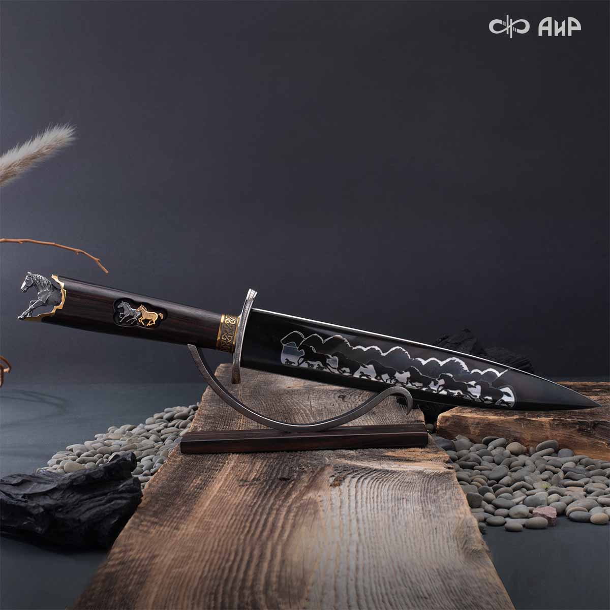 Выкованные кони продолжают свой бег по рукояти, их объемные фигурки будто оживают, выступая из рельефа рукояти. А самый стремительный скакун вырывается вперед и словно вылетает из навершия кинжала. Изящная гарда и украшенный златоустовской гравюрой больстер придают всему изделию совершенный вид.