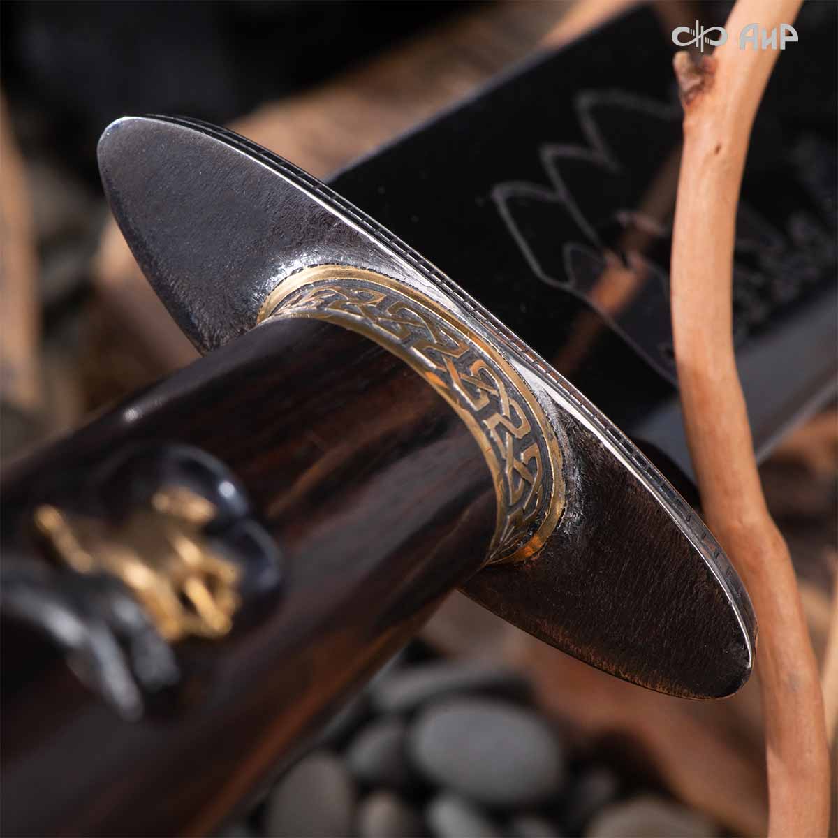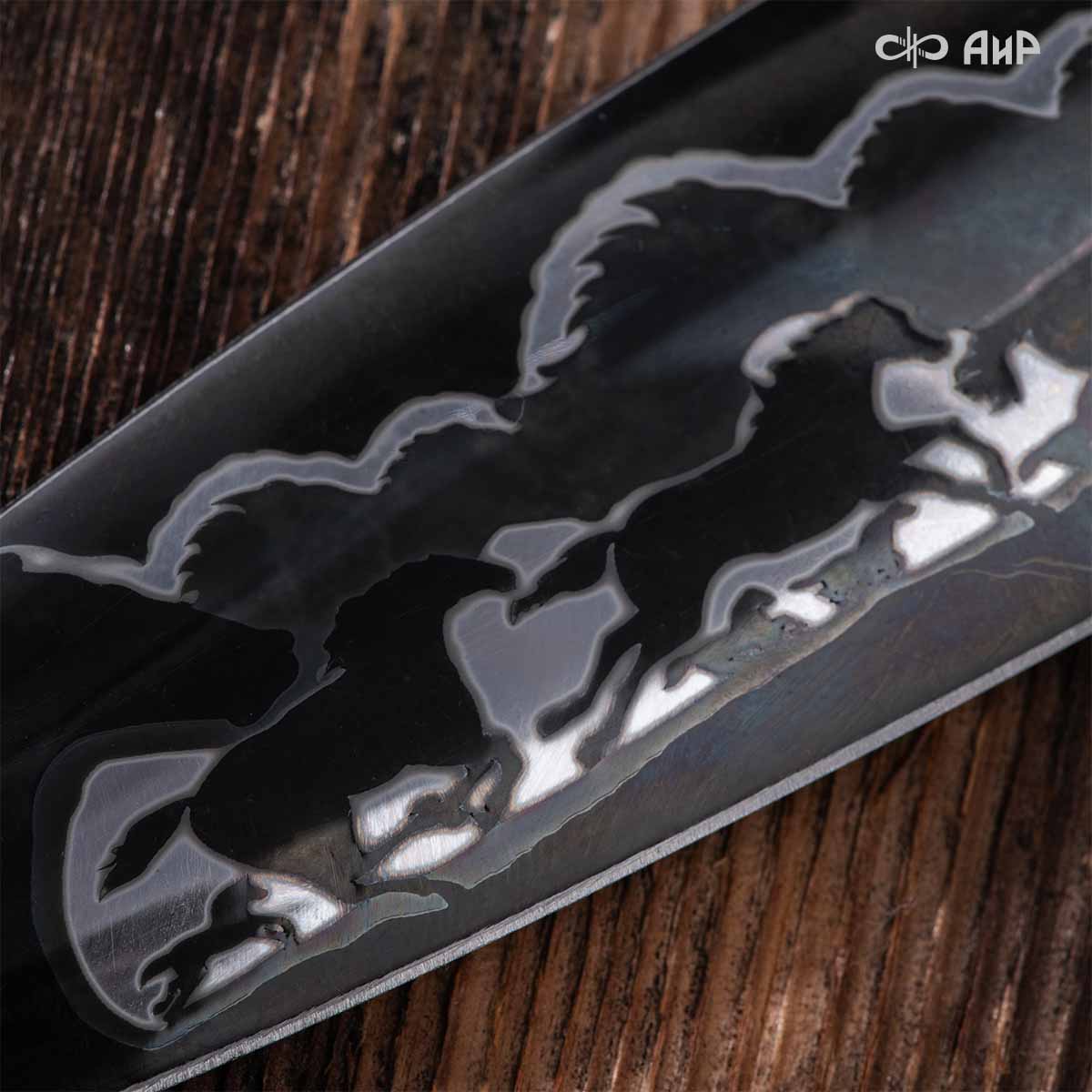 В дамаске есть что-то притягательное. Это отмечают как знатоки, так и просто любители изделий из металла. Это и красота, и налет многовековой истории, и неповторимость узоров. Но мозаичный дамаск особенно завораживает. Компания «АиР» обладает технологией, позволяющей сваривать различные стали без дефектов, присущих традиционной кузнечной сварке. В основе арт-дамаска, из которого выполнен кинжал «Табун», лежит электроэрозионная резка и кузнечная сварка. Весь секрет ─ в принципе формирования узора. В технологии учитывается разница в деформировании различных сталей, неравномерность течения металла и многое-многое другое. Самое удивительное, что арт-дамаск – это не просто декор. В его основе рабочие высокоуглеродистые и легированные стали. Красота ни в коей мере не в ущерб функциональным характеристикам оружия.