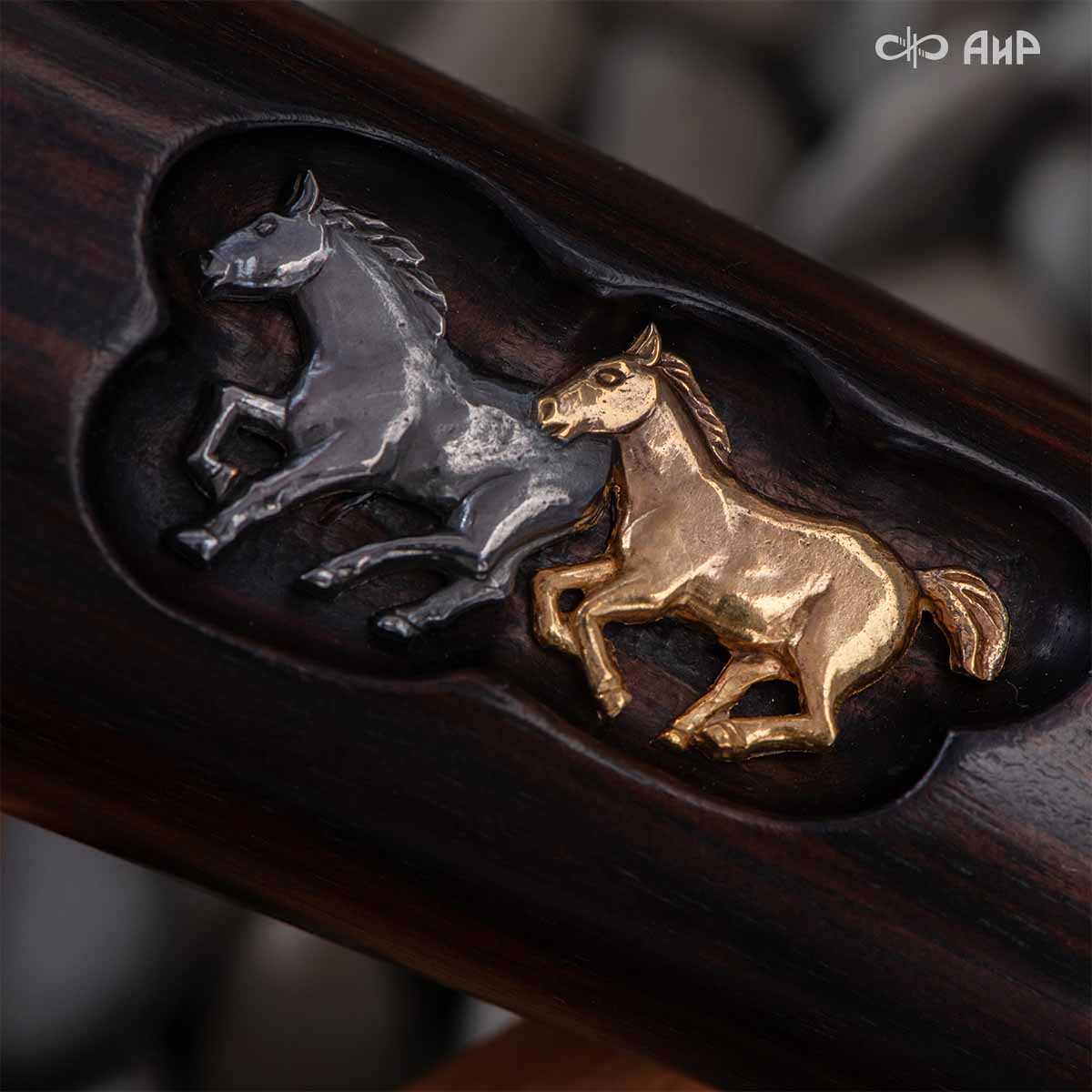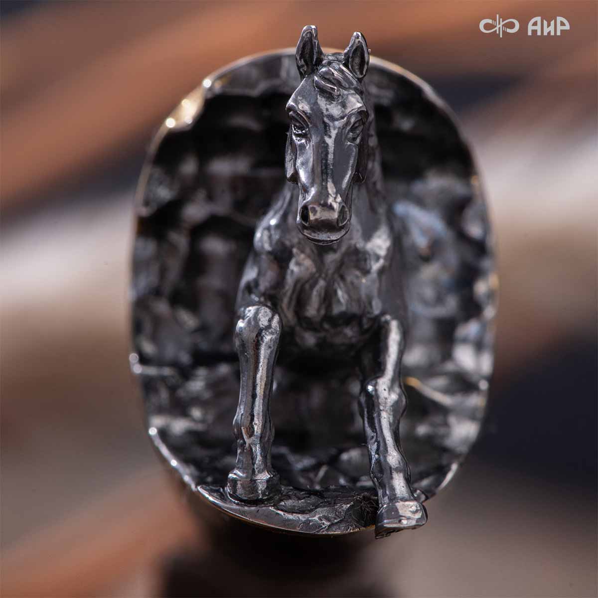 Почему изображены кони? Здесь переплелось несколько идей: крылатый конь присутствует в гербе города Златоуста, также конь – символ природной красоты, стремительности, грациозности, часто скорость мысли сравнивают с бегом несущихся скакунов. Именно летящий конь в полной мере может подчеркнуть красоту такого металла, как дамаск.