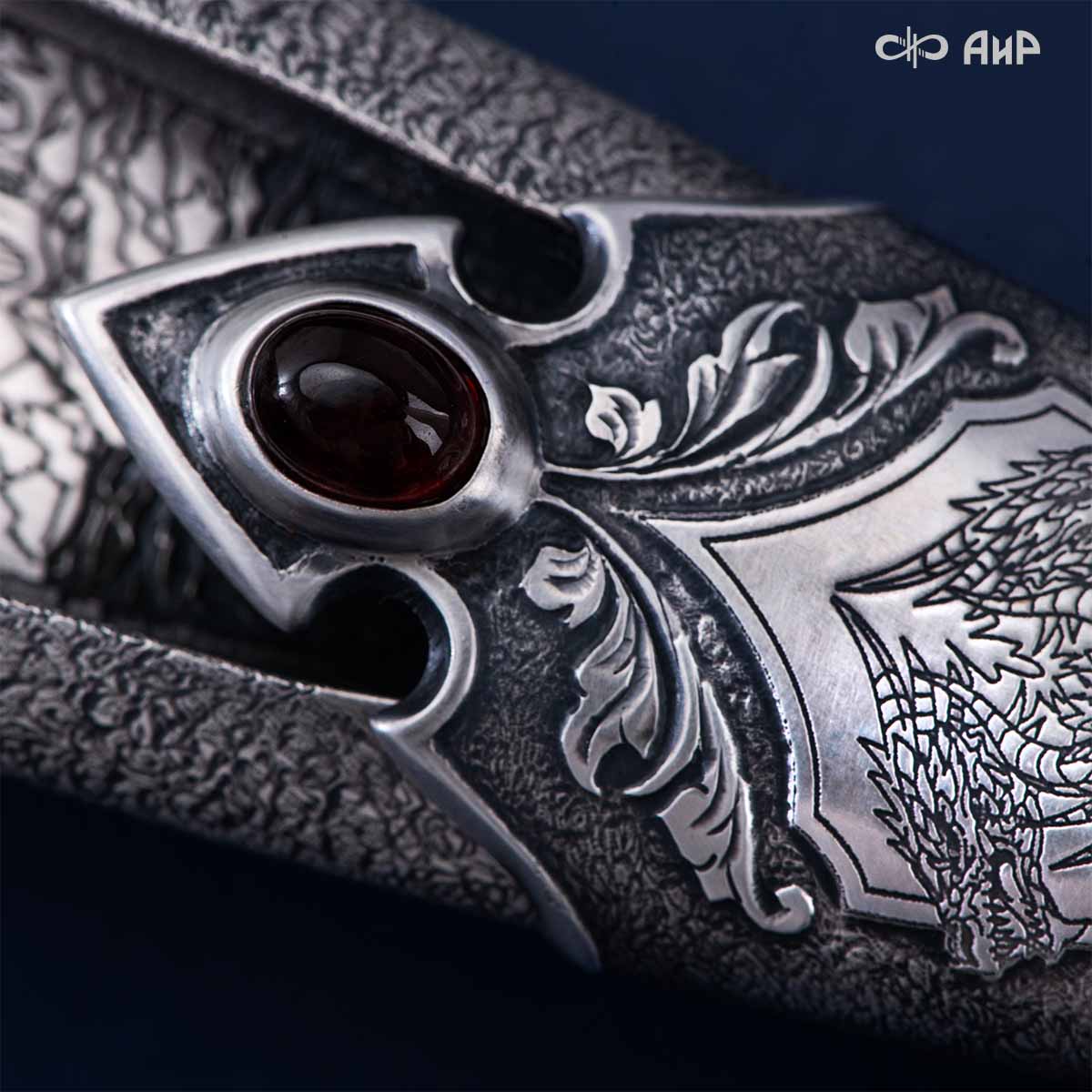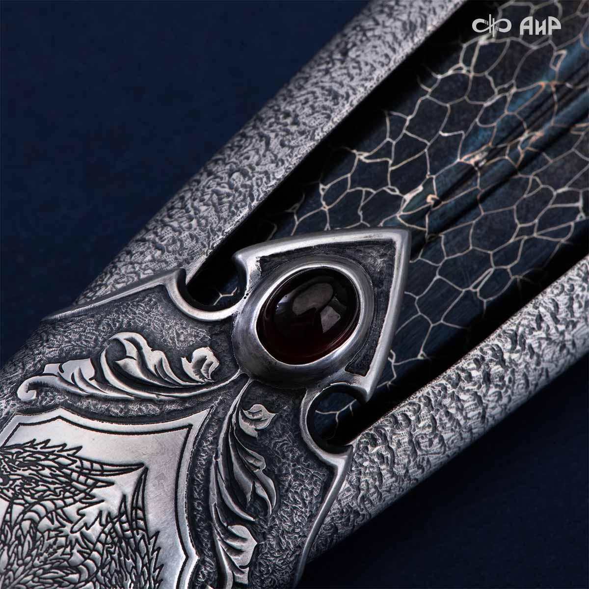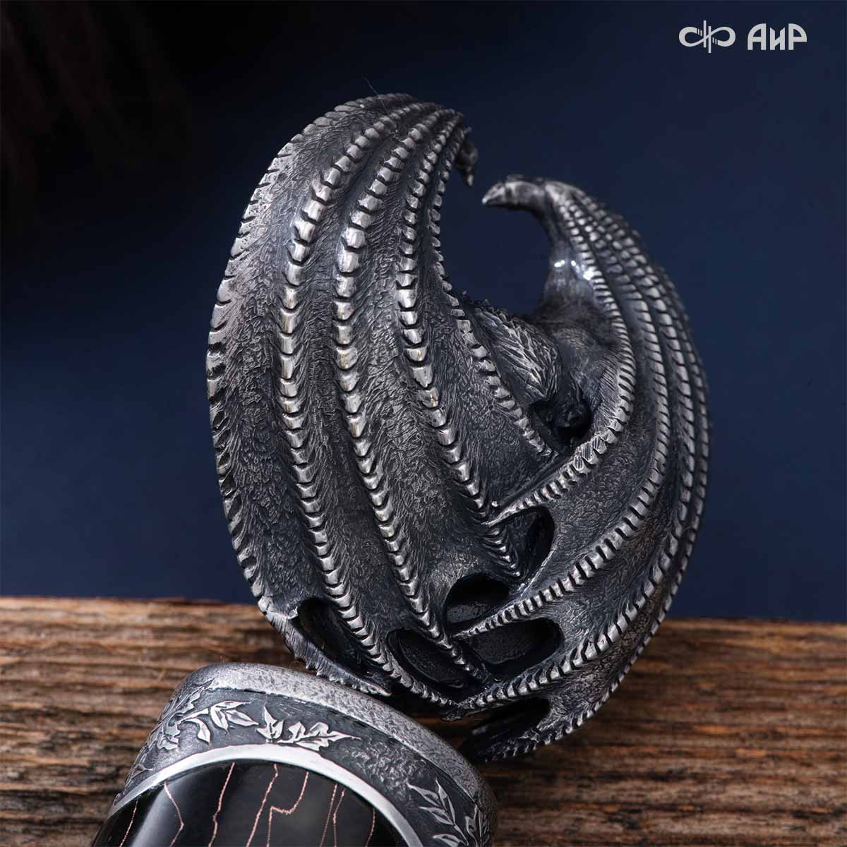 Особенности: необычный дизайн ножен, клинок кинжала виден в собранном виде. Рельеф клинка напоминают крылья драконов. Кинжал изготовлен в технике златоустовской гравюры на металле. Использовались ручная рисовка, скульптурная лепка, травление, слесарные работы и покрытие драгоценными металлами гальваническим способом.