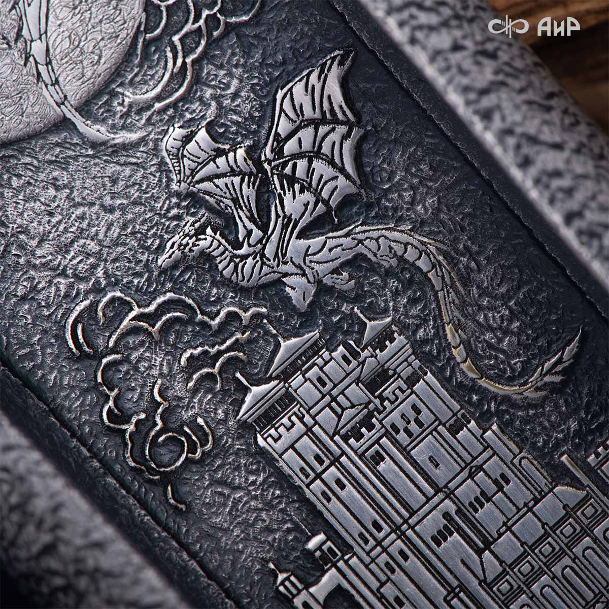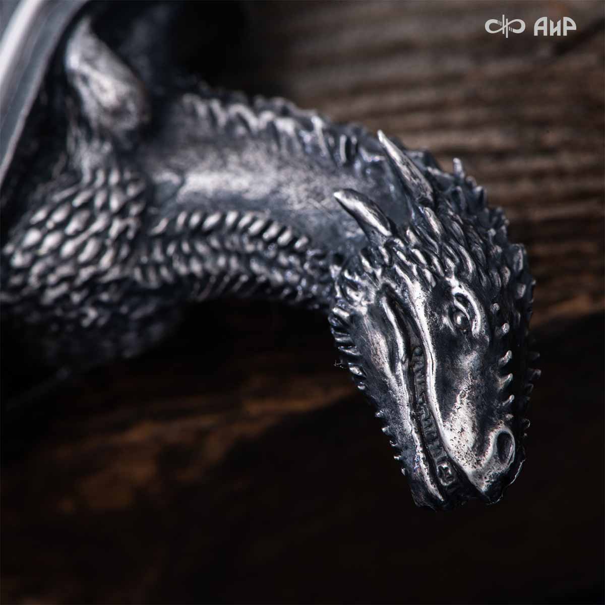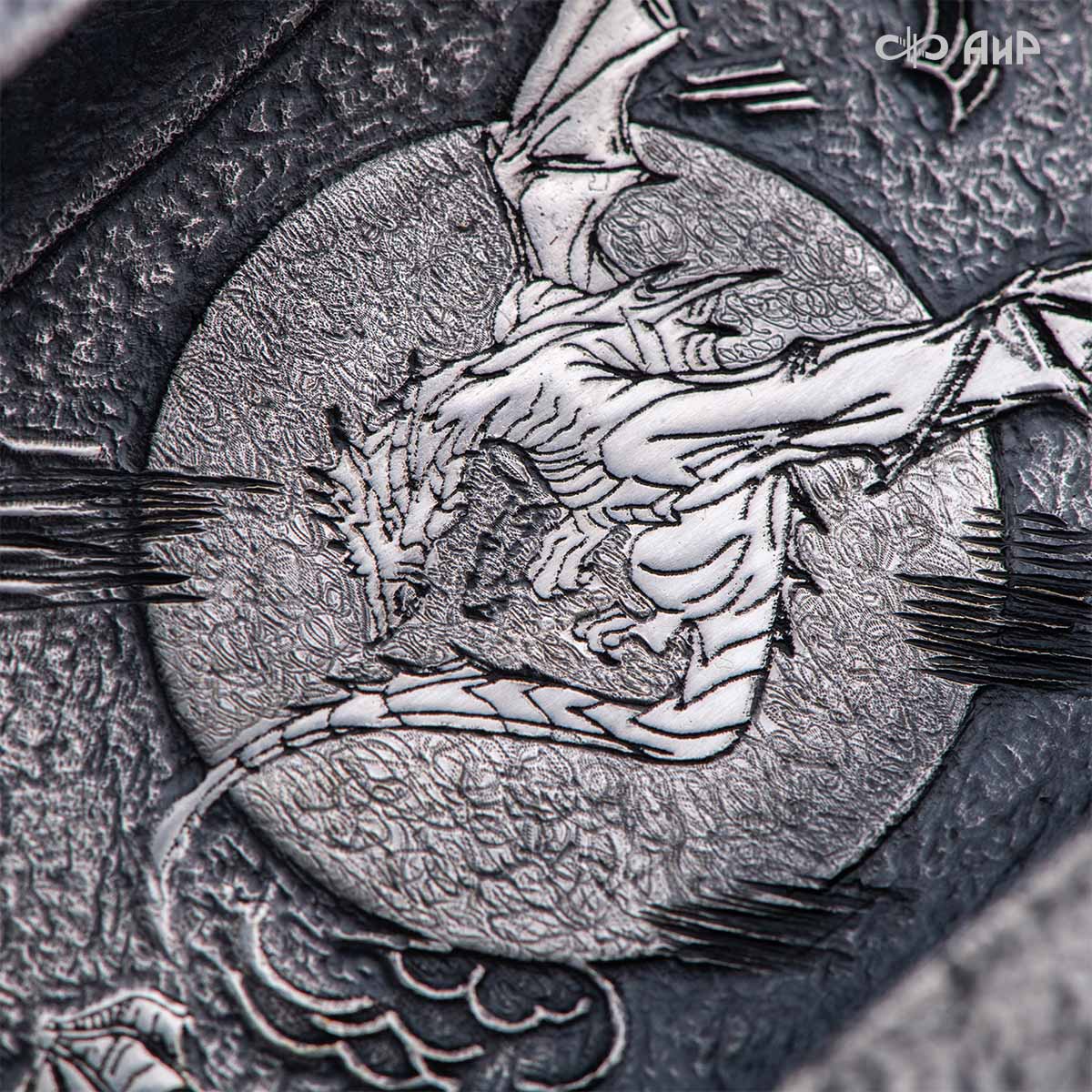 Особенности: необычный дизайн ножен, клинок кинжала виден в собранном виде. Рельеф клинка напоминают крылья драконов. Кинжал изготовлен в технике златоустовской гравюры на металле. Использовались ручная рисовка, скульптурная лепка, травление, слесарные работы и покрытие драгоценными металлами гальваническим способом.