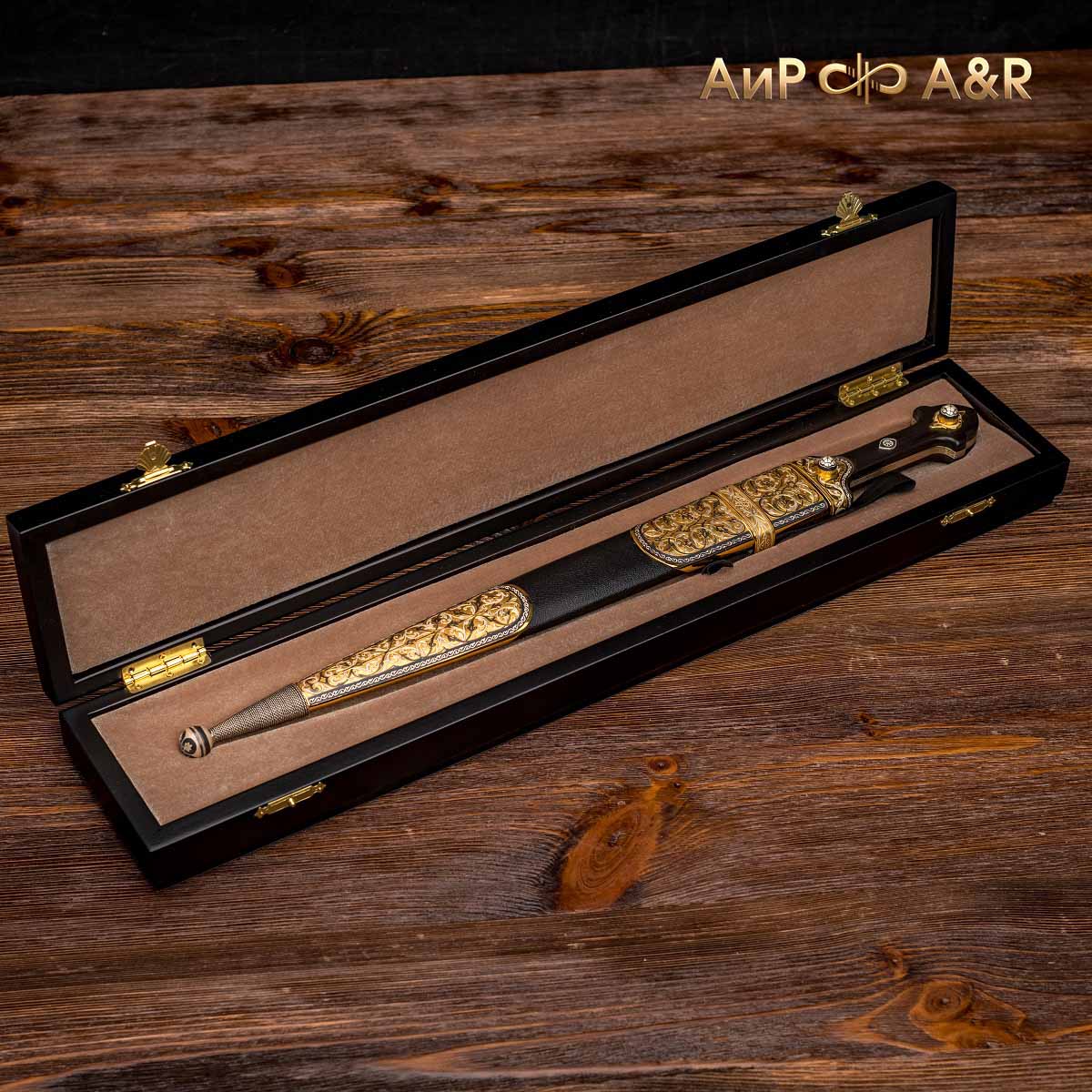 Компания «АиР» изготавливает кинжалы кавказского типа «Есаул», украшенные золотом, серебром или мельхиором. Каждый кинжал – это яркий пример ручной работы и вдохновенного коллективного творчества. Оружейники, художники и граверы компании достойно хранят и развивают златоустовские традиции декорирования металла. В процессе создания каждого изделия соединяются талант, творческий подход и высокий уровень исполнения. Представленный экземпляр богато украшен орнаментом.