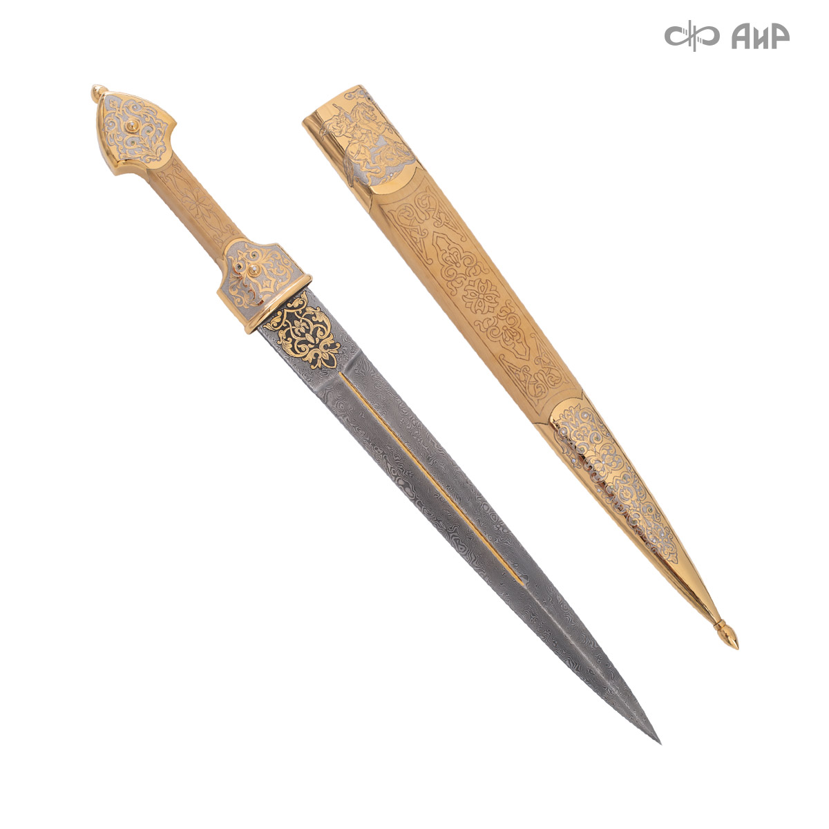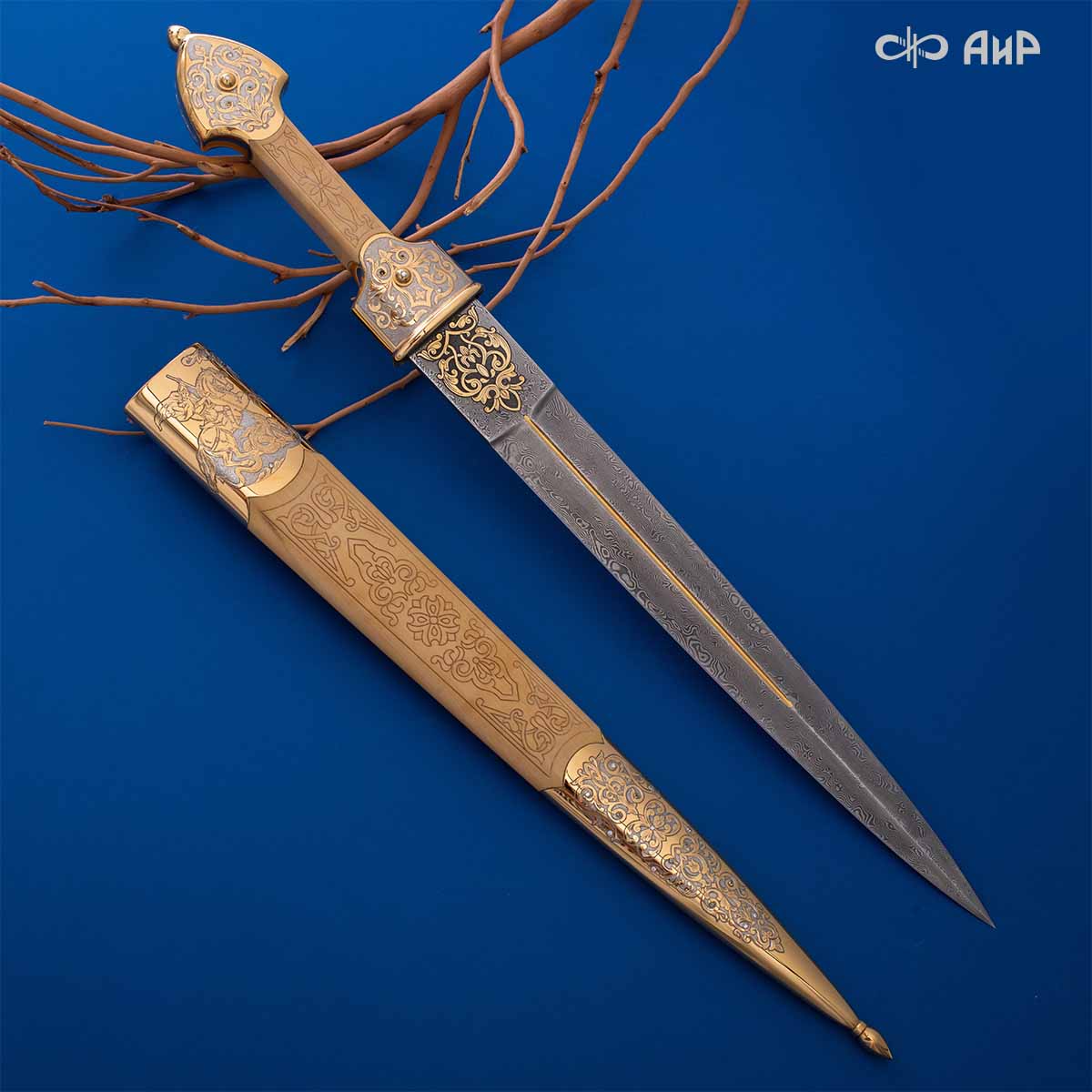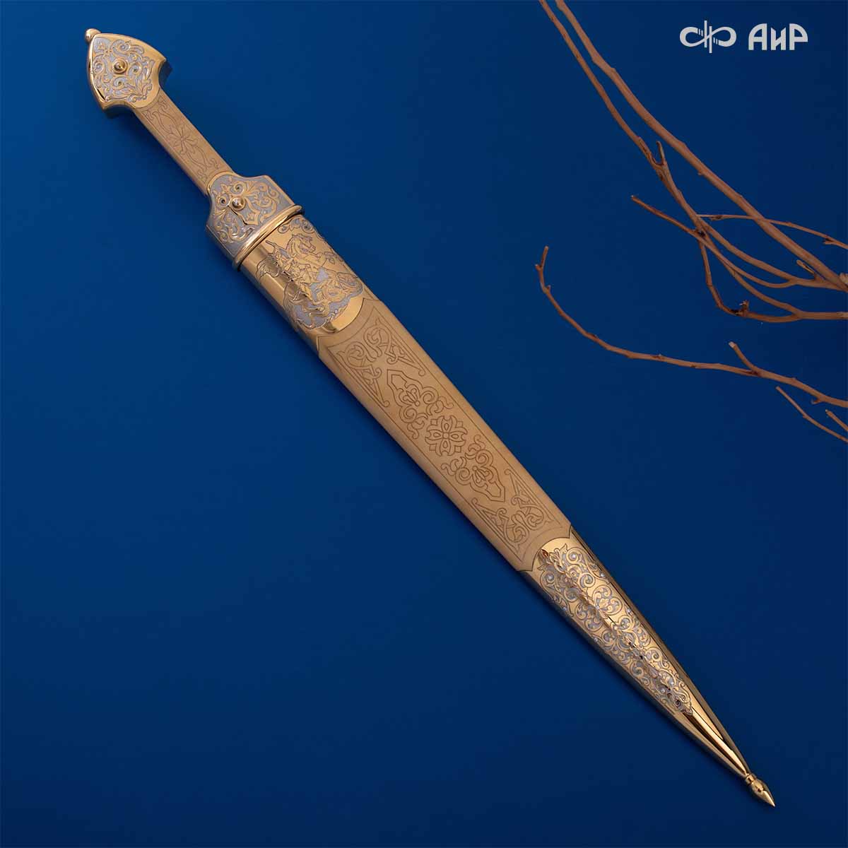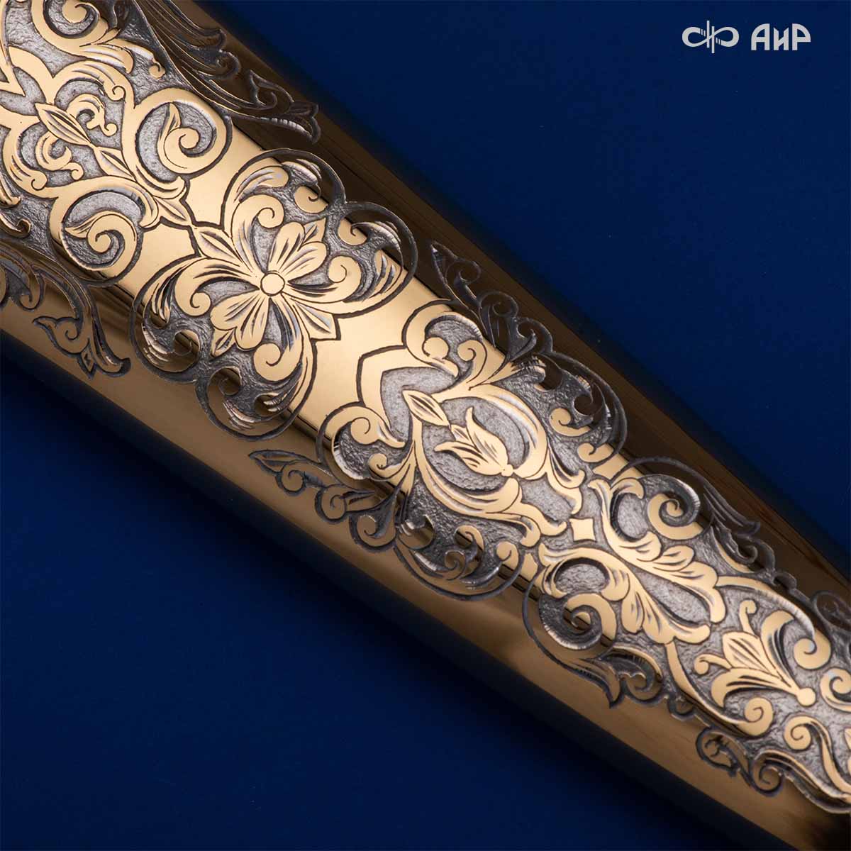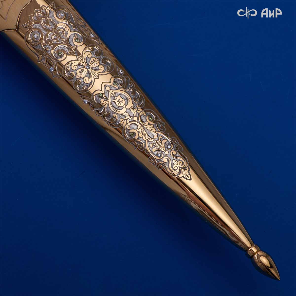 Компания «АиР» изготавливает кинжалы кавказского типа, украшенные золотом, серебром или мельхиором. Каждый кинжал – это яркий пример ручной работы и вдохновенного коллективного творчества. Оружейники, художники и граверы компании достойно хранят и развивают златоустовские традиции декорирования металла. В процессе создания каждого изделия соединяются талант, творческий подход и высокий уровень исполнения. Представленный экземпляр богато украшен орнаментом.