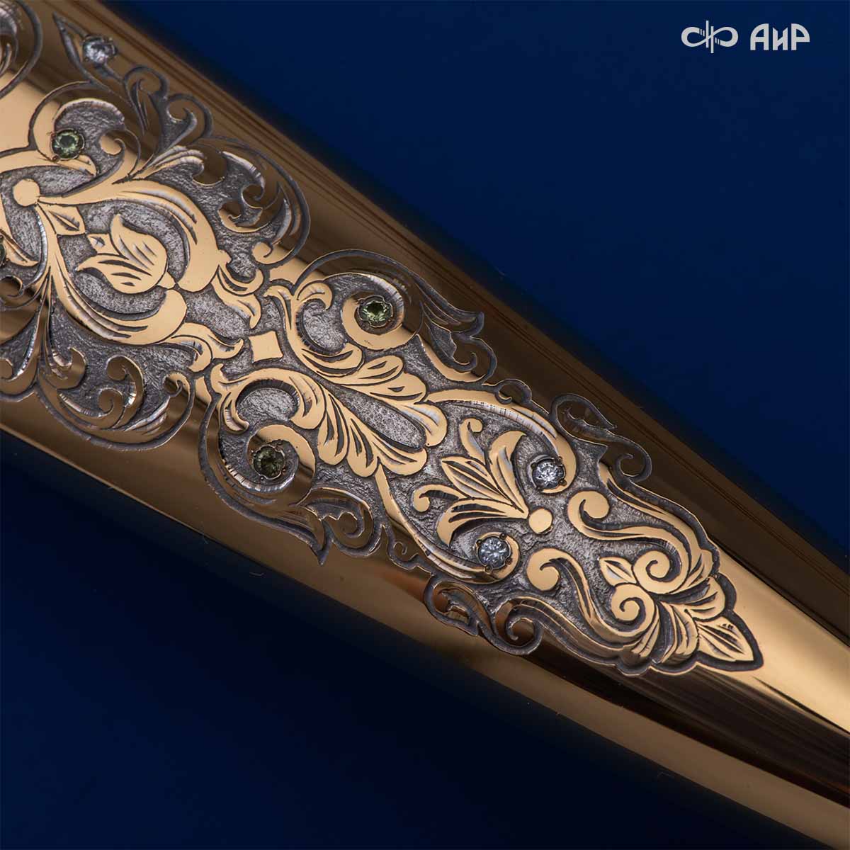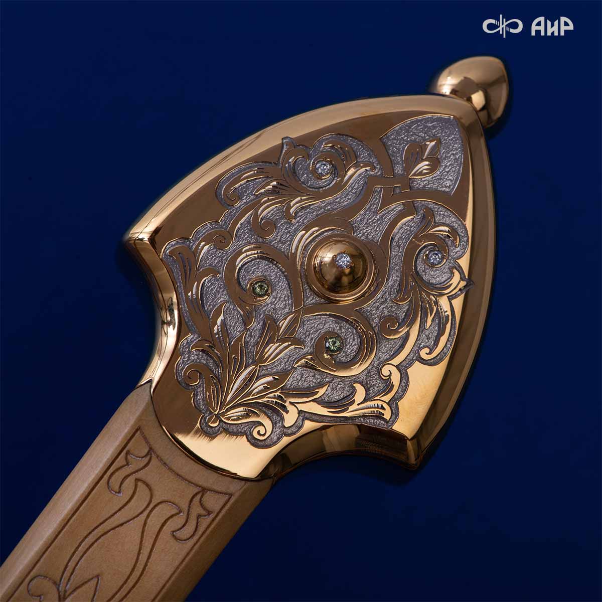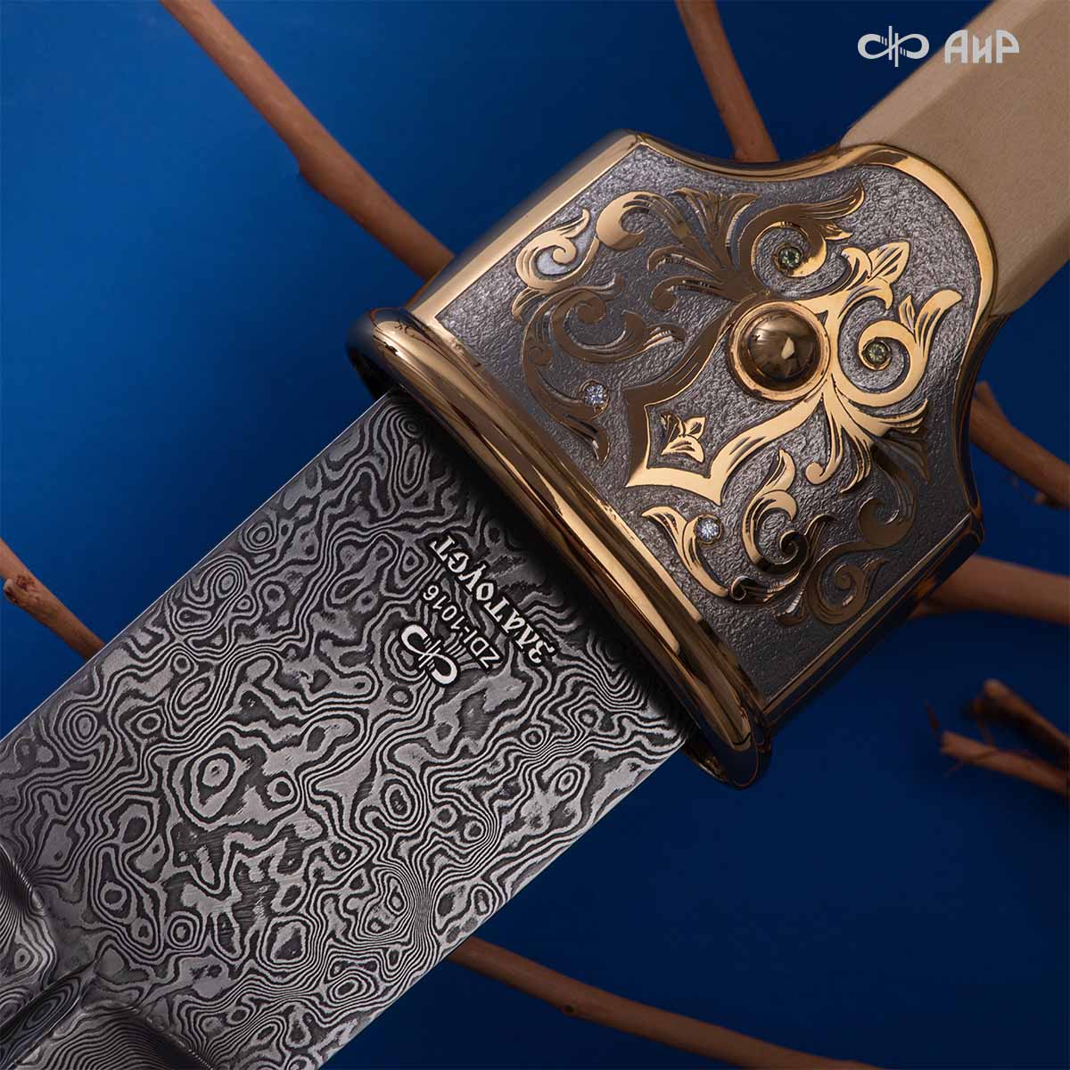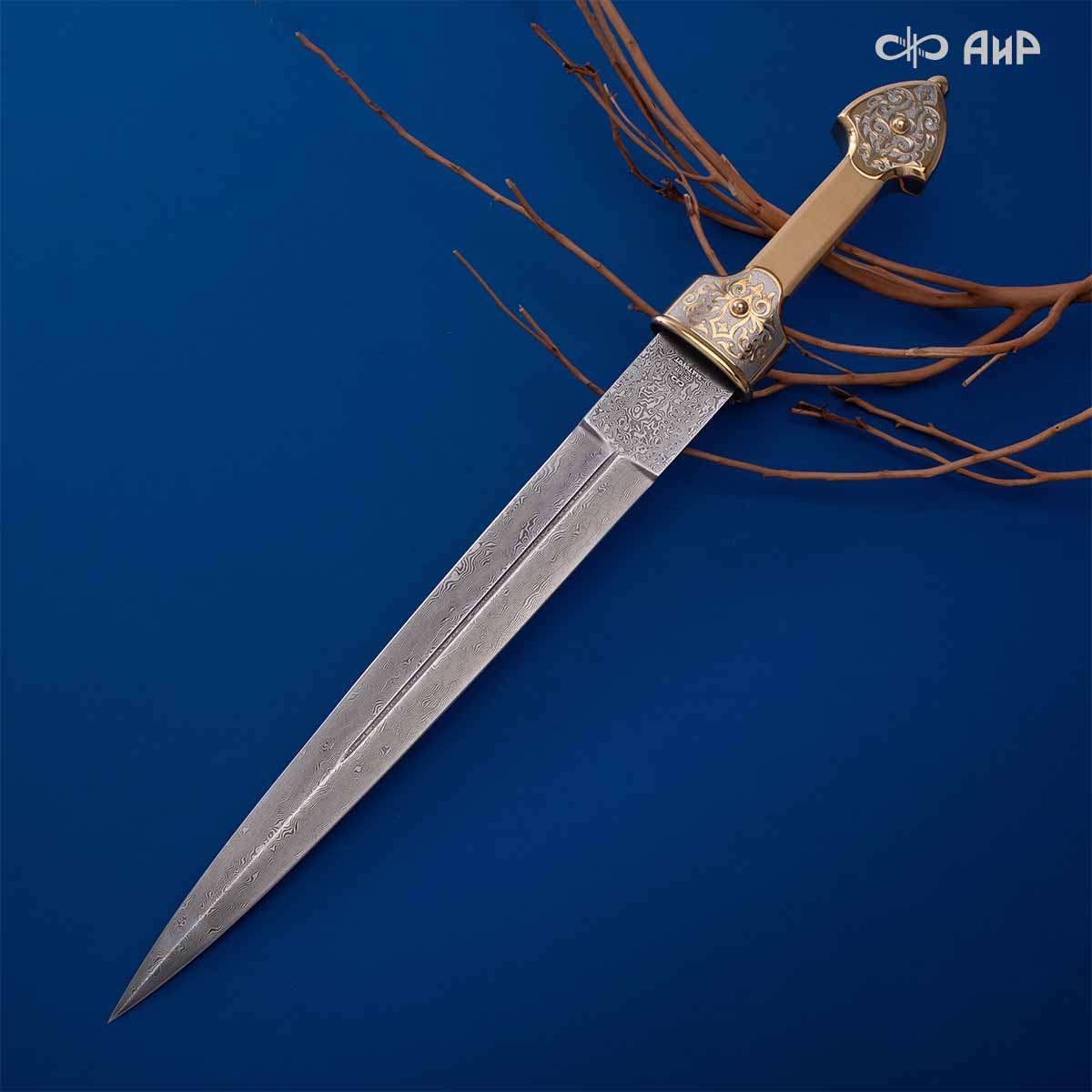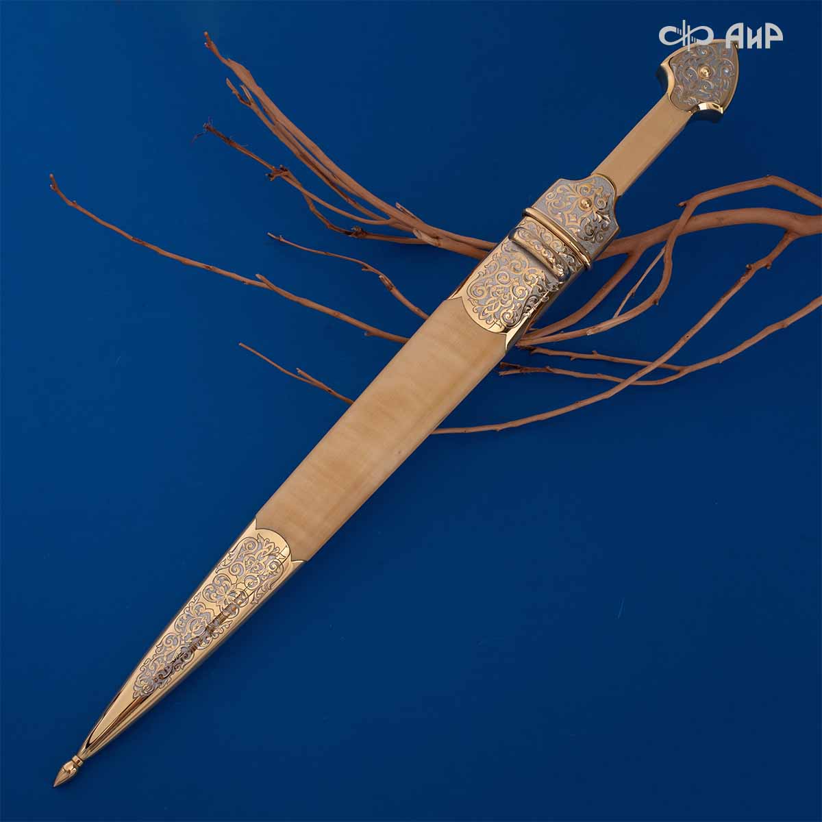 Компания «АиР» изготавливает кинжалы кавказского типа, украшенные золотом, серебром или мельхиором. Каждый кинжал – это яркий пример ручной работы и вдохновенного коллективного творчества. Оружейники, художники и граверы компании достойно хранят и развивают златоустовские традиции декорирования металла. В процессе создания каждого изделия соединяются талант, творческий подход и высокий уровень исполнения. Представленный экземпляр богато украшен орнаментом.