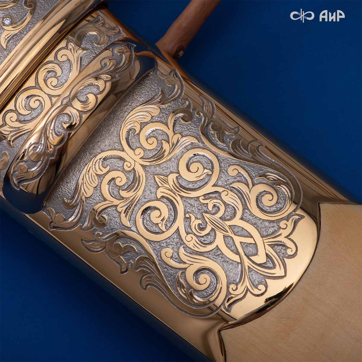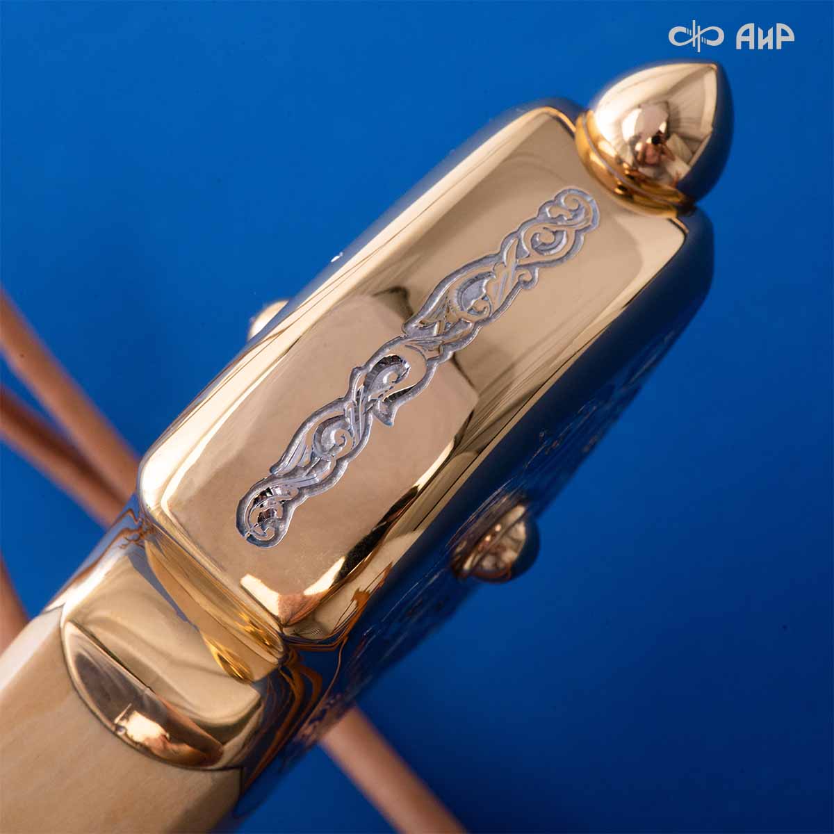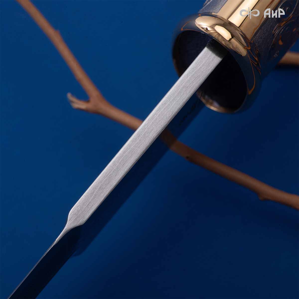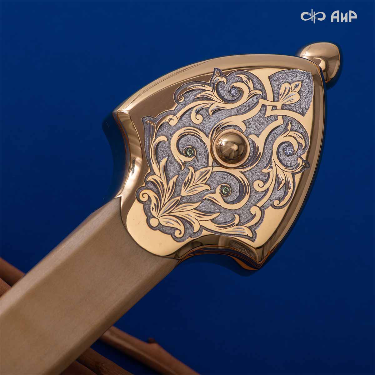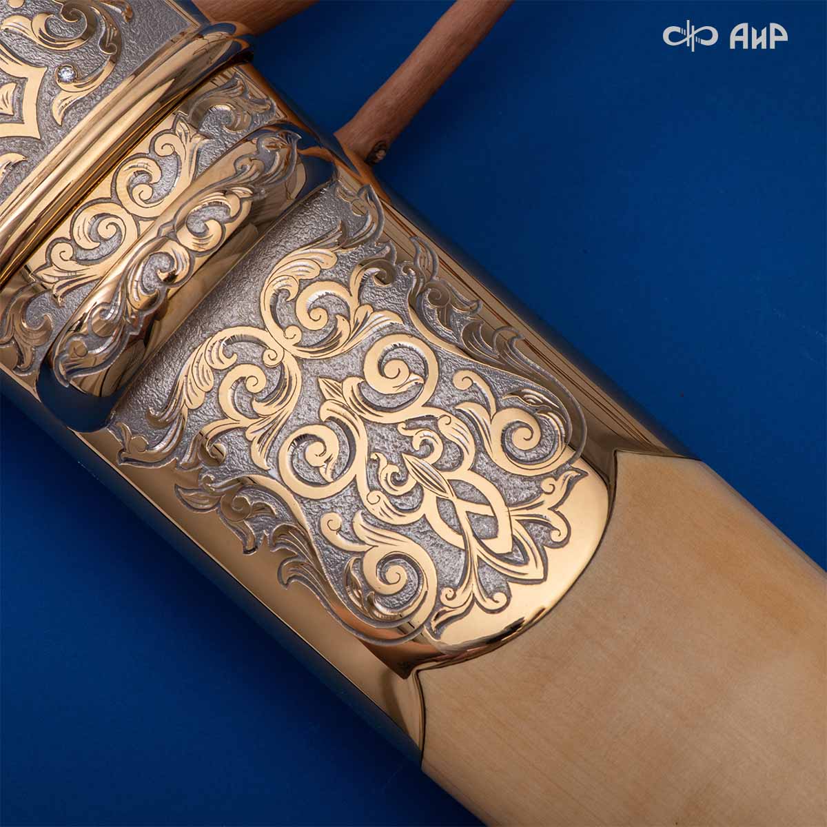 Компания «АиР» изготавливает кинжалы кавказского типа, украшенные золотом, серебром или мельхиором. Каждый кинжал – это яркий пример ручной работы и вдохновенного коллективного творчества. Оружейники, художники и граверы компании достойно хранят и развивают златоустовские традиции декорирования металла. В процессе создания каждого изделия соединяются талант, творческий подход и высокий уровень исполнения. Представленный экземпляр богато украшен орнаментом.