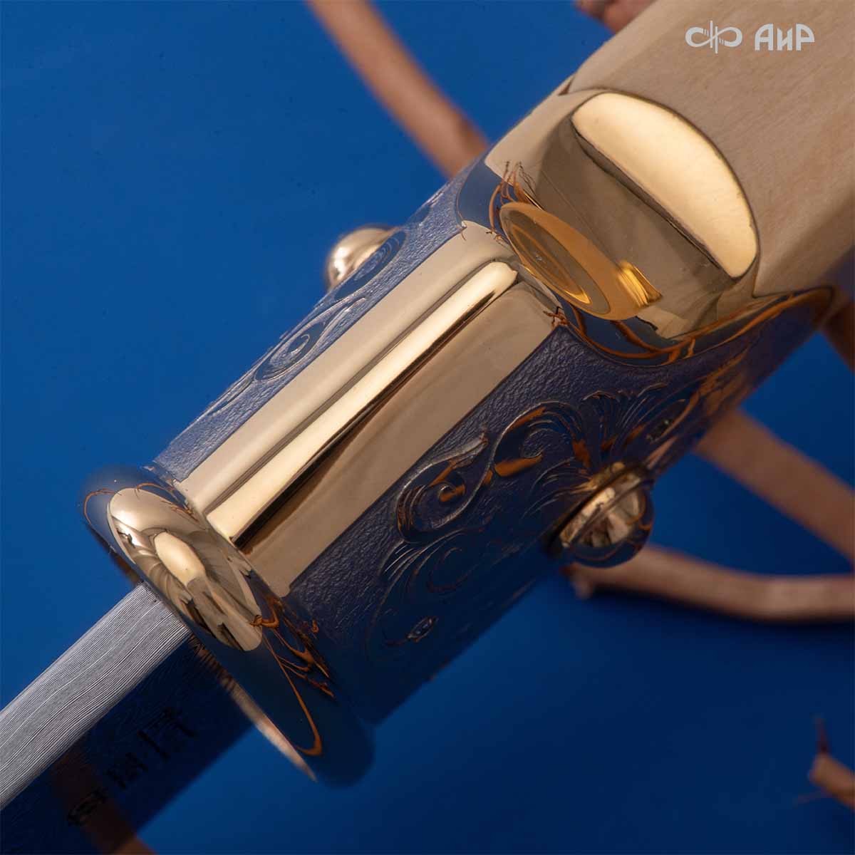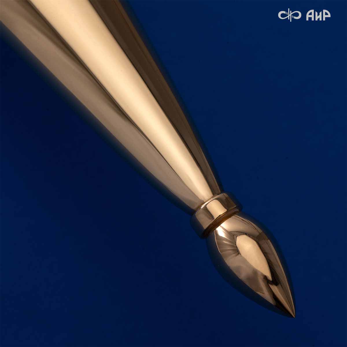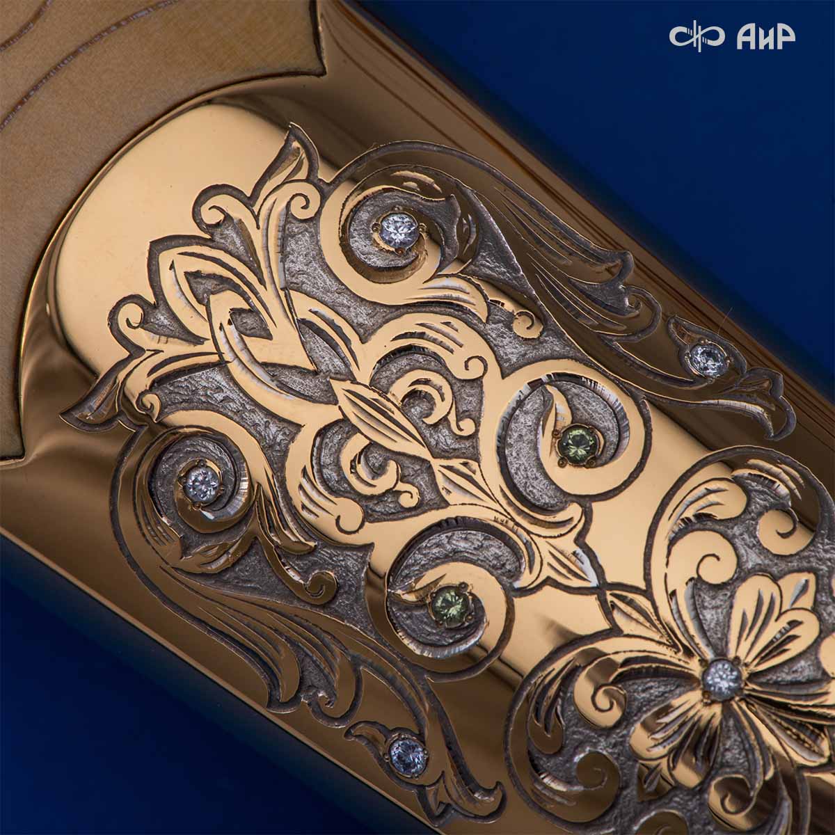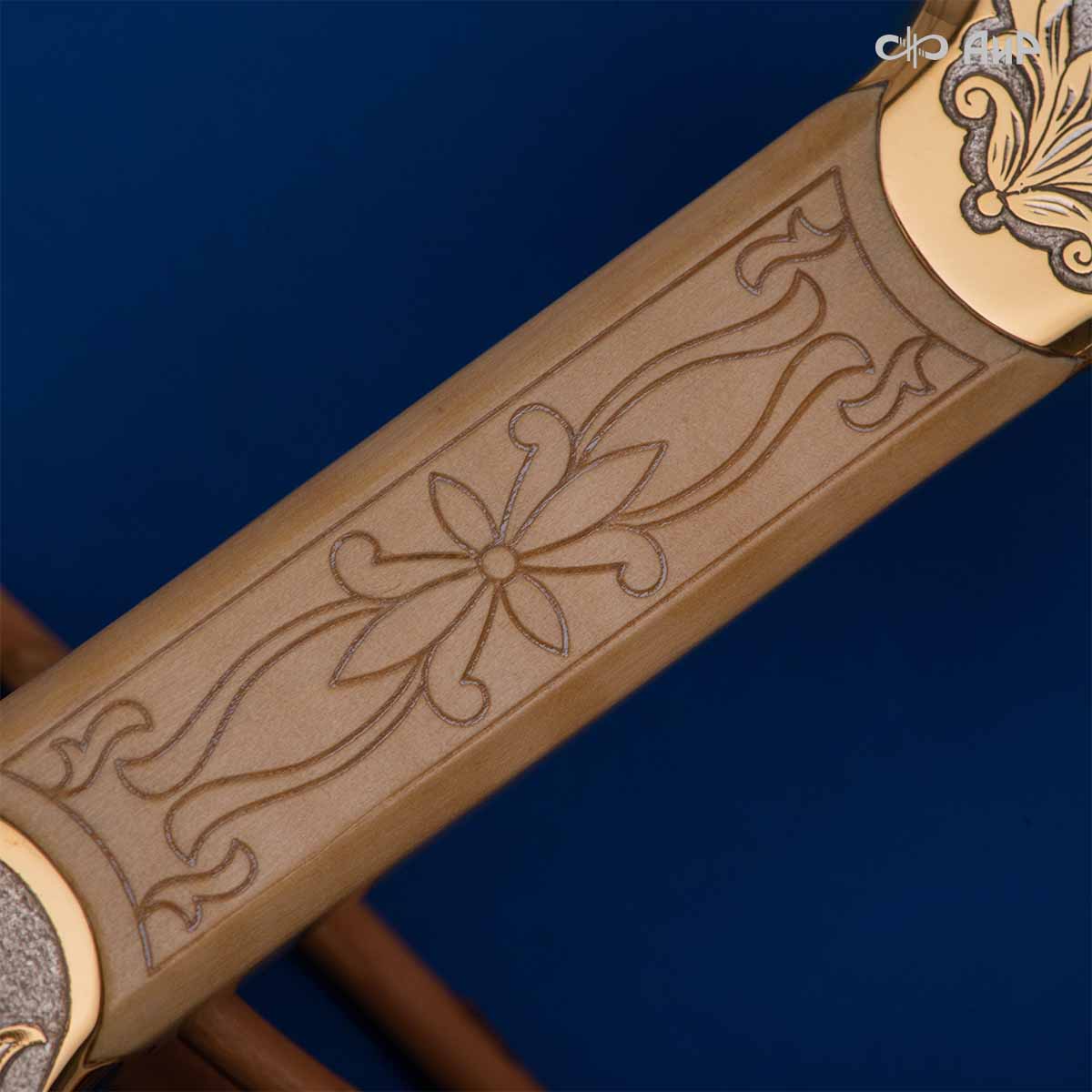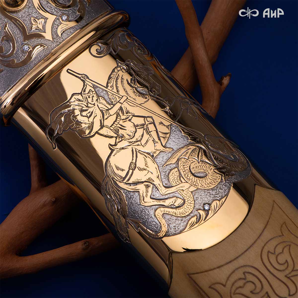 Компания «АиР» изготавливает кинжалы кавказского типа, украшенные золотом, серебром или мельхиором. Каждый кинжал – это яркий пример ручной работы и вдохновенного коллективного творчества. Оружейники, художники и граверы компании достойно хранят и развивают златоустовские традиции декорирования металла. В процессе создания каждого изделия соединяются талант, творческий подход и высокий уровень исполнения. Представленный экземпляр богато украшен орнаментом.