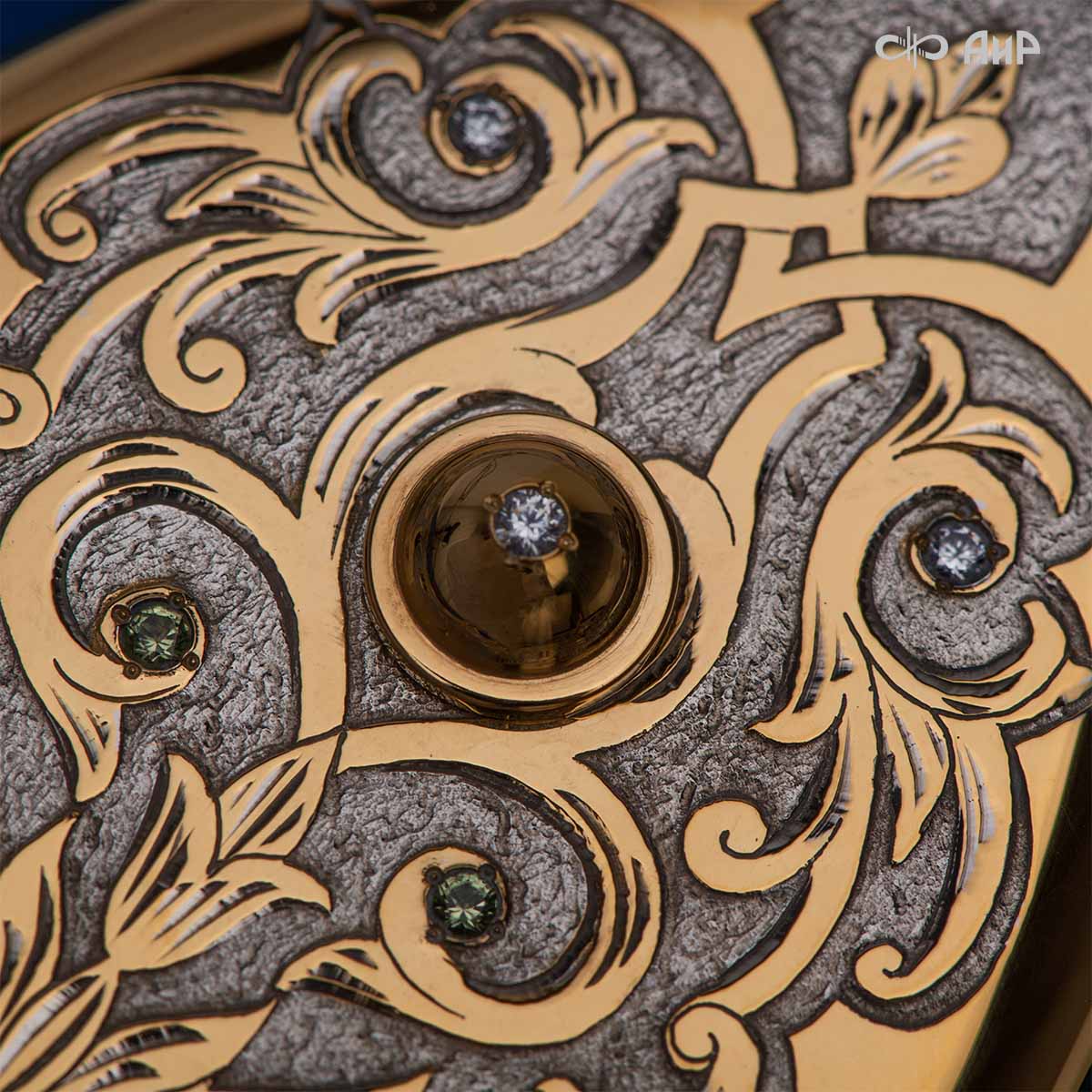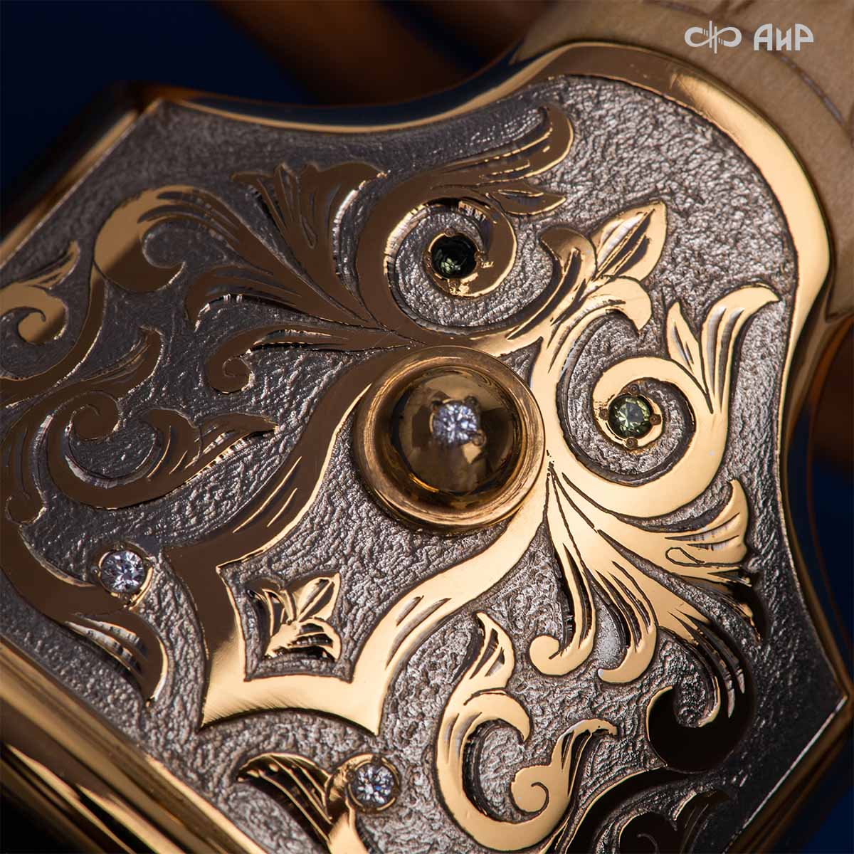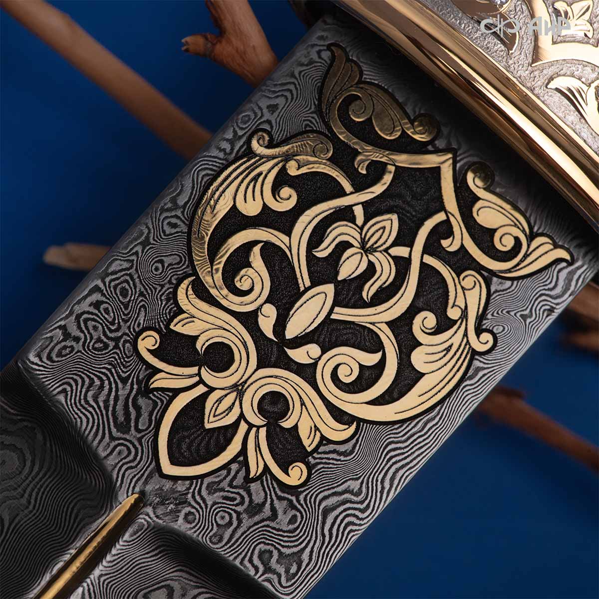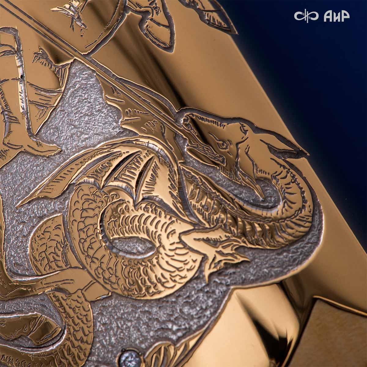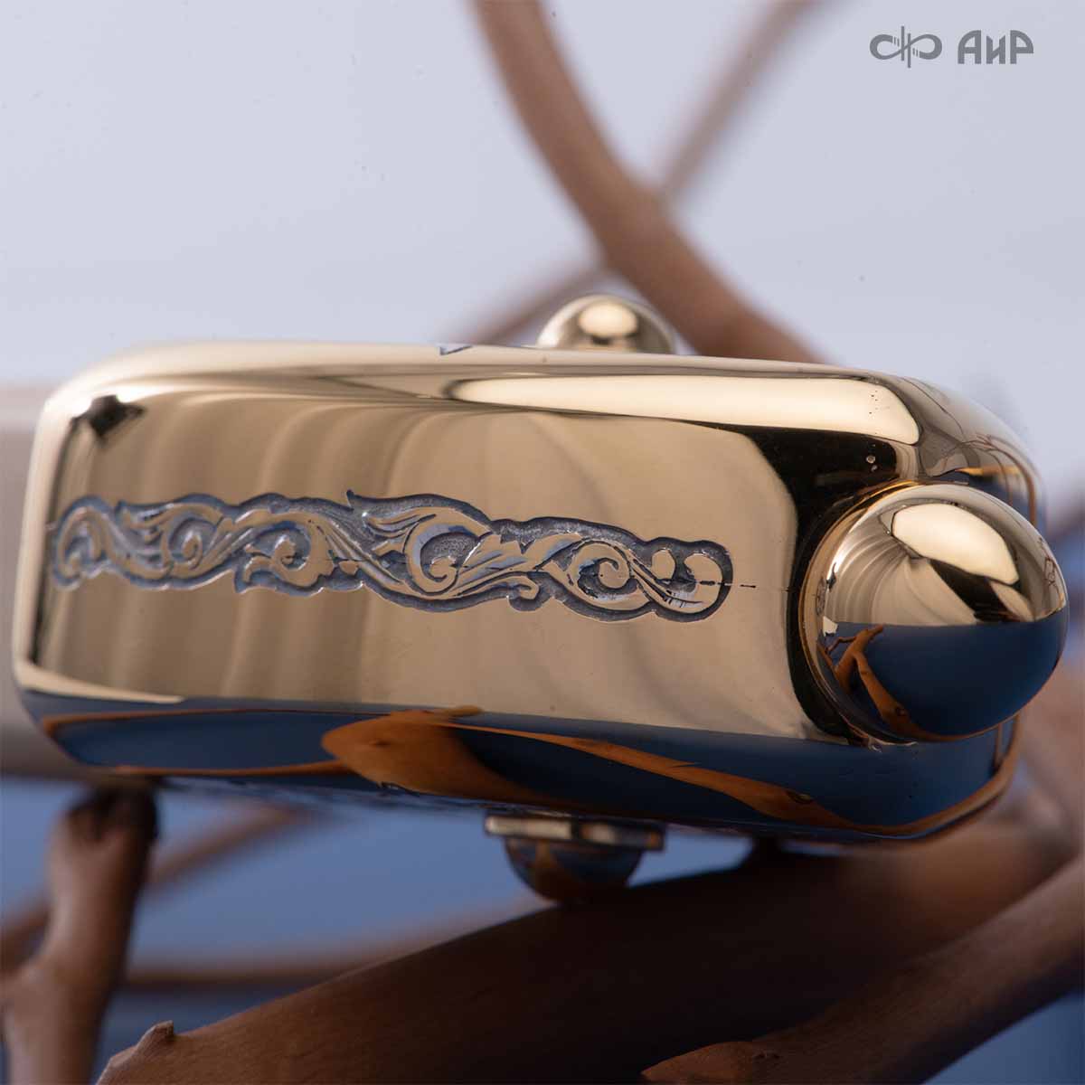 Компания «АиР» изготавливает кинжалы кавказского типа, украшенные золотом, серебром или мельхиором. Каждый кинжал – это яркий пример ручной работы и вдохновенного коллективного творчества. Оружейники, художники и граверы компании достойно хранят и развивают златоустовские традиции декорирования металла. В процессе создания каждого изделия соединяются талант, творческий подход и высокий уровень исполнения. Представленный экземпляр богато украшен орнаментом.