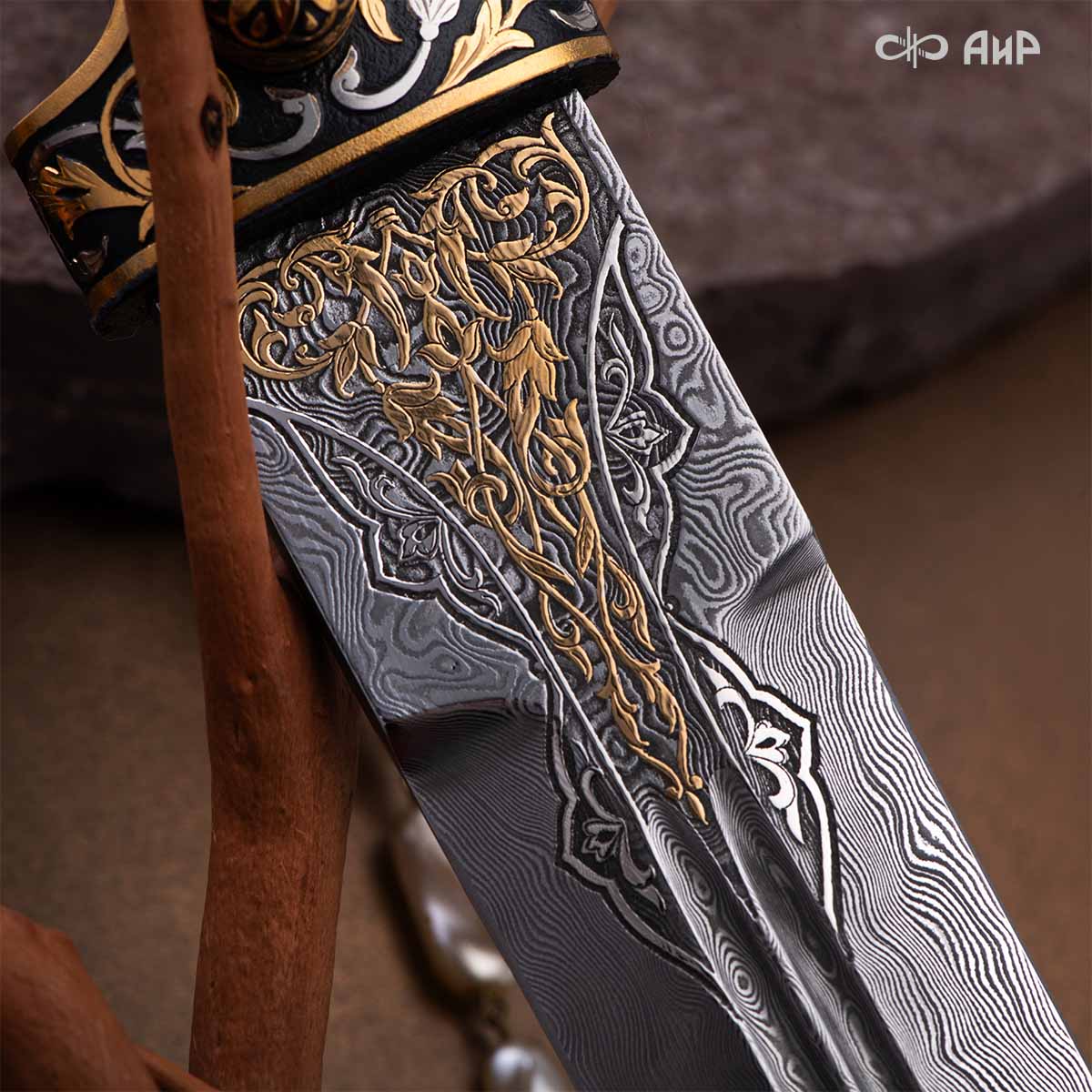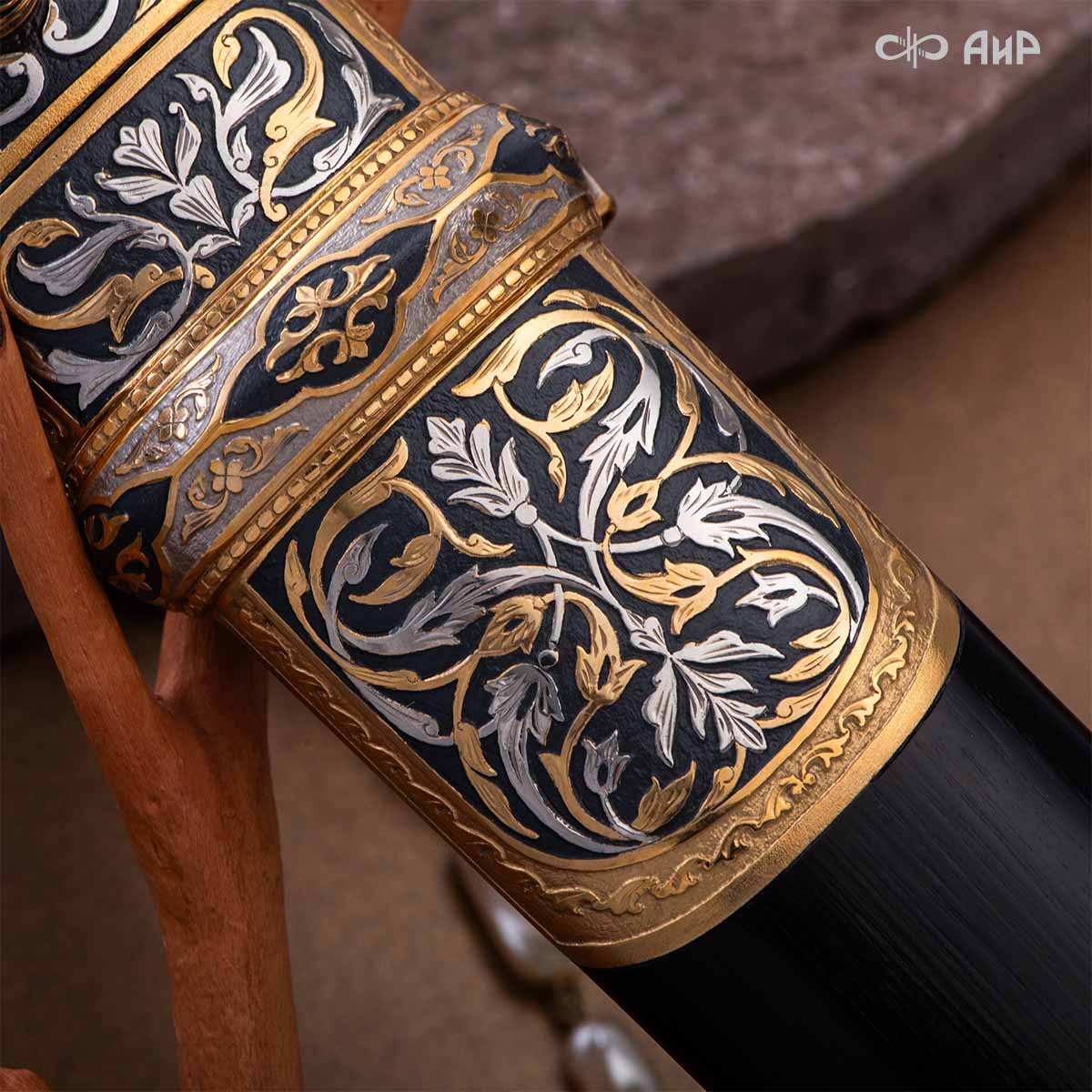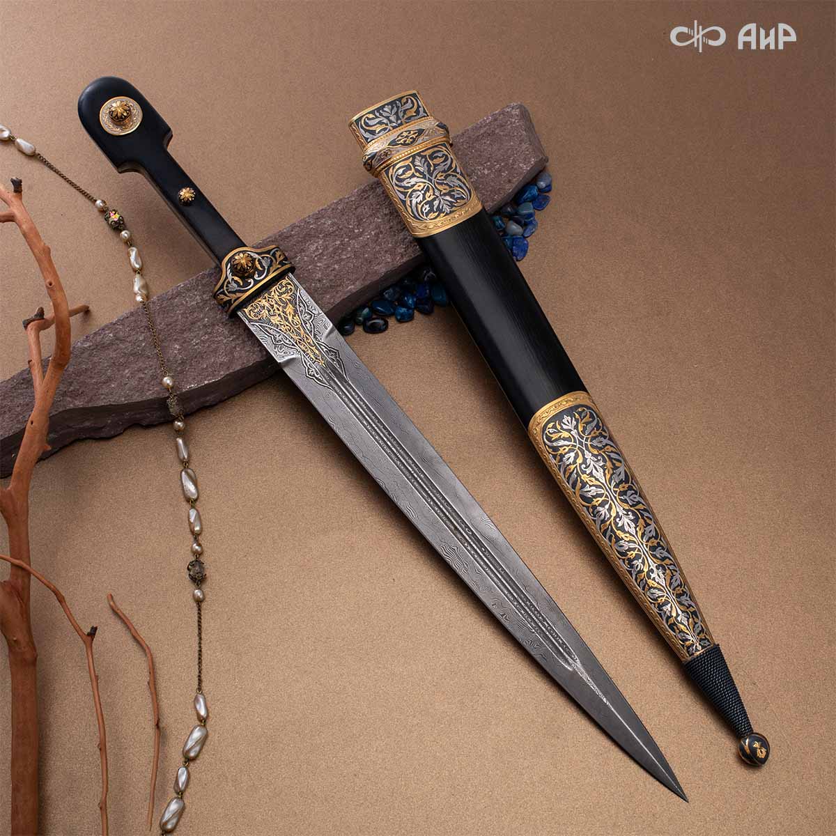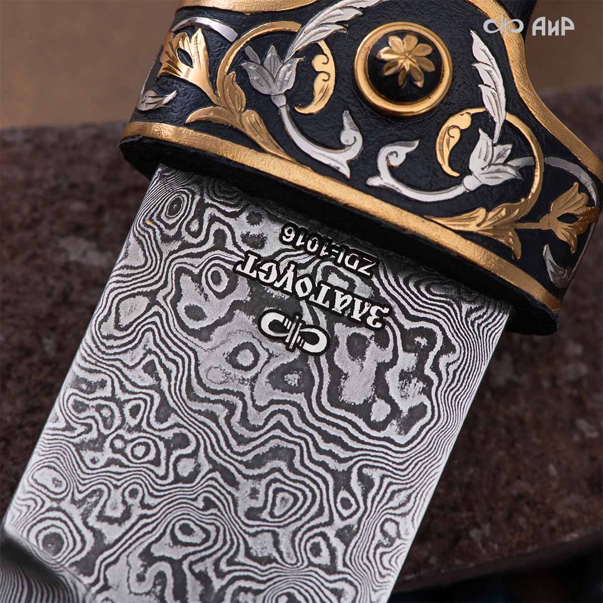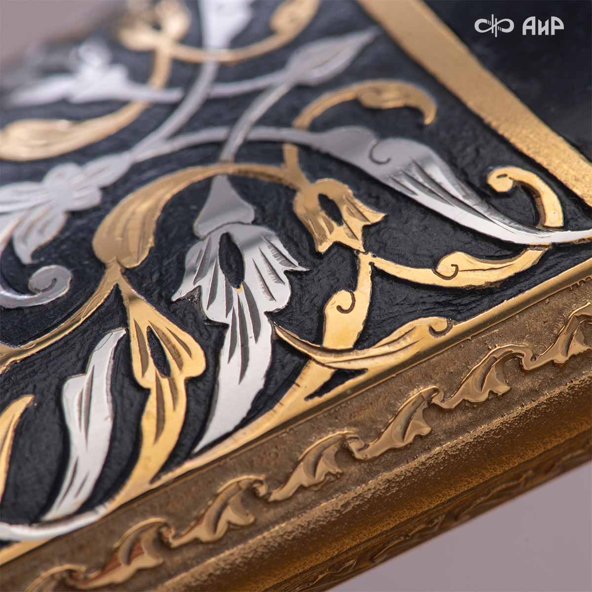 Компания «АиР» изготавливает кинжалы кавказского типа, украшенные золотом, серебром или мельхиором. Каждый кинжал – это яркий пример ручной работы и вдохновенного коллективного творчества. Оружейники, художники и граверы компании достойно хранят и развивают златоустовские традиции декорирования металла. В процессе создания каждого изделия соединяются талант, творческий подход и высокий уровень исполнения. Представленный экземпляр богато украшен орнаментом.