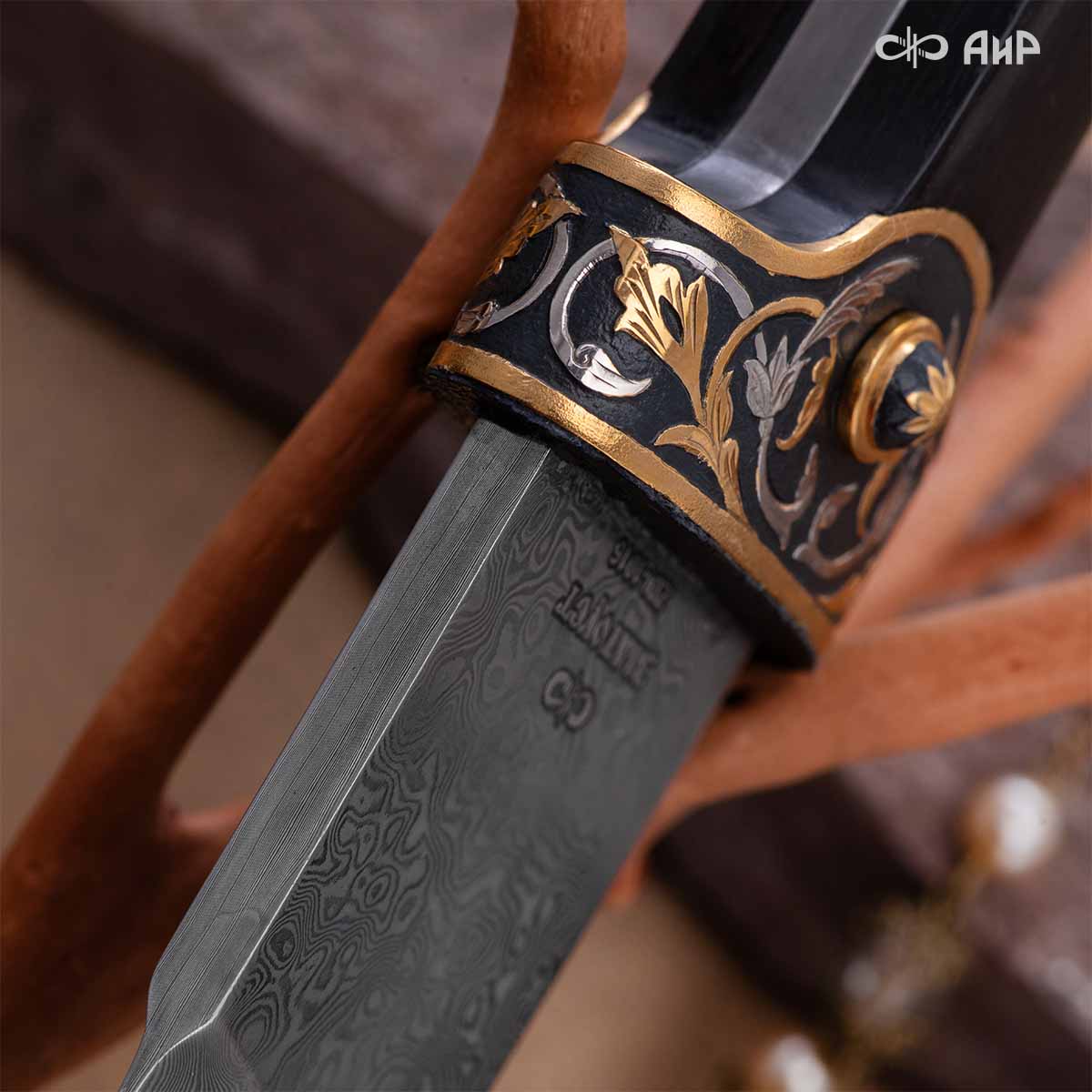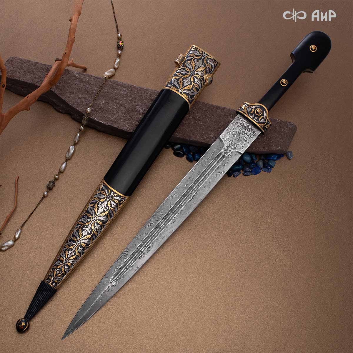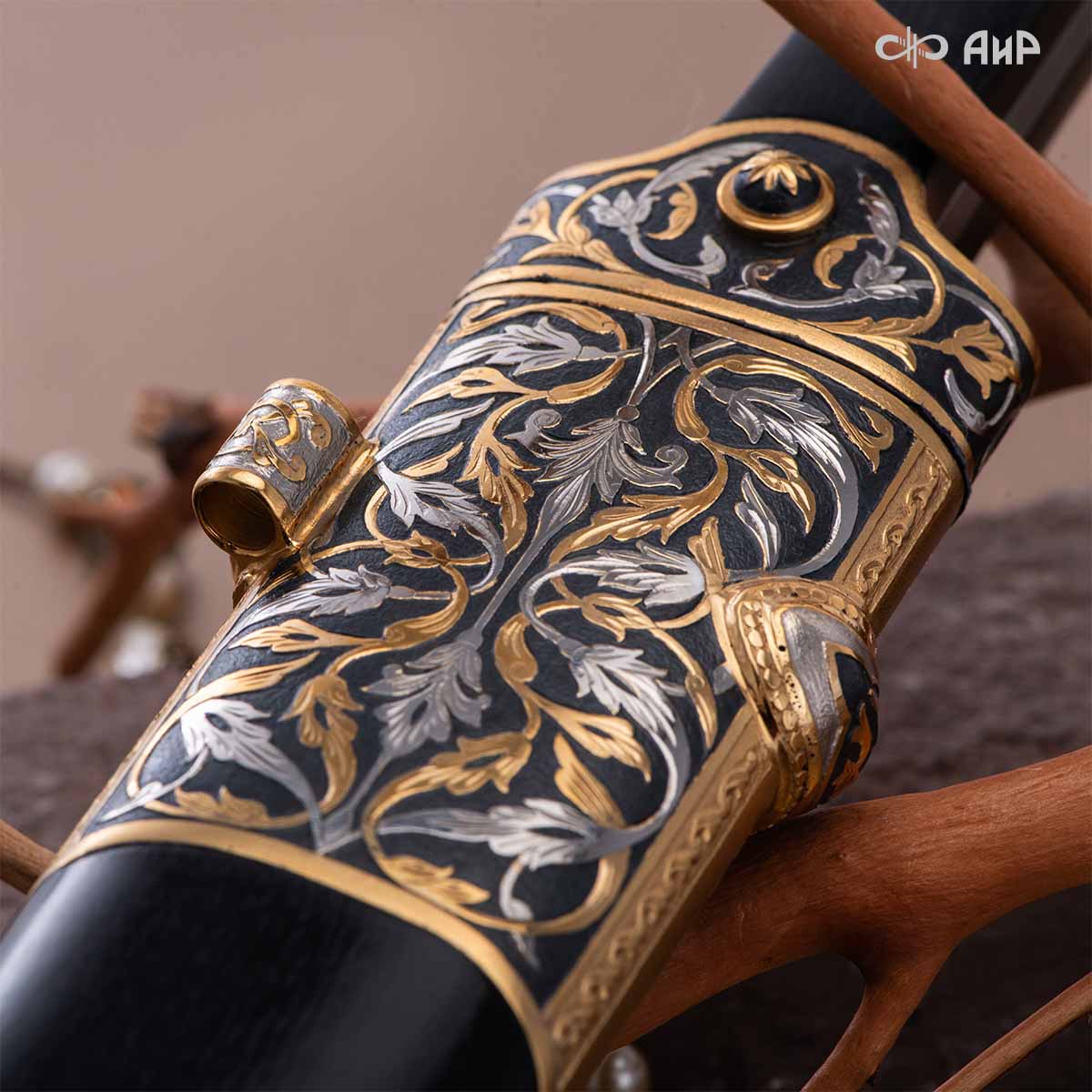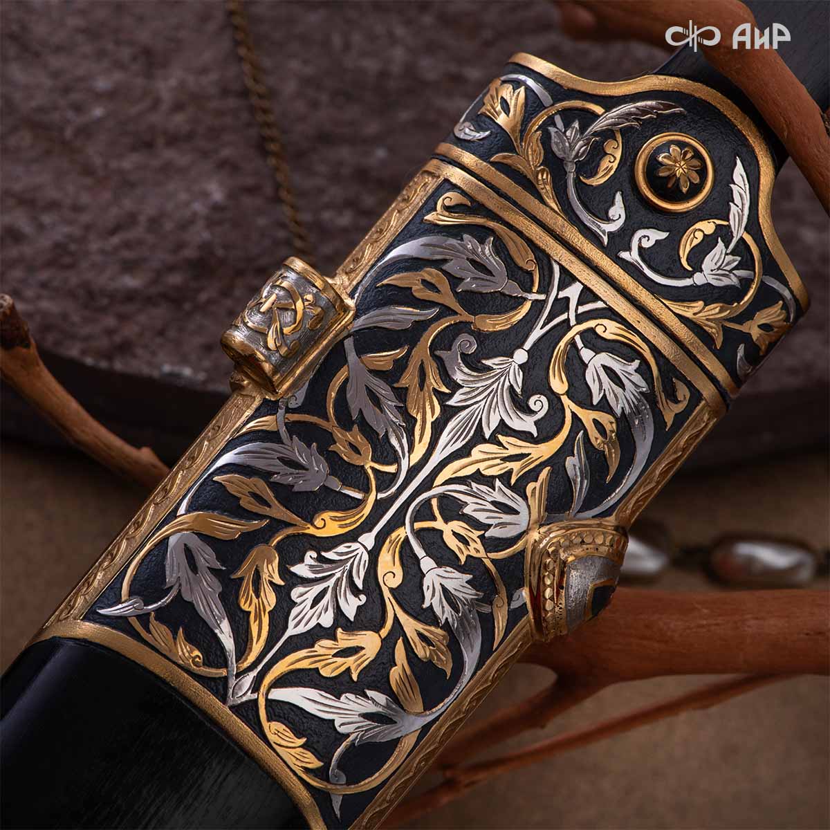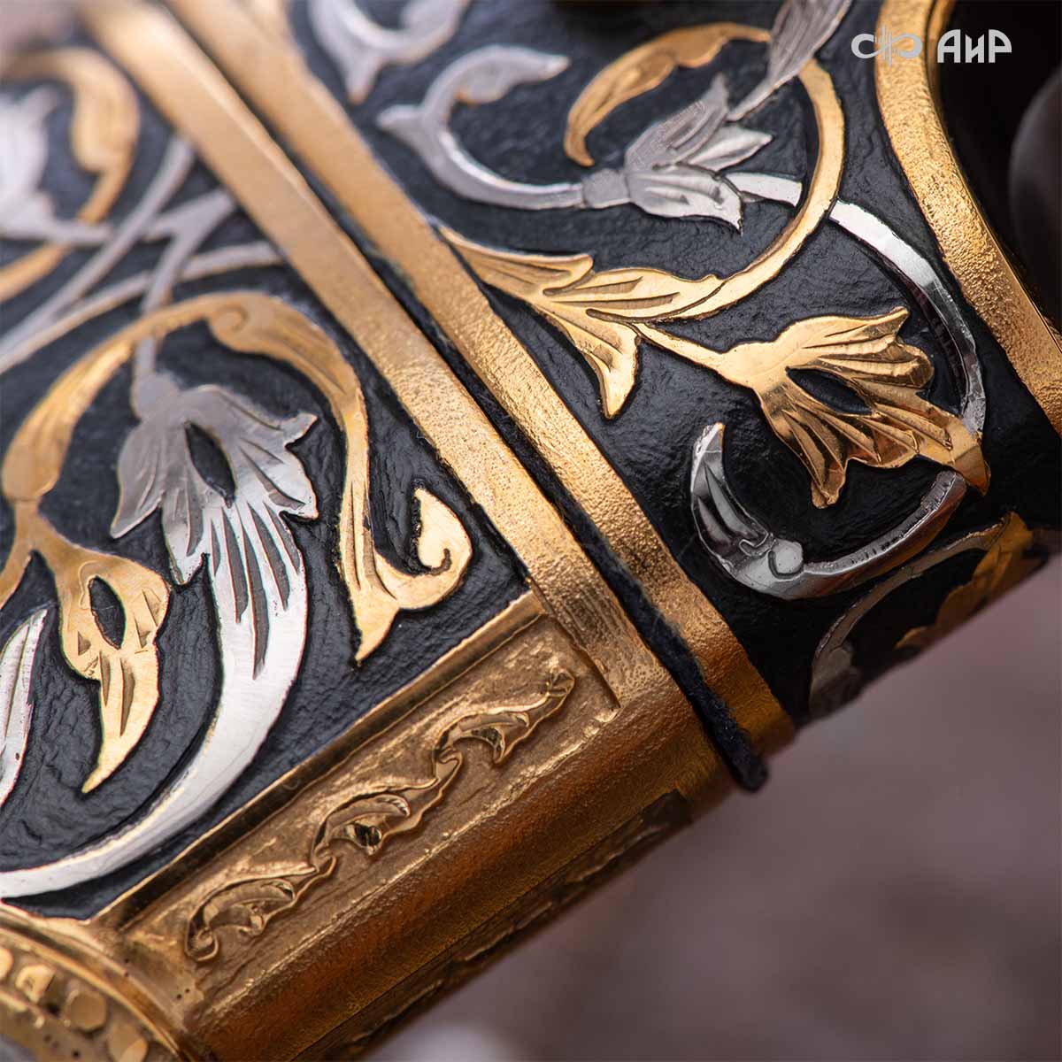 Компания «АиР» изготавливает кинжалы кавказского типа, украшенные золотом, серебром или мельхиором. Каждый кинжал – это яркий пример ручной работы и вдохновенного коллективного творчества. Оружейники, художники и граверы компании достойно хранят и развивают златоустовские традиции декорирования металла. В процессе создания каждого изделия соединяются талант, творческий подход и высокий уровень исполнения. Представленный экземпляр богато украшен орнаментом.
