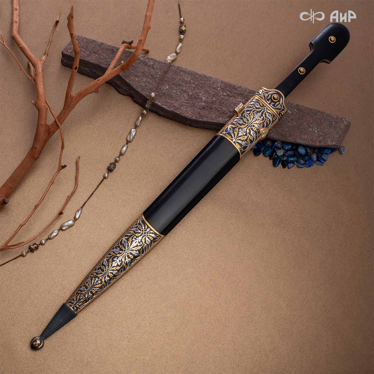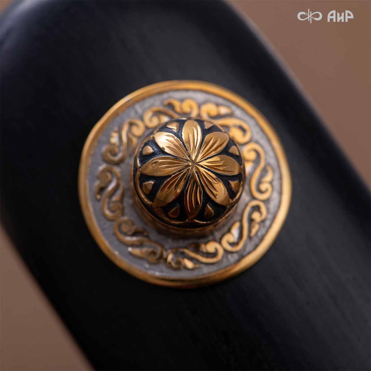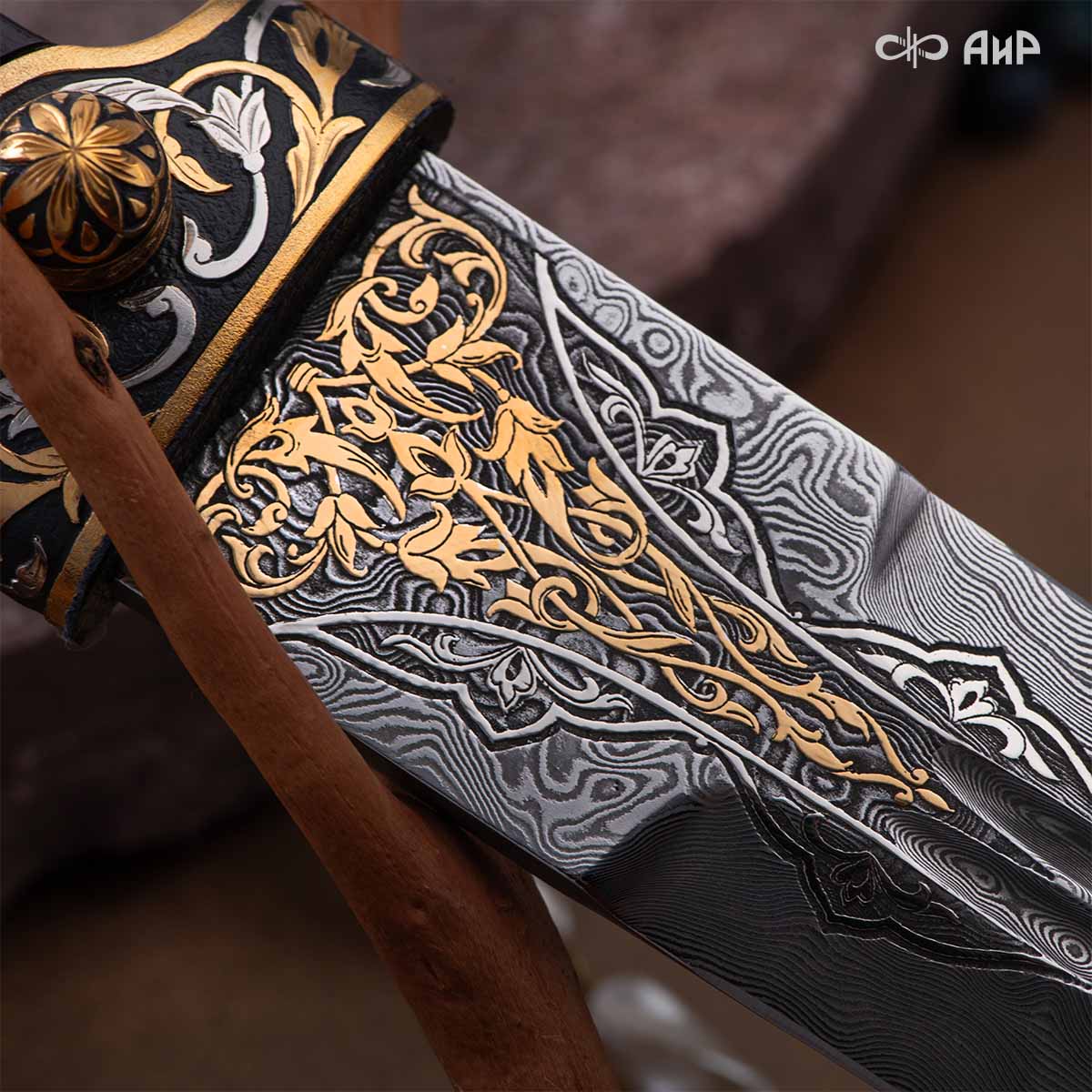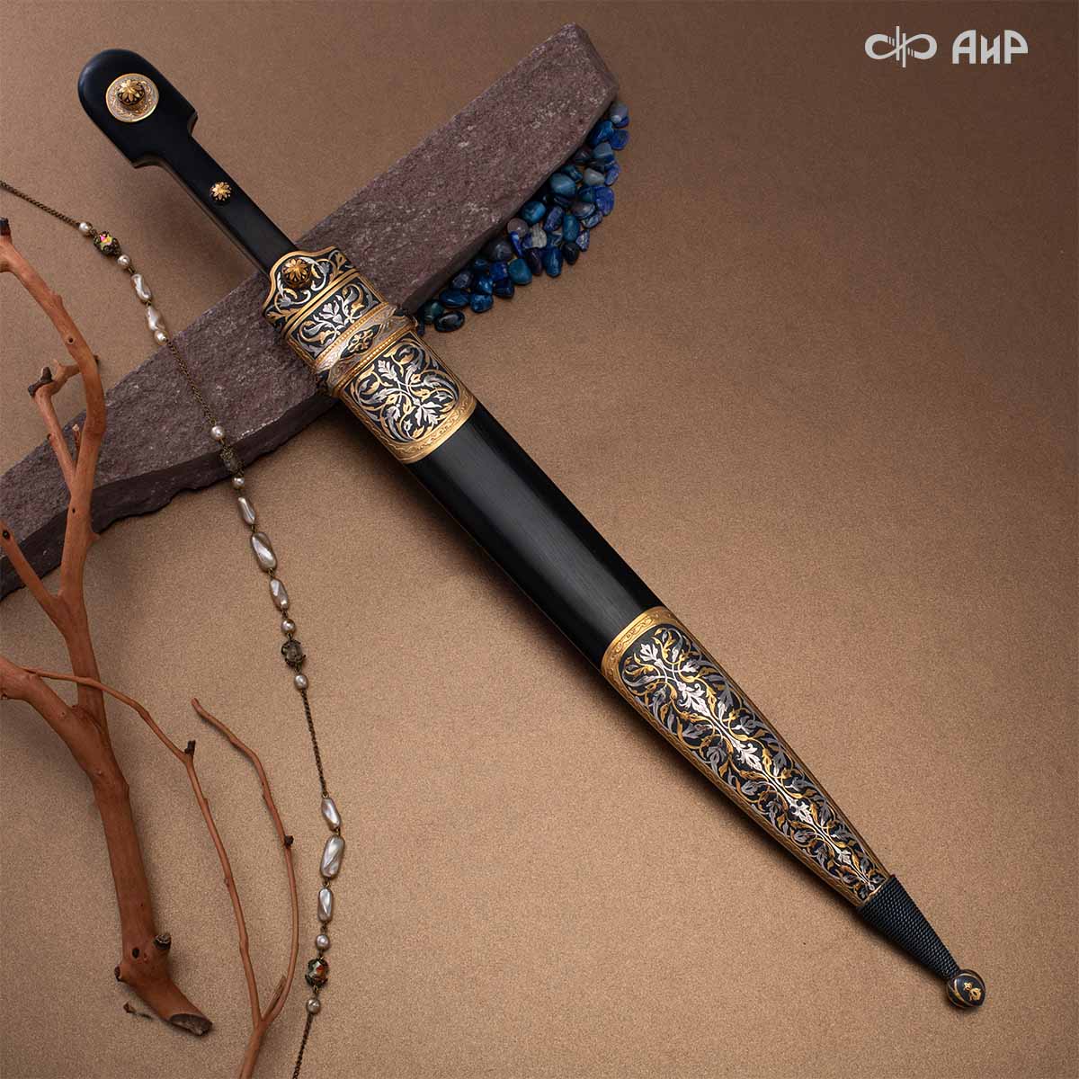 Компания «АиР» изготавливает кинжалы кавказского типа, украшенные золотом, серебром или мельхиором. Каждый кинжал – это яркий пример ручной работы и вдохновенного коллективного творчества. Оружейники, художники и граверы компании достойно хранят и развивают златоустовские традиции декорирования металла. В процессе создания каждого изделия соединяются талант, творческий подход и высокий уровень исполнения. Представленный экземпляр богато украшен орнаментом.