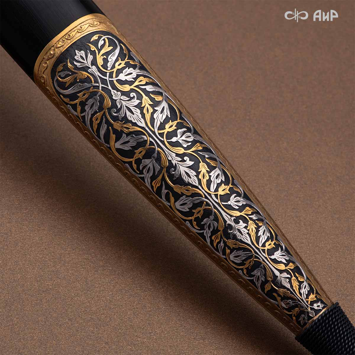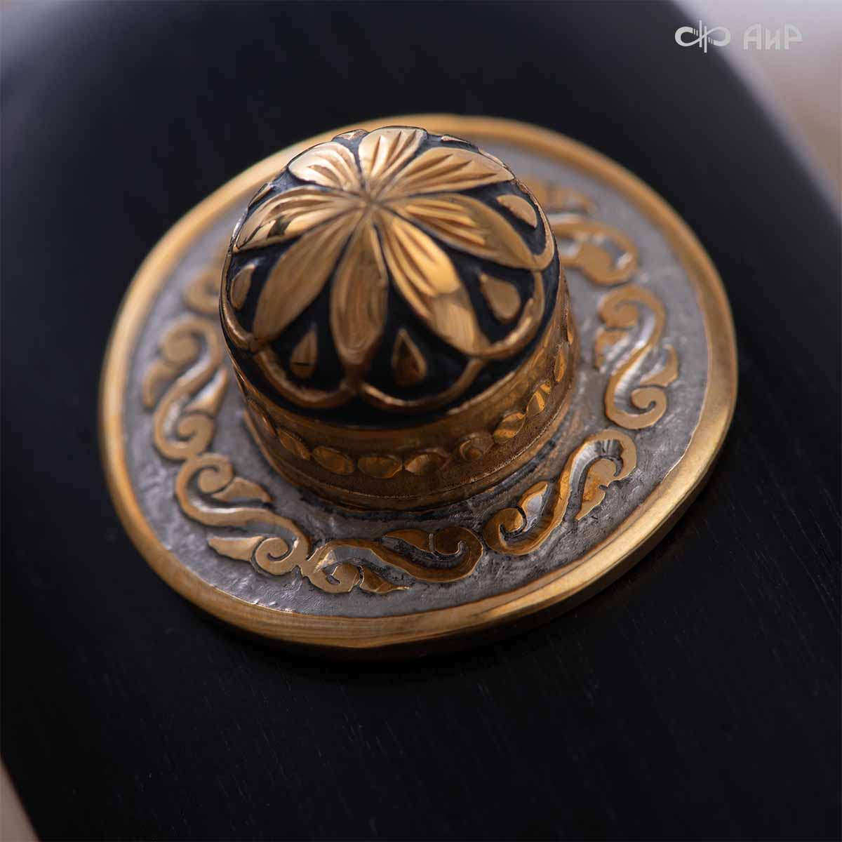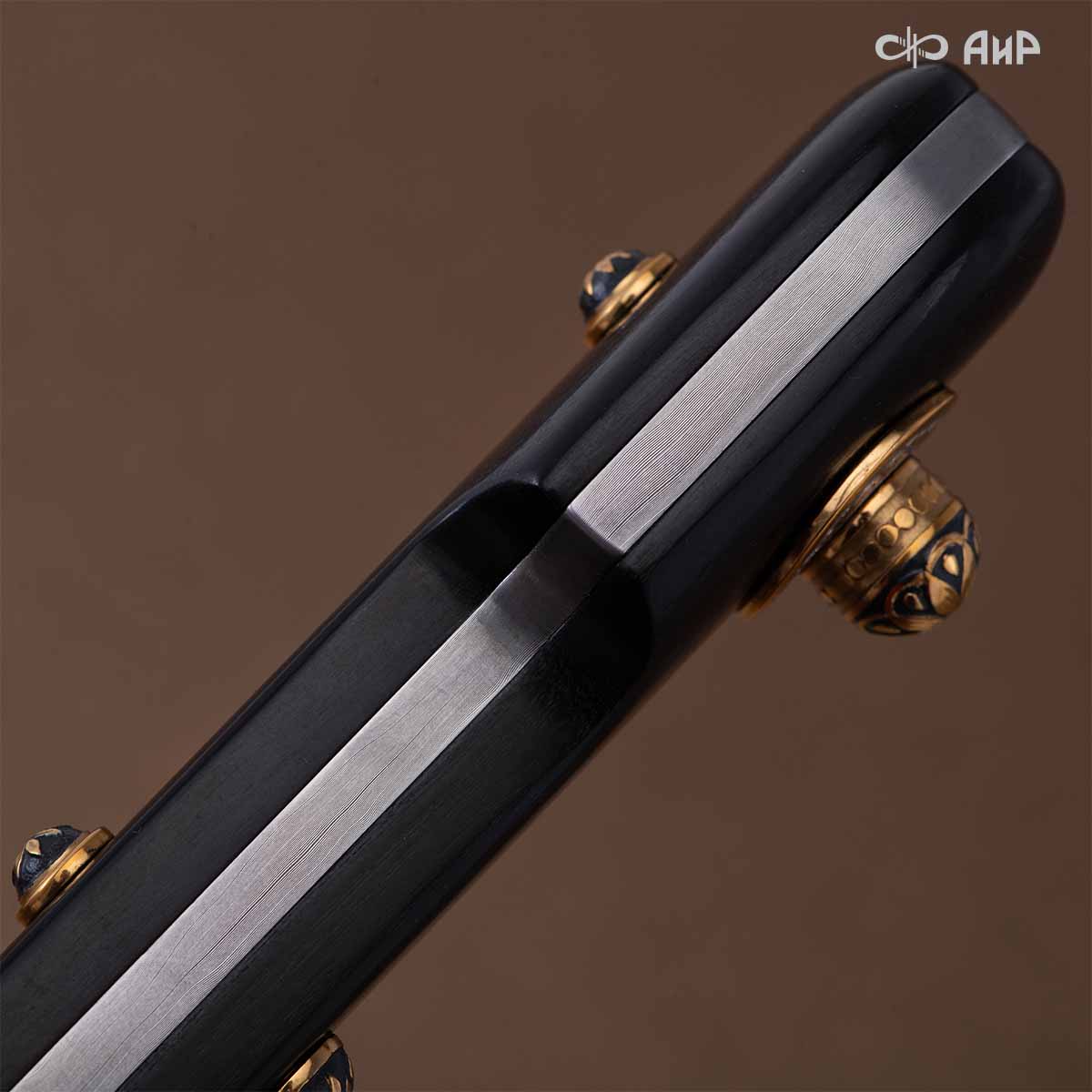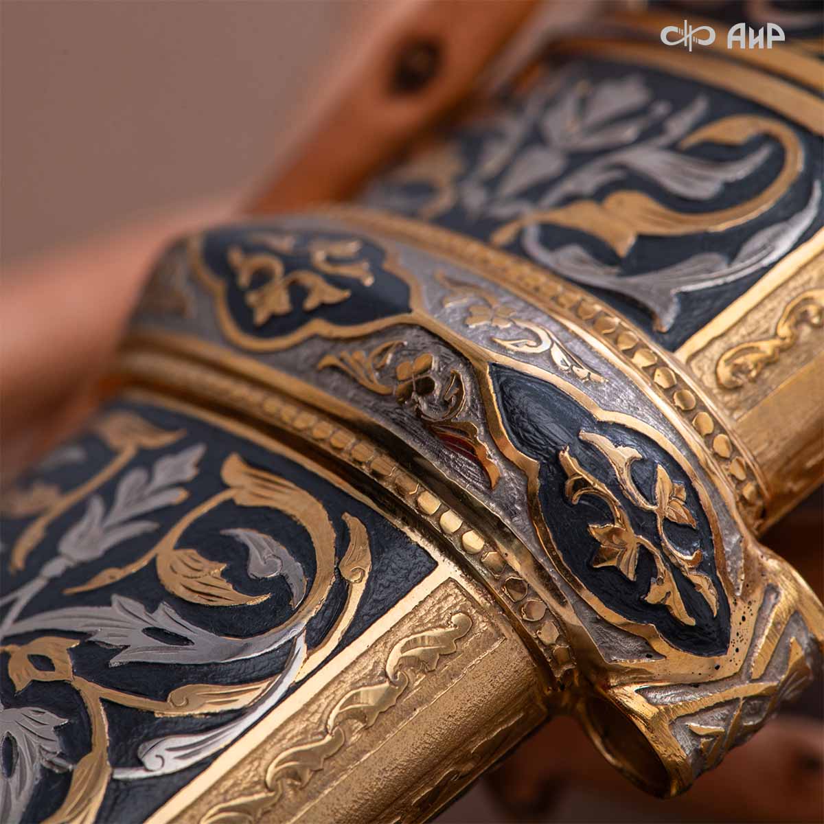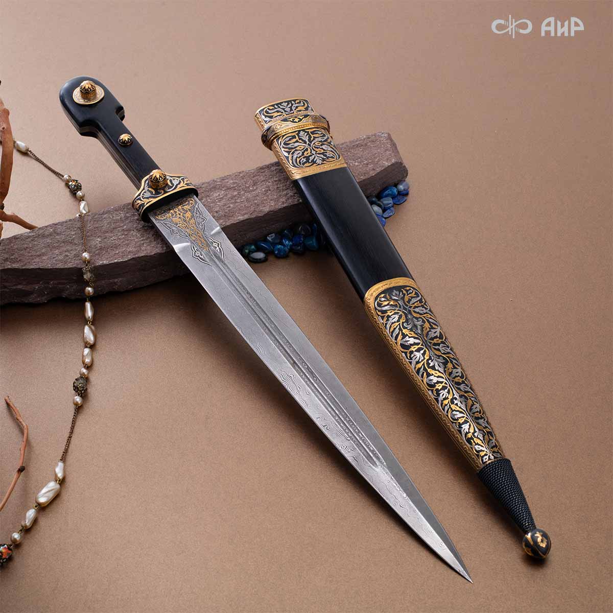 Компания «АиР» изготавливает кинжалы кавказского типа, украшенные золотом, серебром или мельхиором. Каждый кинжал – это яркий пример ручной работы и вдохновенного коллективного творчества. Оружейники, художники и граверы компании достойно хранят и развивают златоустовские традиции декорирования металла. В процессе создания каждого изделия соединяются талант, творческий подход и высокий уровень исполнения. Представленный экземпляр богато украшен орнаментом.