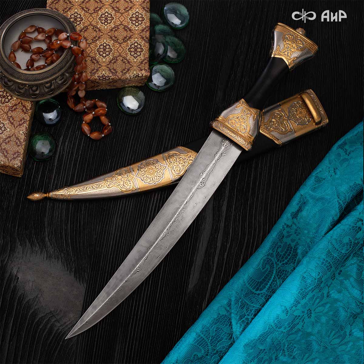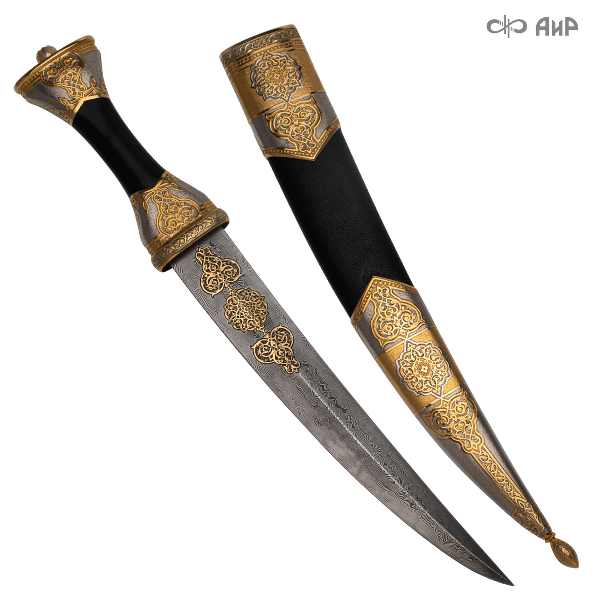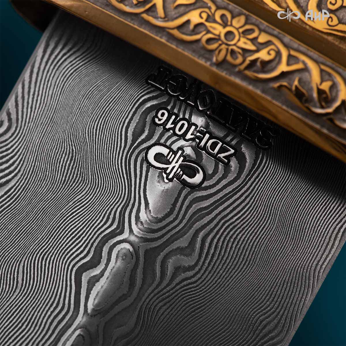 Кинжал восточного типа из дамасской стали, украшенный золотом – подарок, символизирующий харизму, силу и мужественность своего обладателя. Срок изготовления 25-40 рабочих дней, 100% предоплата.