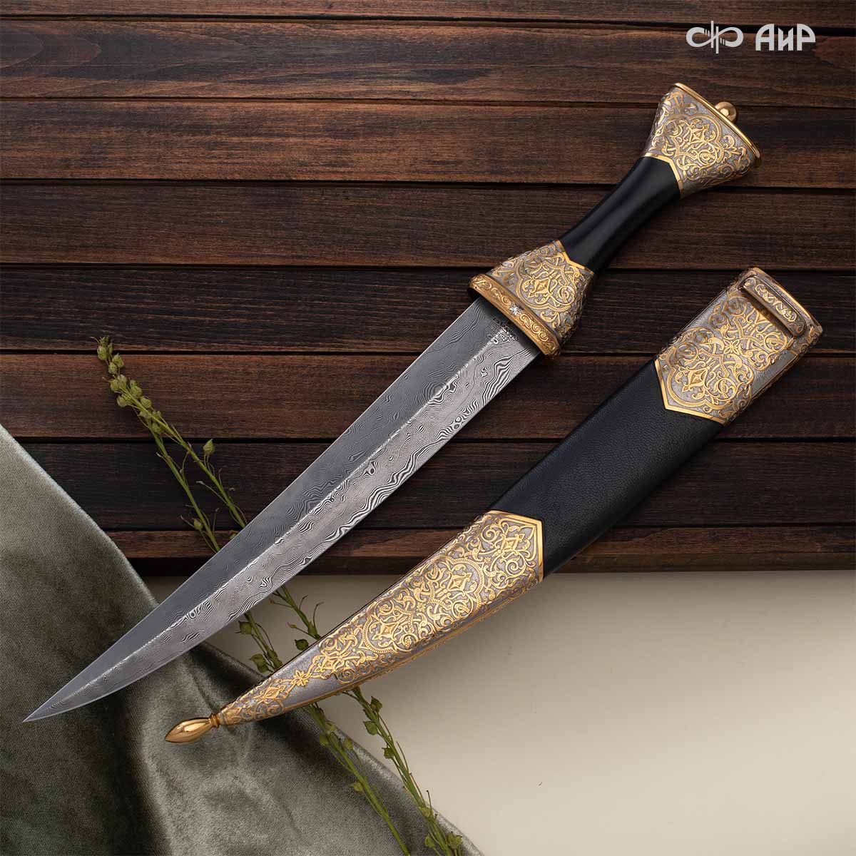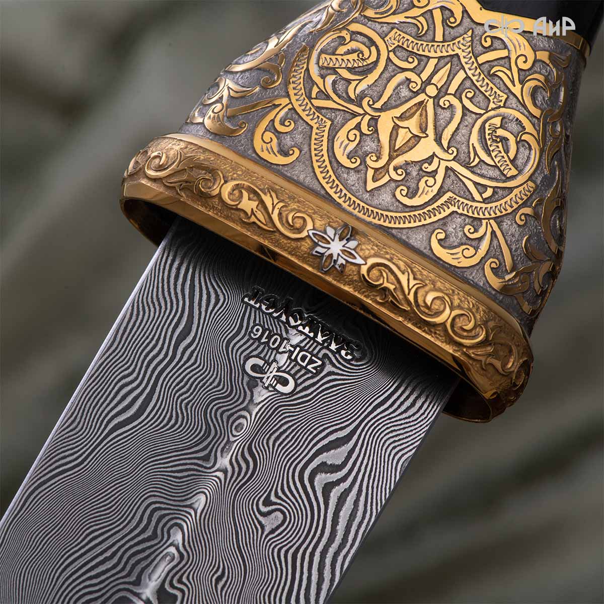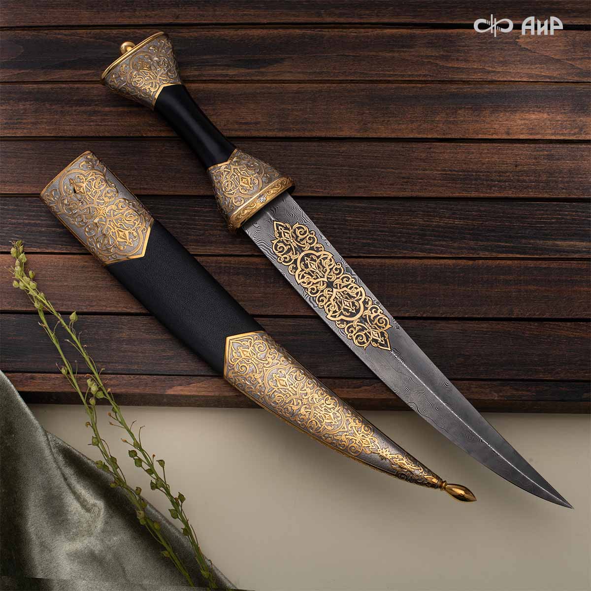 Кинжал восточного типа из дамасской стали, украшенный золотом – подарок, символизирующий харизму, силу и мужественность своего обладателя. Срок изготовления 25-40 рабочих дней, 100% предоплата.