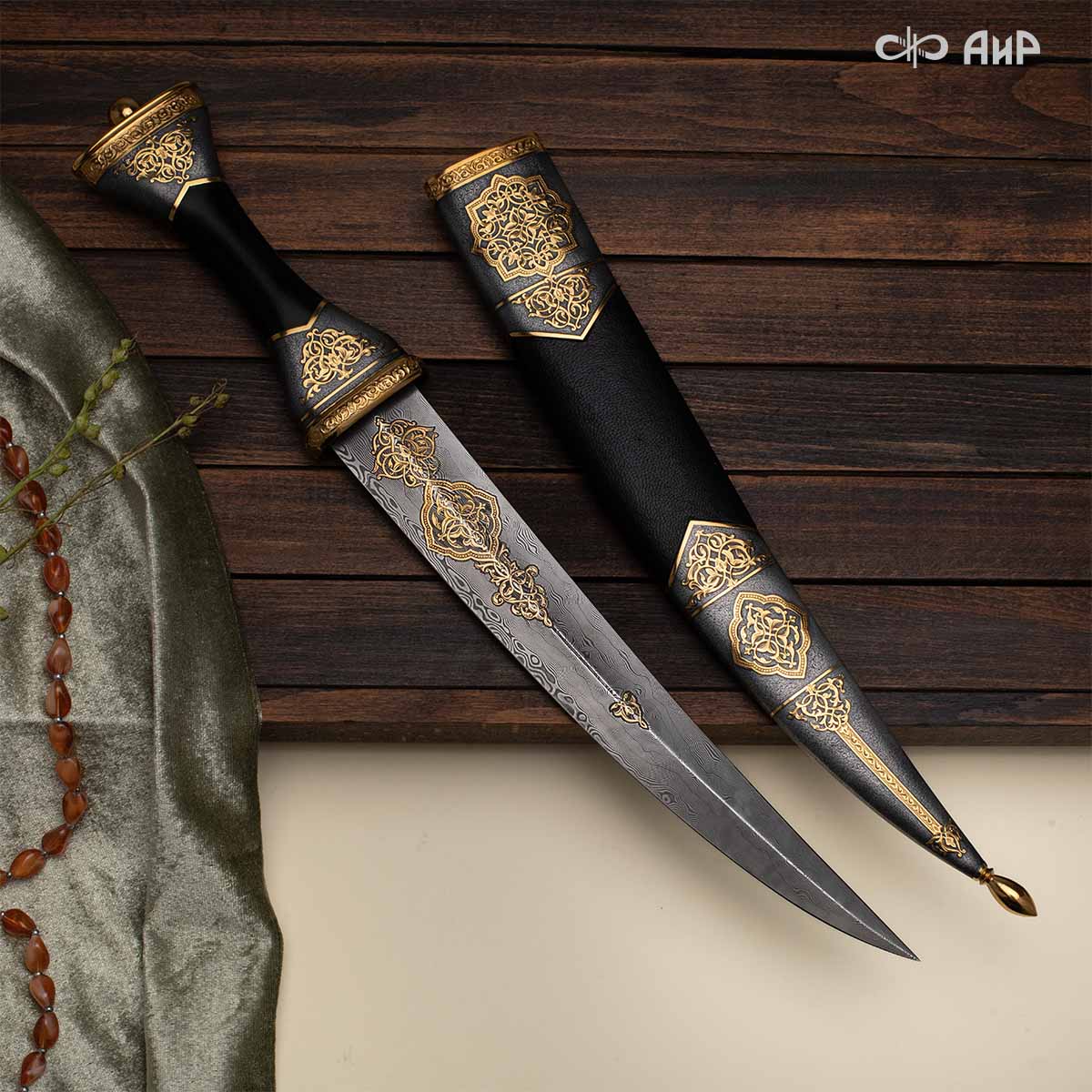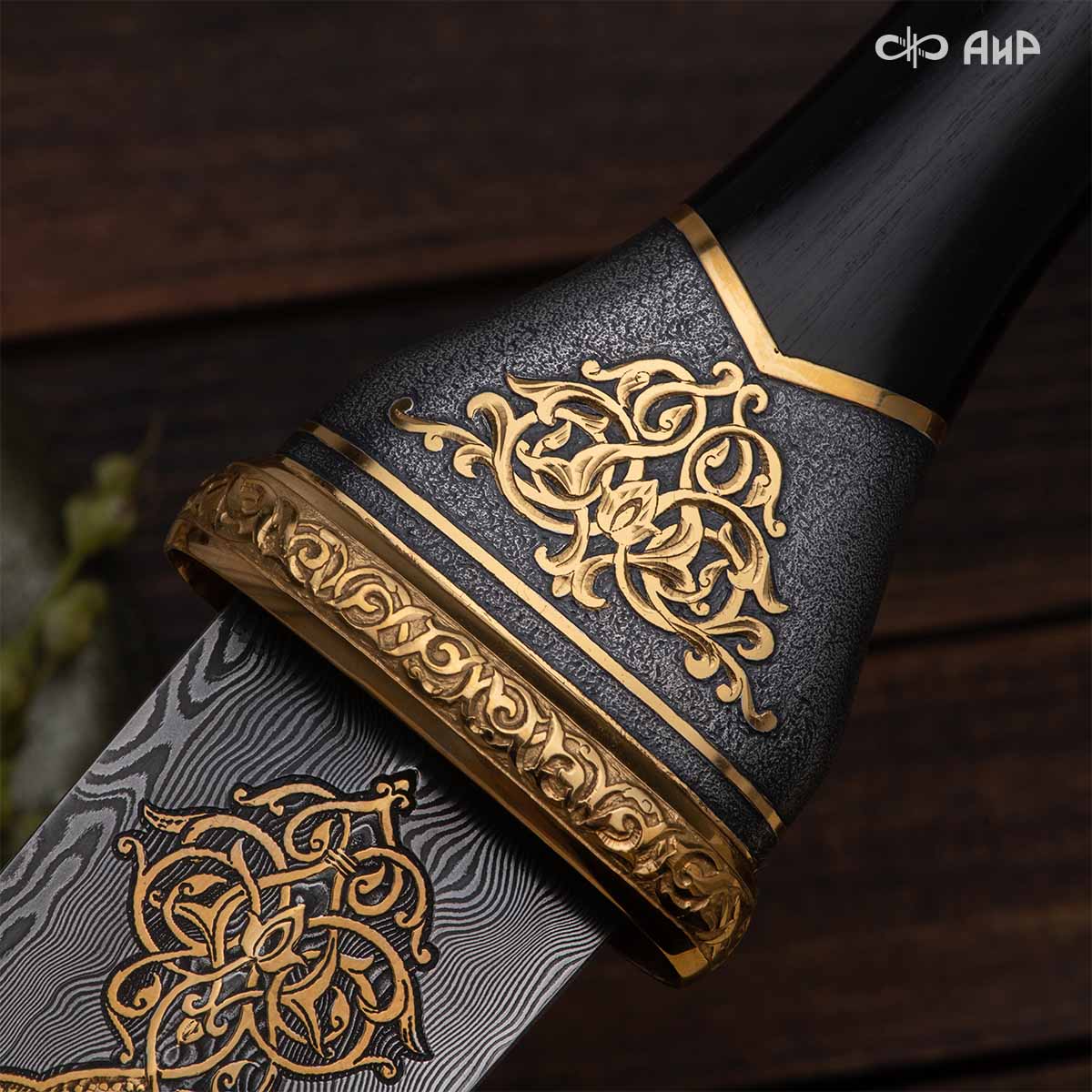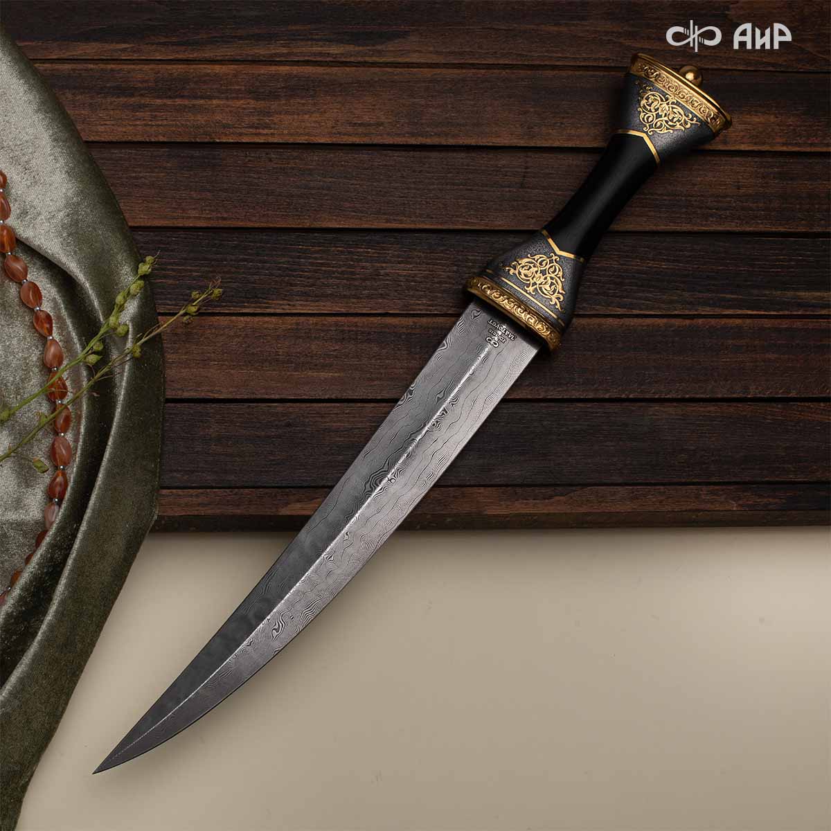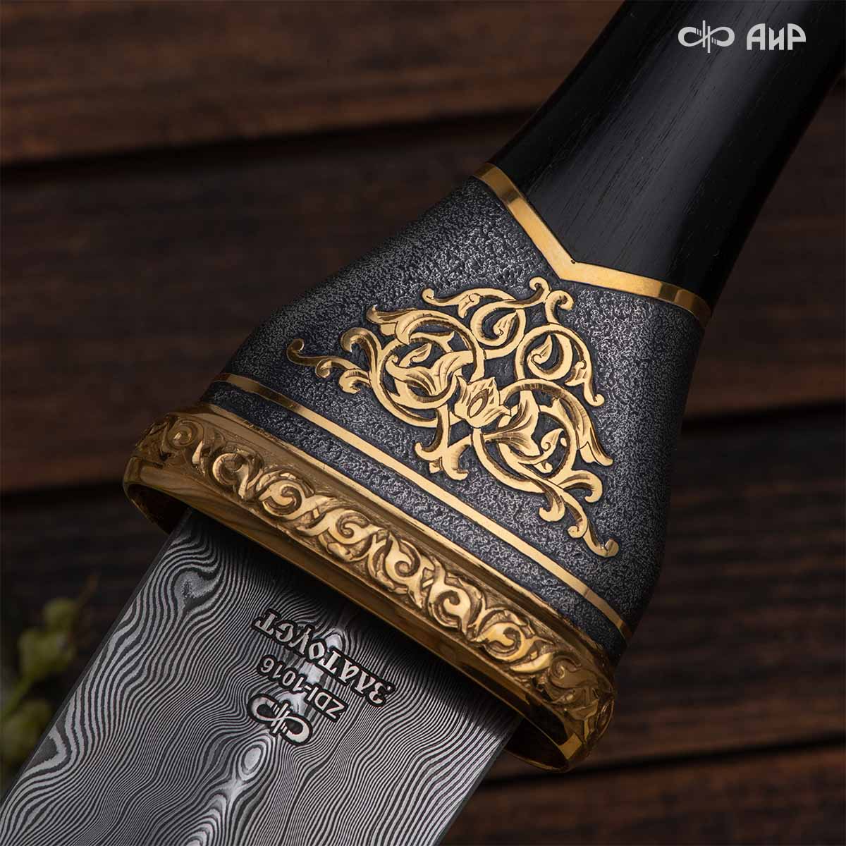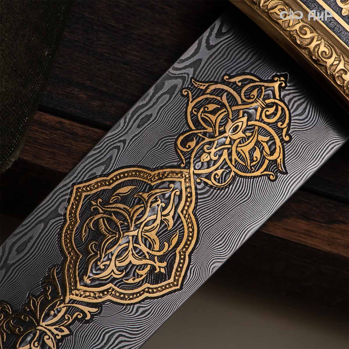 Кинжал восточного типа из дамасской стали, украшенный золотом – подарок, символизирующий харизму, силу и мужественность своего обладателя. Срок изготовления 25-40 рабочих дней, 100% предоплата.