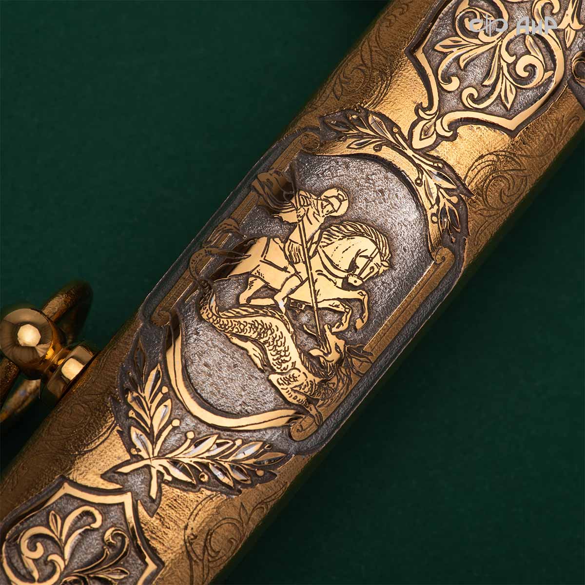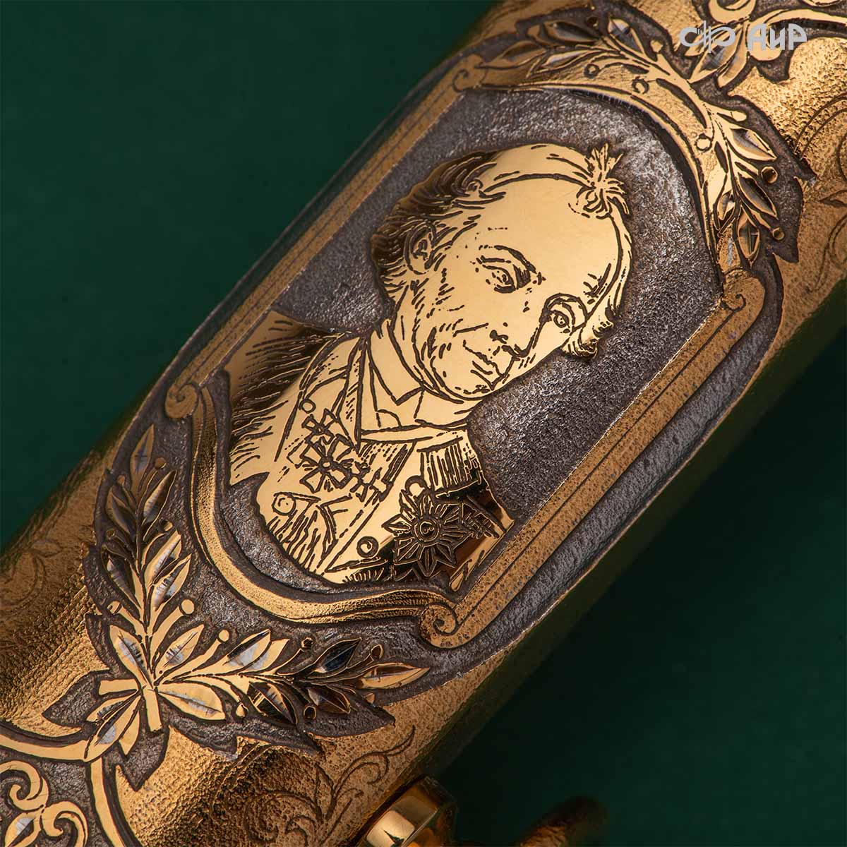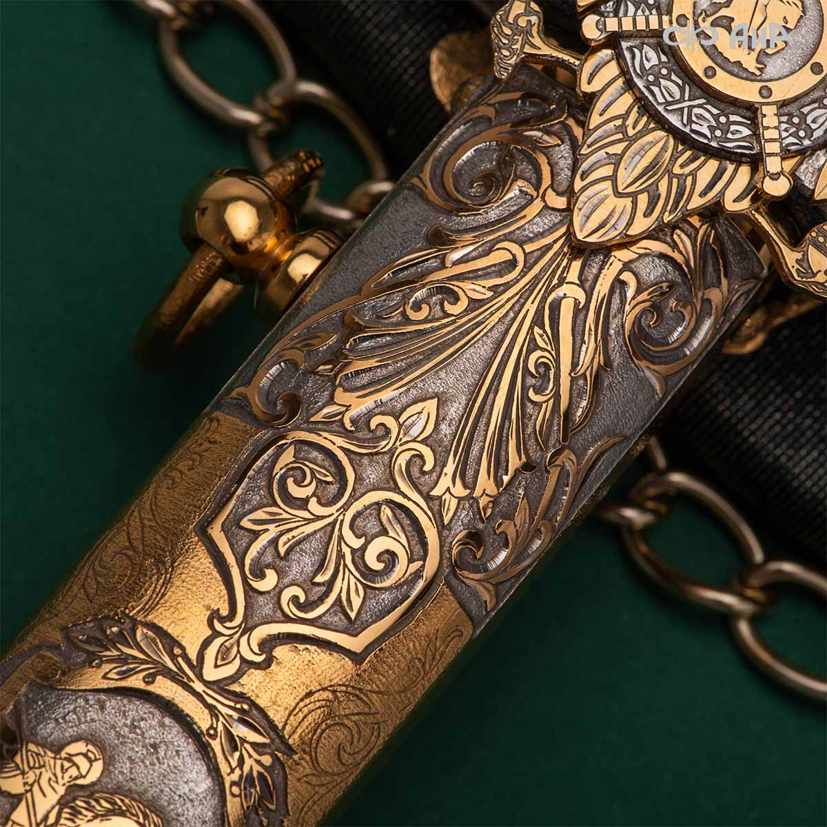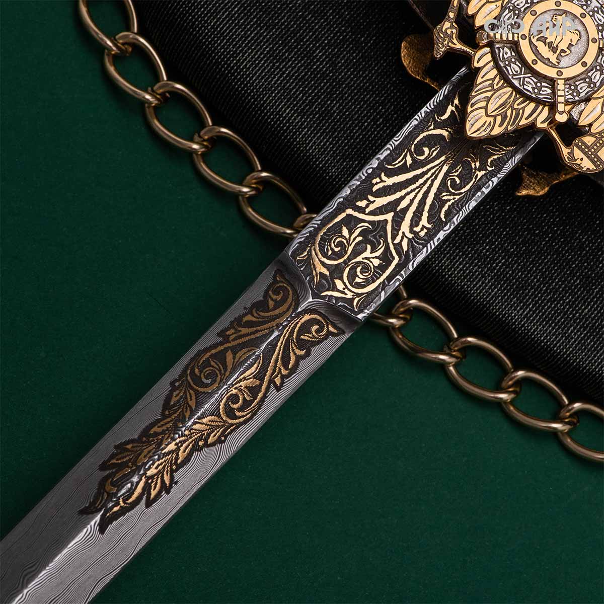 Кортик – великолепный подарок для человека, профессионально занятого в военном деле, для любого мужчины, в котором жив патриотический дух, кто интересуется историей своего государства. Данный кортик украшен изображениями Георгия Победоносца и русского полководца, генералиссимуса Александра Васильевича Суворова.