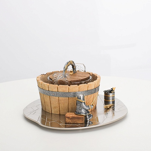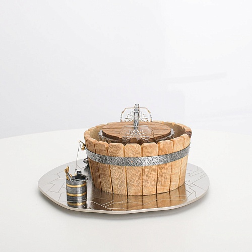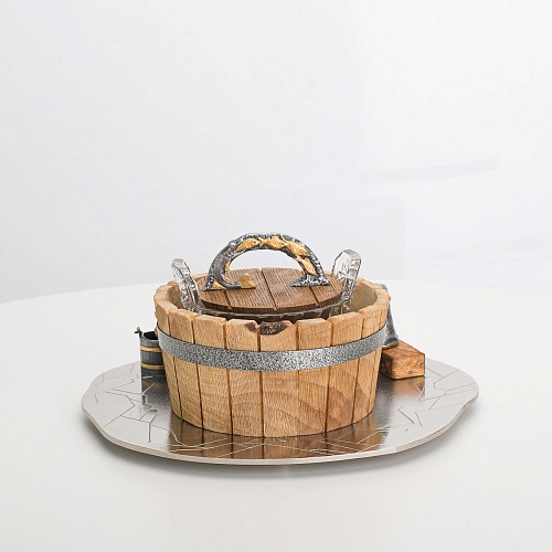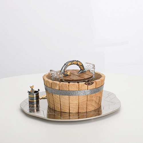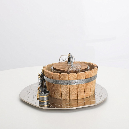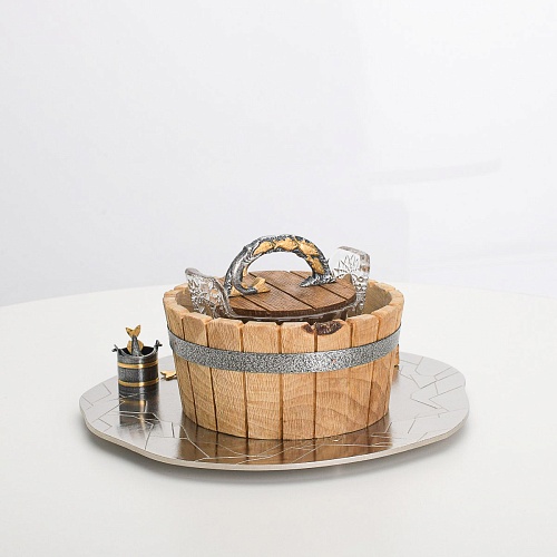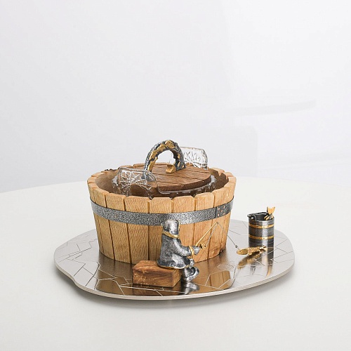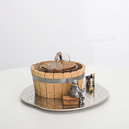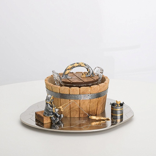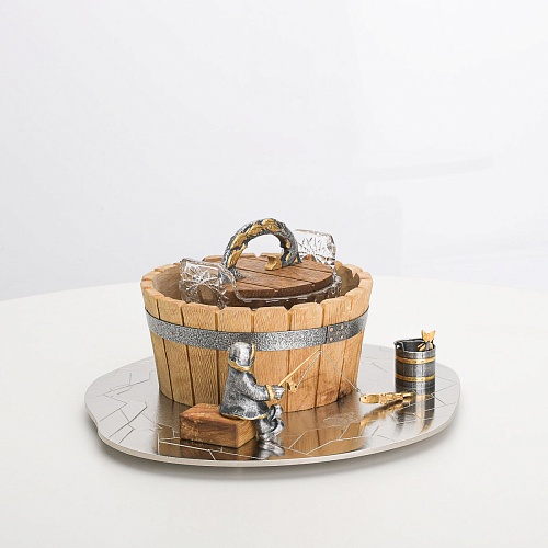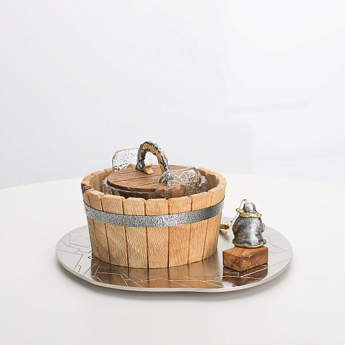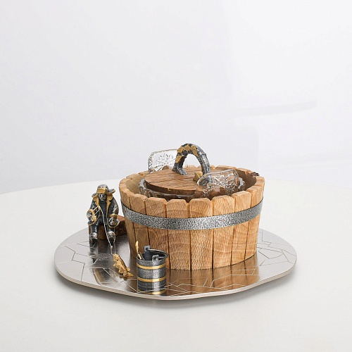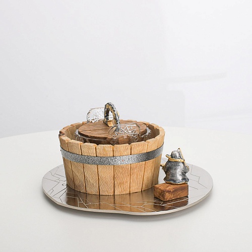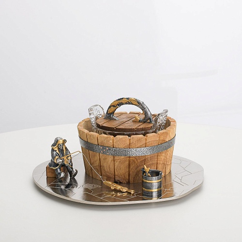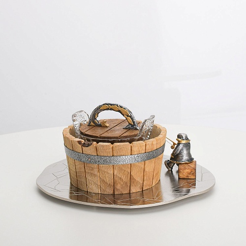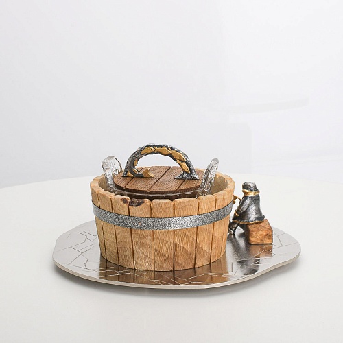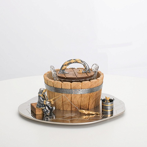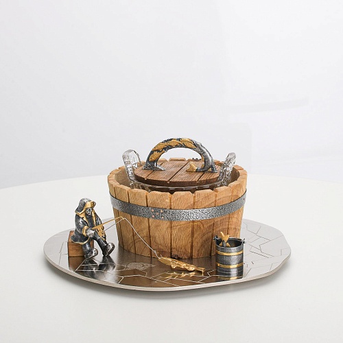 Икорница "Емеля" создана по мотивам русской народной сказки "По щучьему веленью" и носит шутливый характер. В набор икорницы для красной или черной икры входят: хрустальная чаша для икры, деревянная чаша для льда в виде бочонка с крышечкой, подставка для икорницы из металла с фигурками рыбака и осетров.