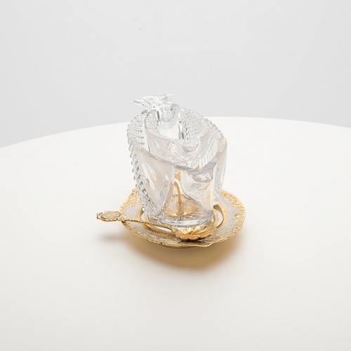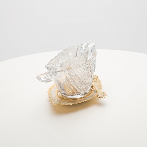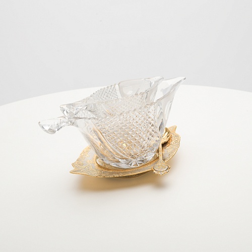 В набор икорницы для черной икры входят: хрустальная чаша с трапециевидным дном для икры, хрустальная чаша для льда, ложечка, подставка для икорницы из металла, подставка для чаши под лед. Подставки и ложечка выполнены в технике златоустовской гравюры на металле, декорированы сюжетами на морскую тематику.