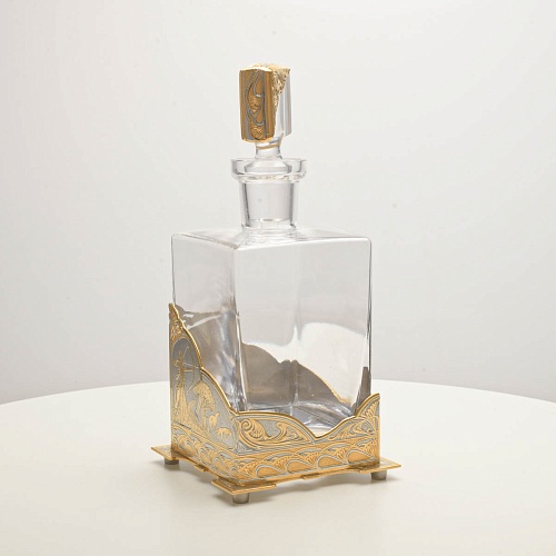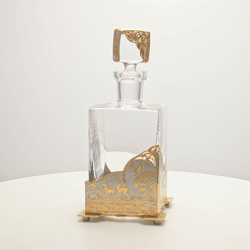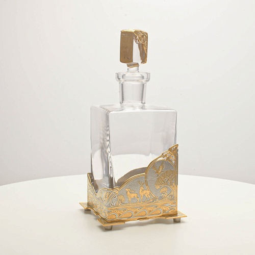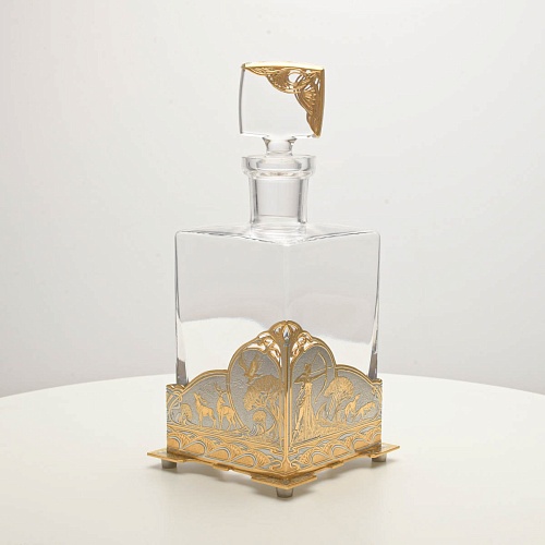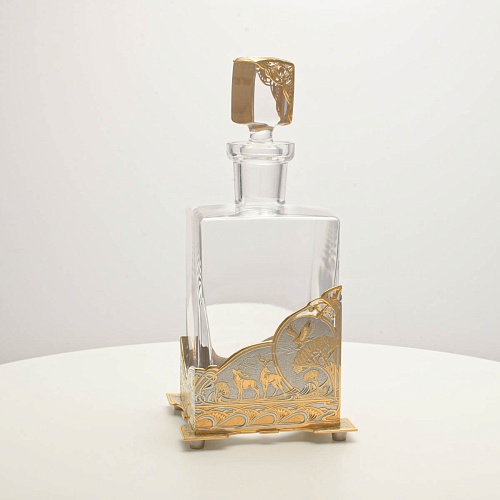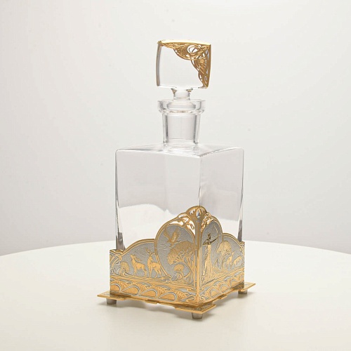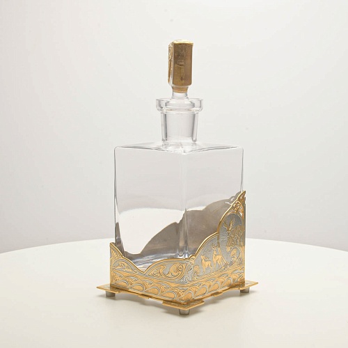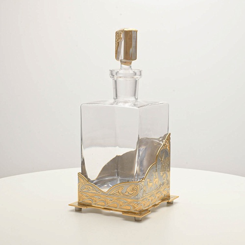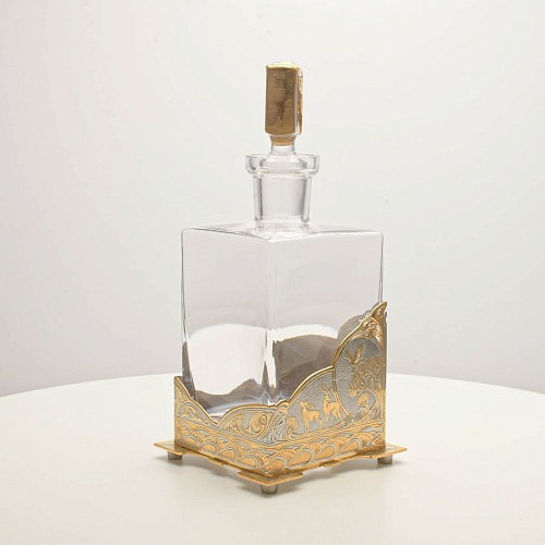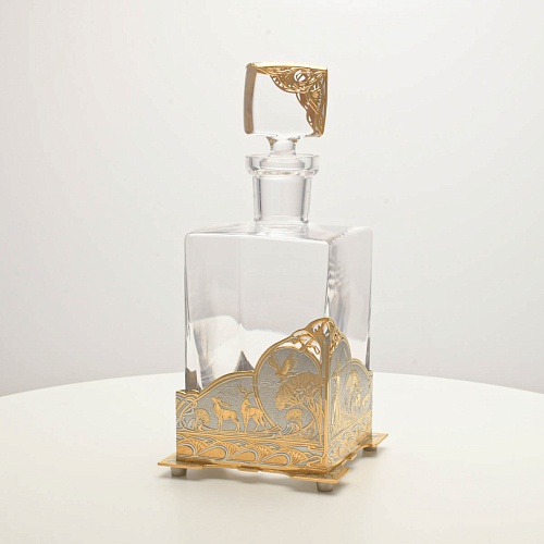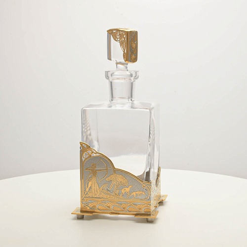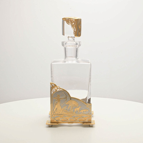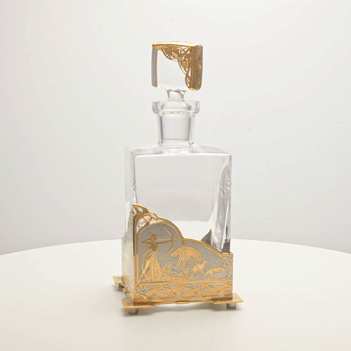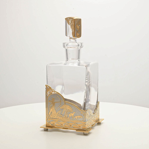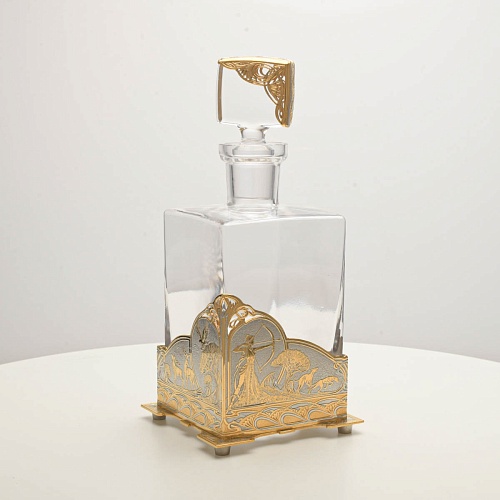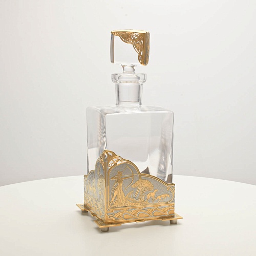 Оригинальный графин в обрамлении просечной подставки, украшенной геометрическими орнаментами и охотничьими сюжетами, выполнен по мотивам древнегреческой мифологии. Графин "Артемида на охоте" создаст незабываемую атмосферу в кругу друзей. Рисование, травление, подрезка, гравирование, никелирование, золочение, шабрение – все работы по металлу выполнены мастерами Компании «АиР» вручную. Художественная обработка, использование благородных металлов, реалистичная детализация фигур богини охоты и животных - все эти нюансы изготовления авторской посуды придают изделию изысканный вид.