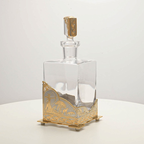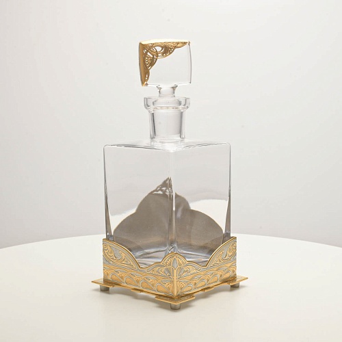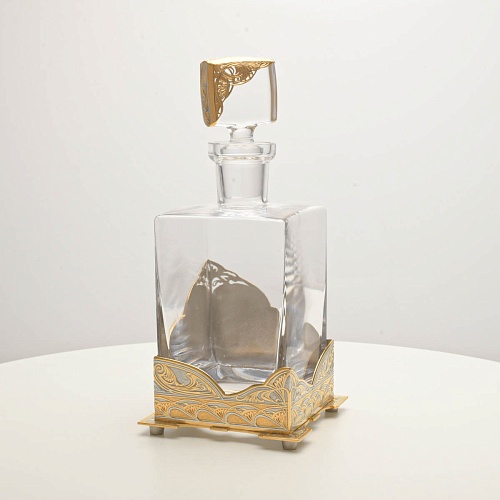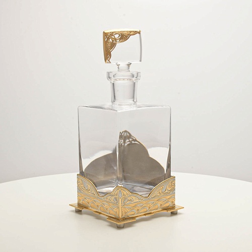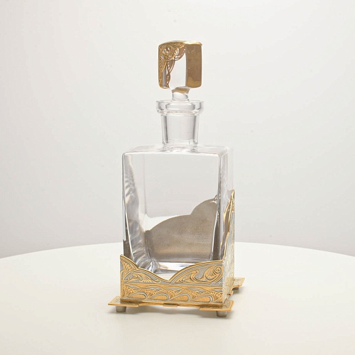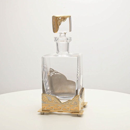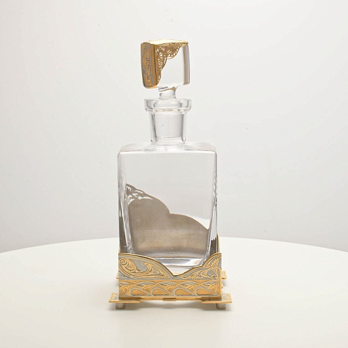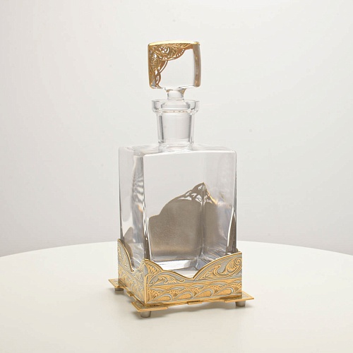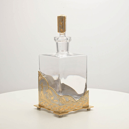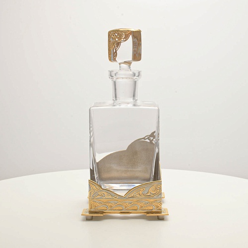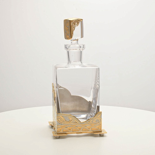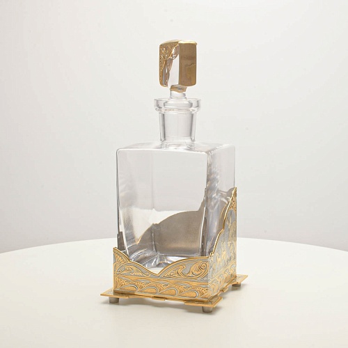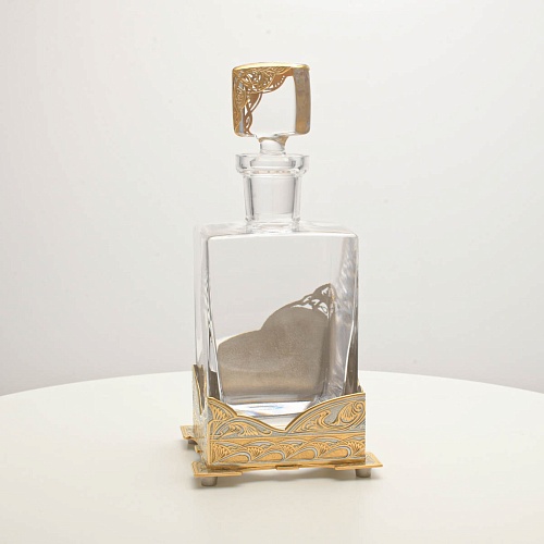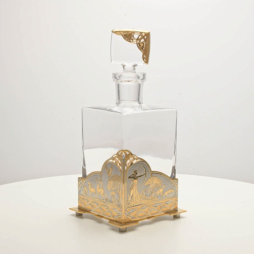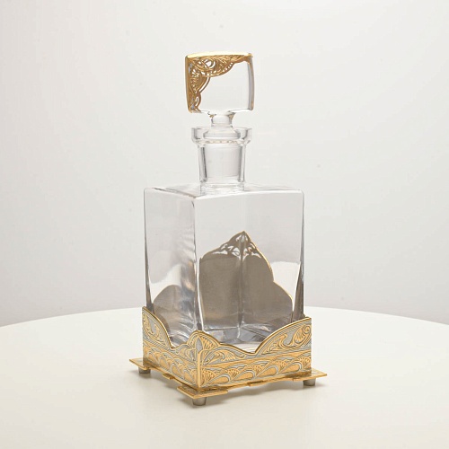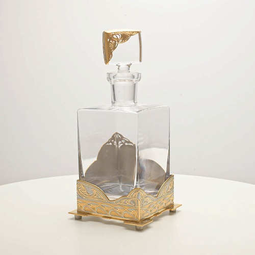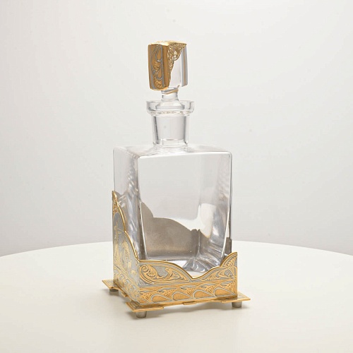 Оригинальный графин в обрамлении просечной подставки, украшенной геометрическими орнаментами и охотничьими сюжетами, выполнен по мотивам древнегреческой мифологии. Графин "Артемида на охоте" создаст незабываемую атмосферу в кругу друзей. Рисование, травление, подрезка, гравирование, никелирование, золочение, шабрение – все работы по металлу выполнены мастерами Компании «АиР» вручную. Художественная обработка, использование благородных металлов, реалистичная детализация фигур богини охоты и животных - все эти нюансы изготовления авторской посуды придают изделию изысканный вид.