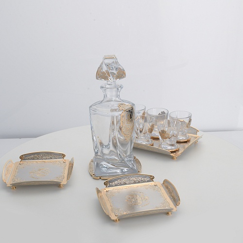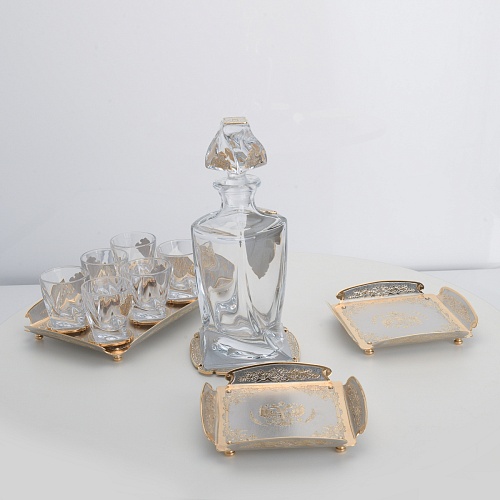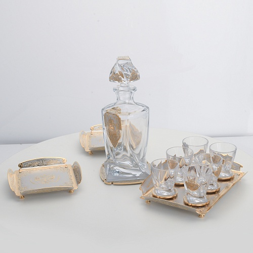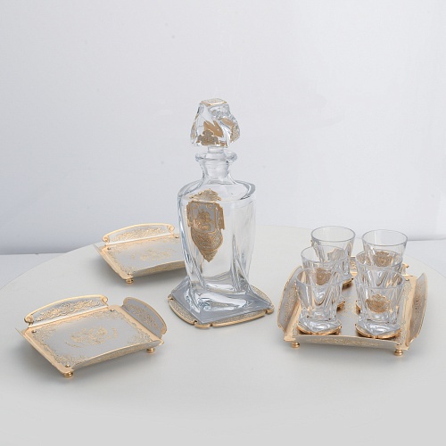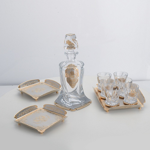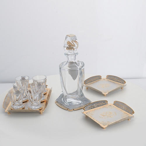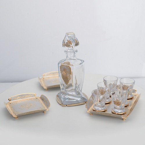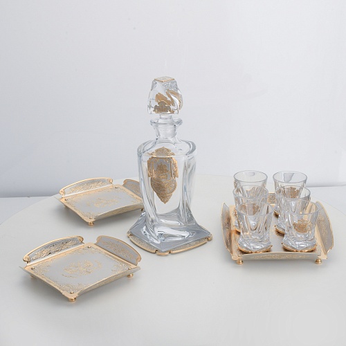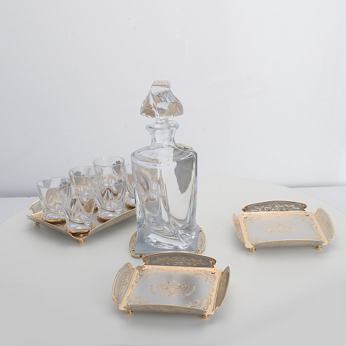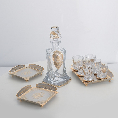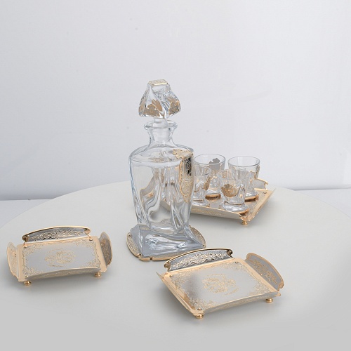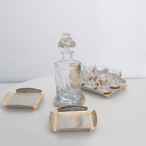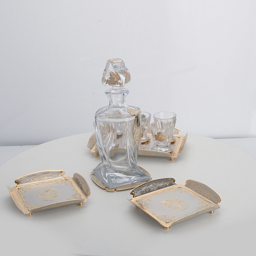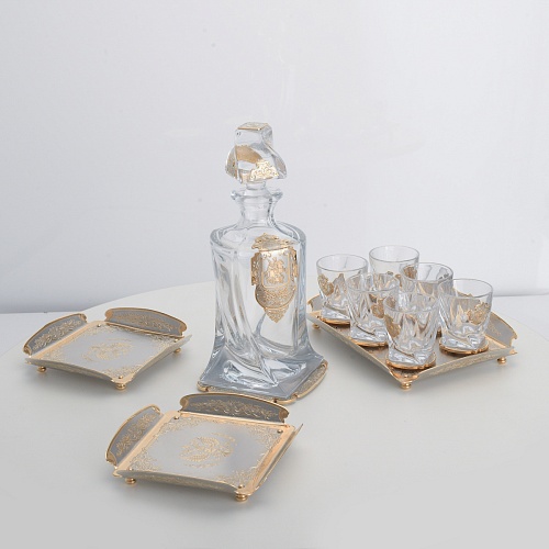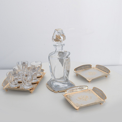 Водочный набор "Георгиевский" состоит из графина, двух блюд для закуски, подноса и шести стеклянных стопок для водки, настойки или домашней наливки. Весь набор очень тонко украшен элементами из металла. Изящные декоративные накладки крышке, лицевой стороне и основании графина и стопок – все это только подчеркивает красоту стекла "Bohemia". Рисование, травление, подрезка, гравирование, никелирование, золочение – все работы по металлу выполнены мастерами Компании «АиР» вручную.