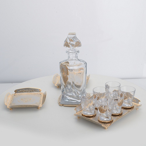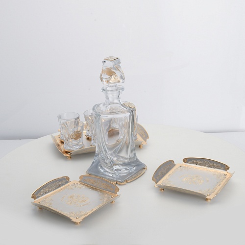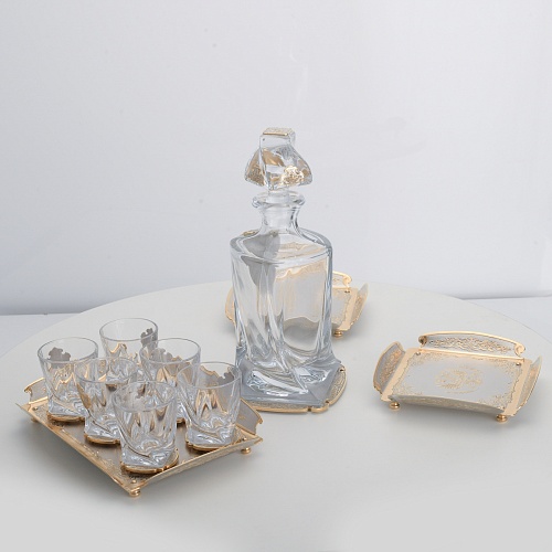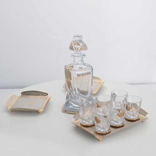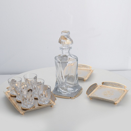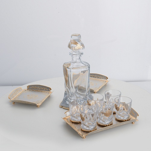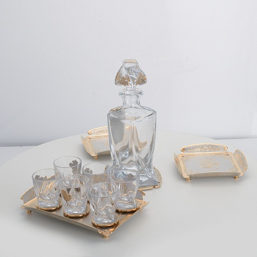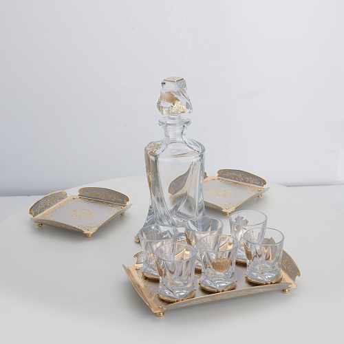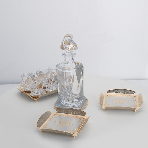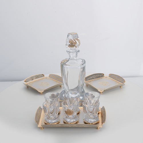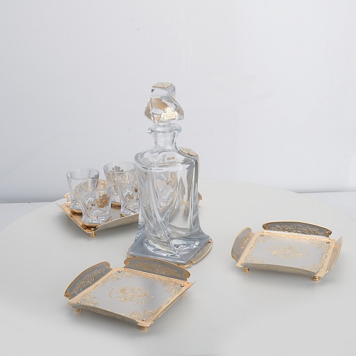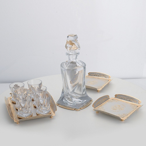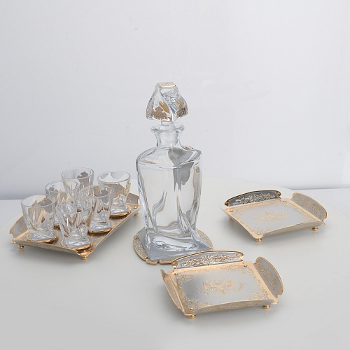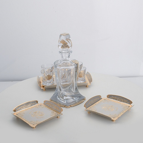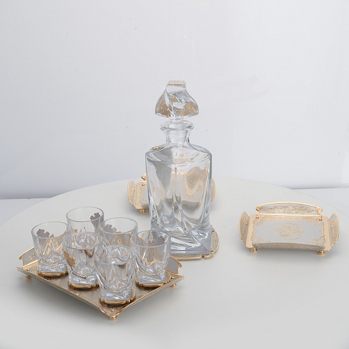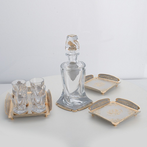 Водочный набор "Георгиевский" состоит из графина, двух блюд для закуски, подноса и шести стеклянных стопок для водки, настойки или домашней наливки. Весь набор очень тонко украшен элементами из металла. Изящные декоративные накладки крышке, лицевой стороне и основании графина и стопок – все это только подчеркивает красоту стекла "Bohemia". Рисование, травление, подрезка, гравирование, никелирование, золочение – все работы по металлу выполнены мастерами Компании «АиР» вручную.