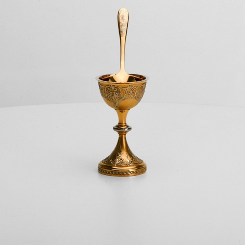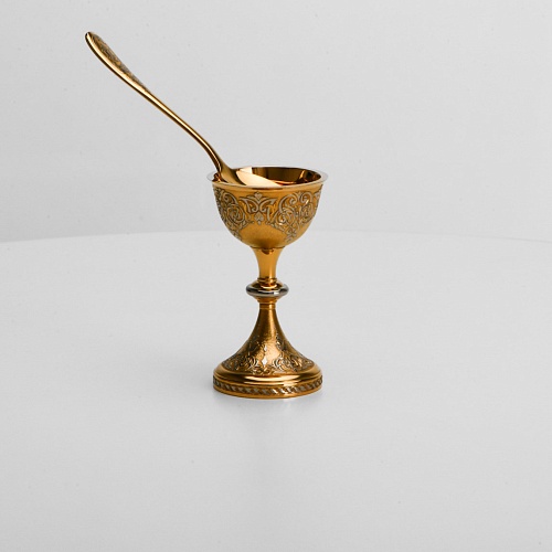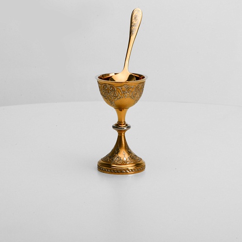 Пашотница имеет форму небольшой рюмочки на ножке. Основание и боковые стороны пашотницы и ложечки украшены растительным орнаментом.