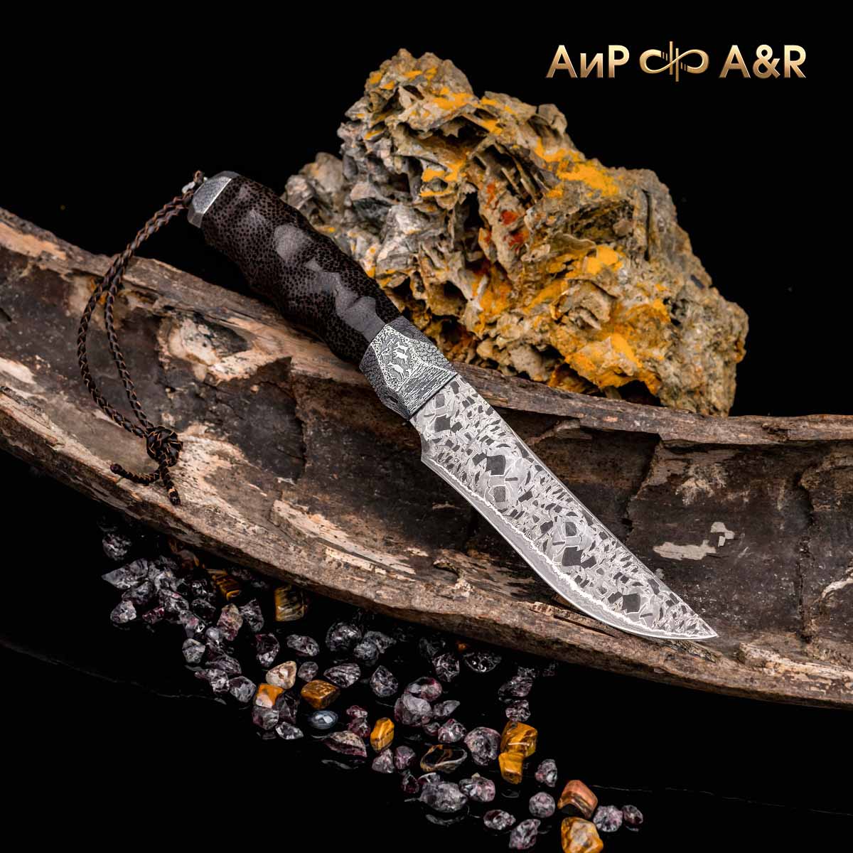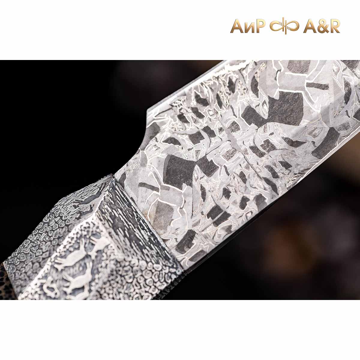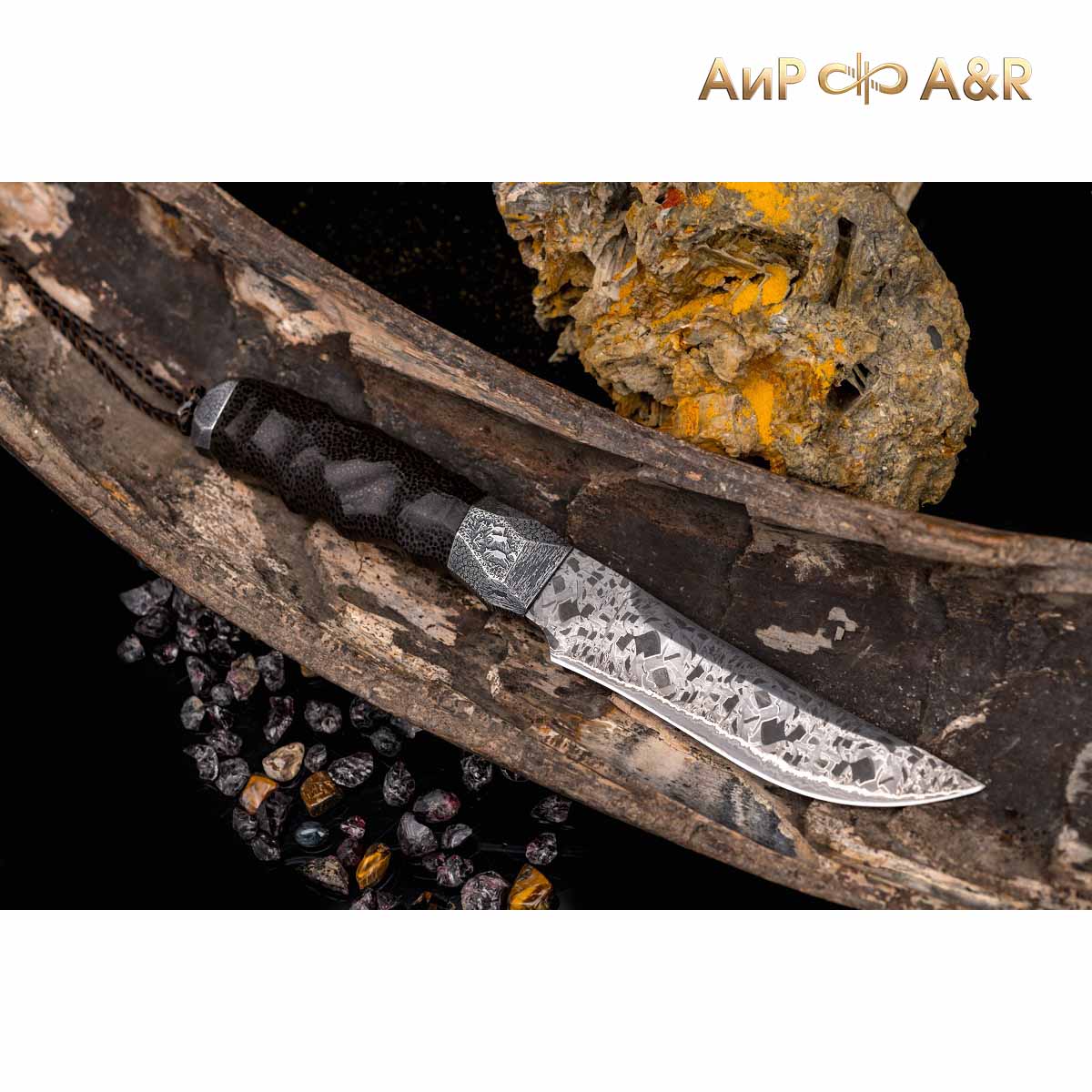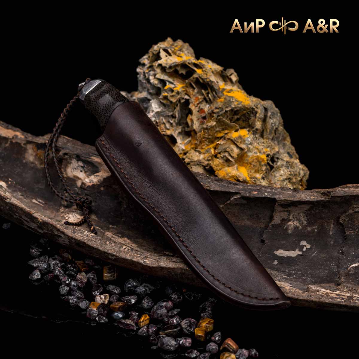 Художник Компании "АиР" Надежда Парфентьева придумала творческий образ ножа, центральное место которого занимает оригинальный клинок из авторского мозаичного дамаска американского мастера Хэнка Никмейера (Hank Knickmeyer). Рукоять из пальмы с обработкой "каменный век", гарда и навершие со стилизованными наскальными рисунками придают ножу налет древности, когда люди охотились на мамонтов.