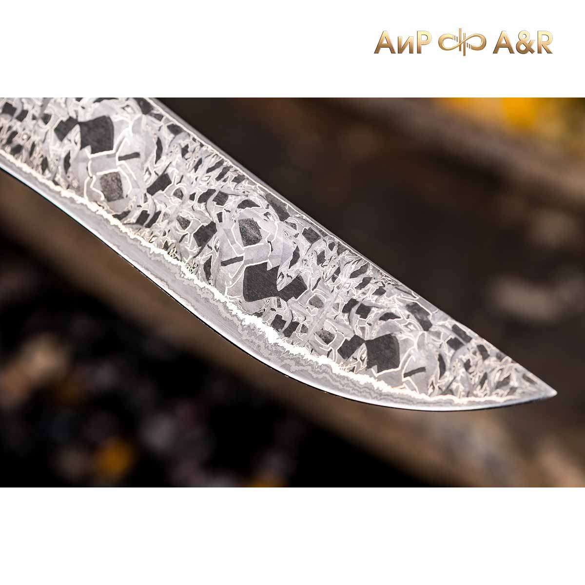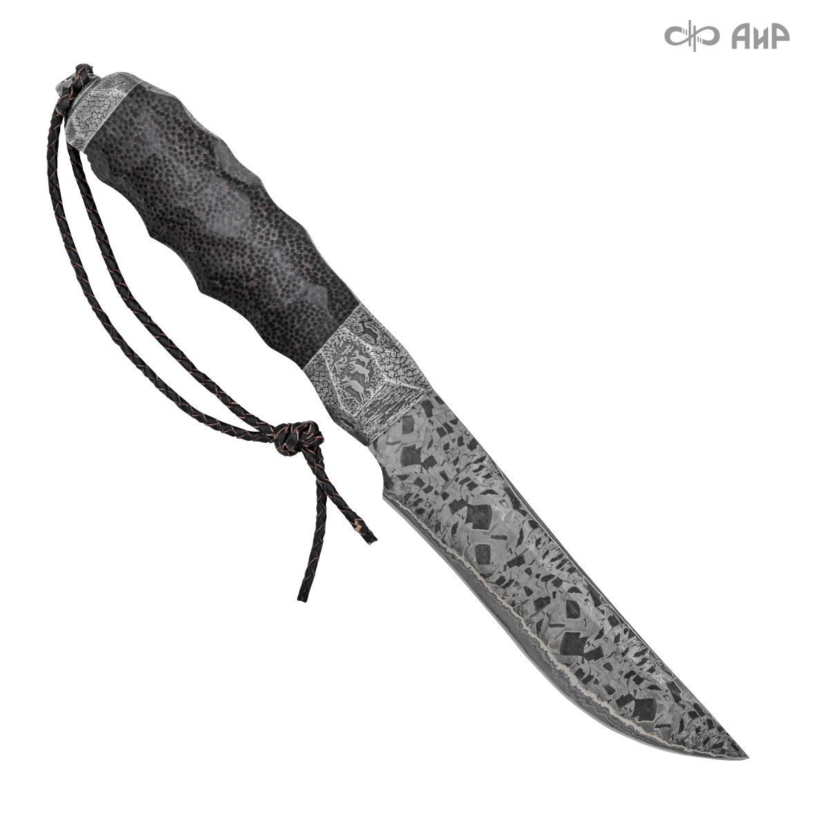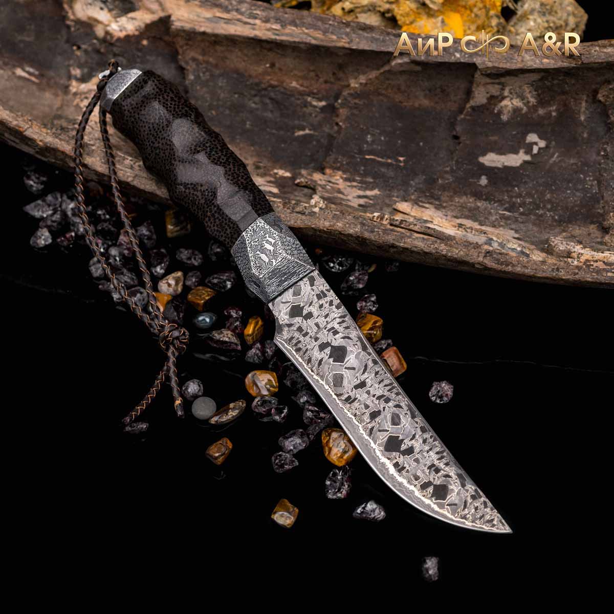 Художник Компании "АиР" Надежда Парфентьева придумала творческий образ ножа, центральное место которого занимает оригинальный клинок из авторского мозаичного дамаска американского мастера Хэнка Никмейера (Hank Knickmeyer). Рукоять из пальмы с обработкой "каменный век", гарда и навершие со стилизованными наскальными рисунками придают ножу налет древности, когда люди охотились на мамонтов.