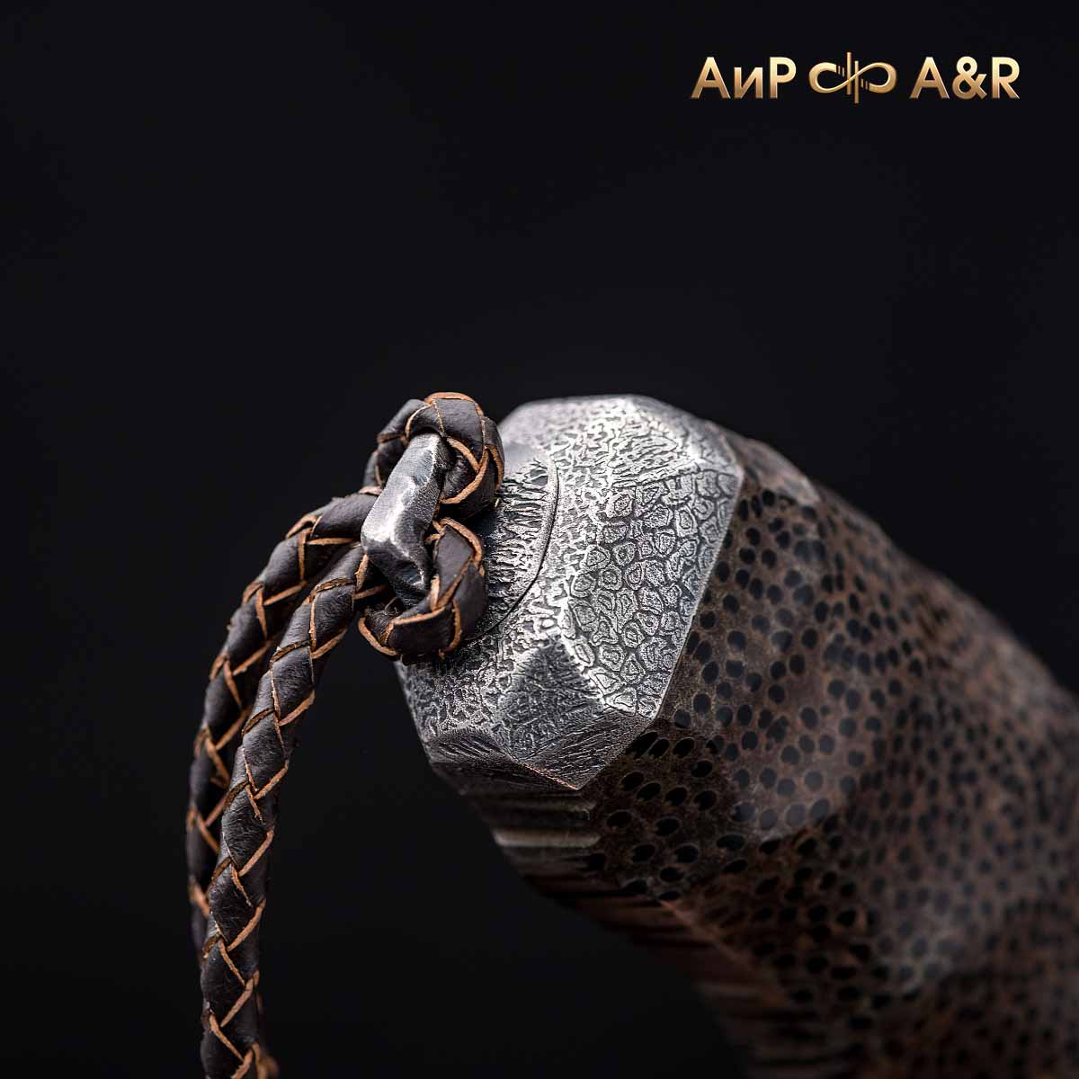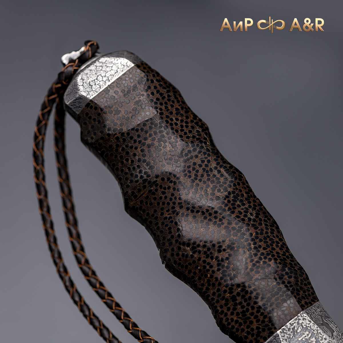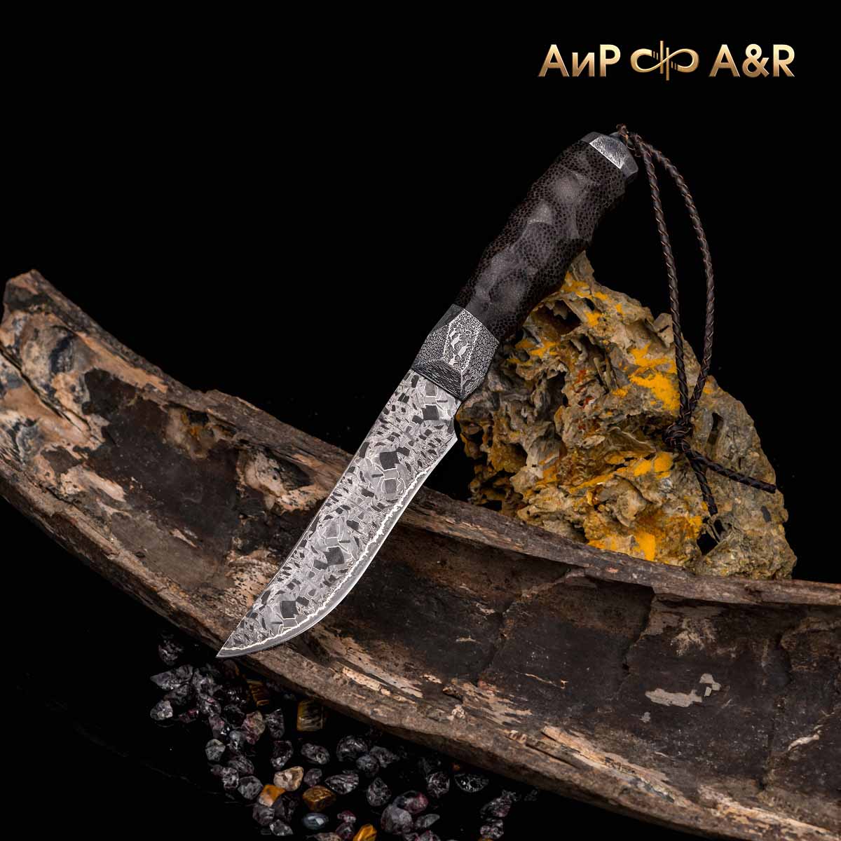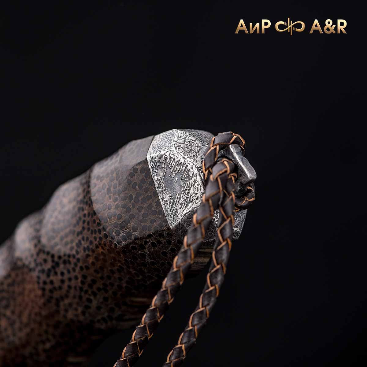 Художник Компании "АиР" Надежда Парфентьева придумала творческий образ ножа, центральное место которого занимает оригинальный клинок из авторского мозаичного дамаска американского мастера Хэнка Никмейера (Hank Knickmeyer). Рукоять из пальмы с обработкой "каменный век", гарда и навершие со стилизованными наскальными рисунками придают ножу налет древности, когда люди охотились на мамонтов.