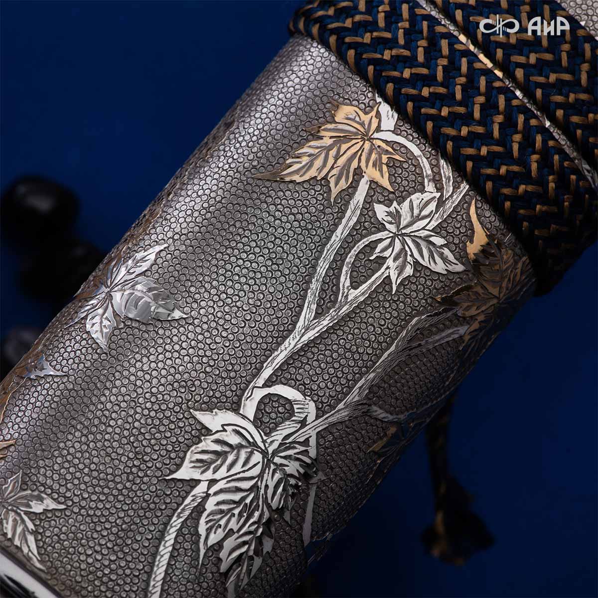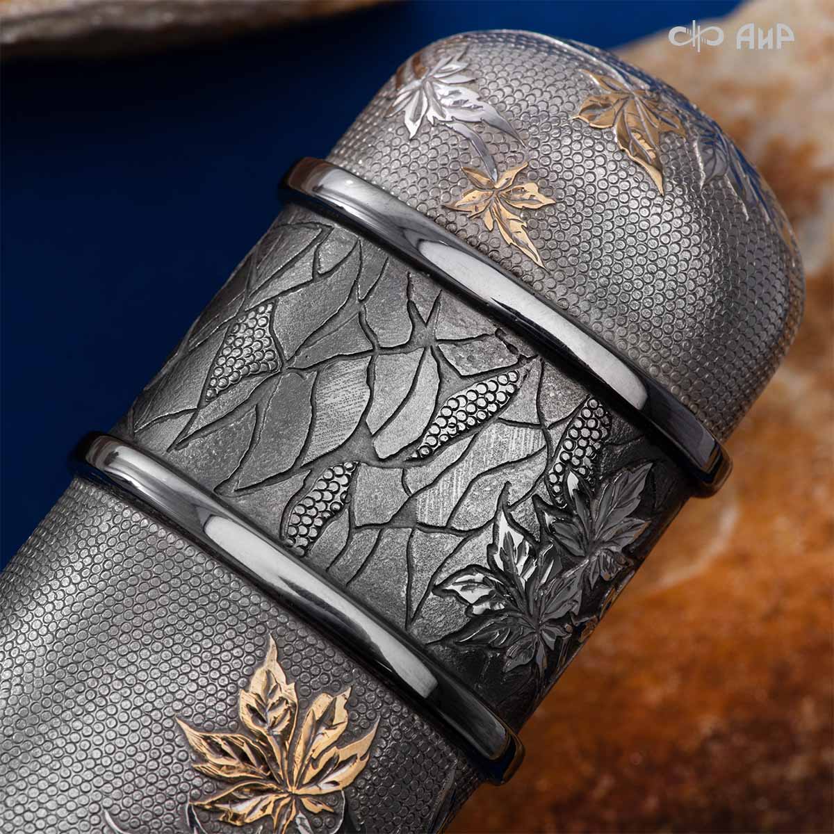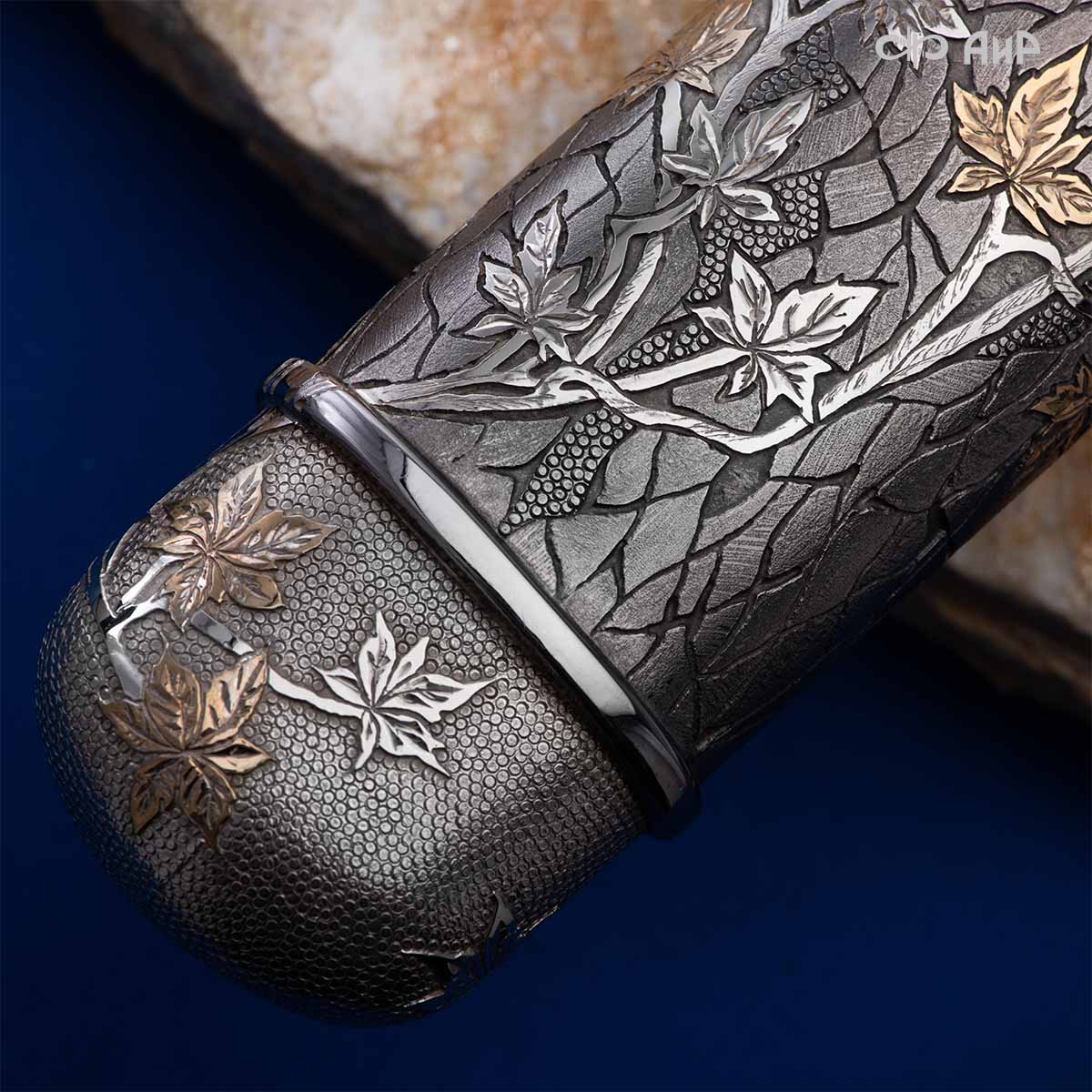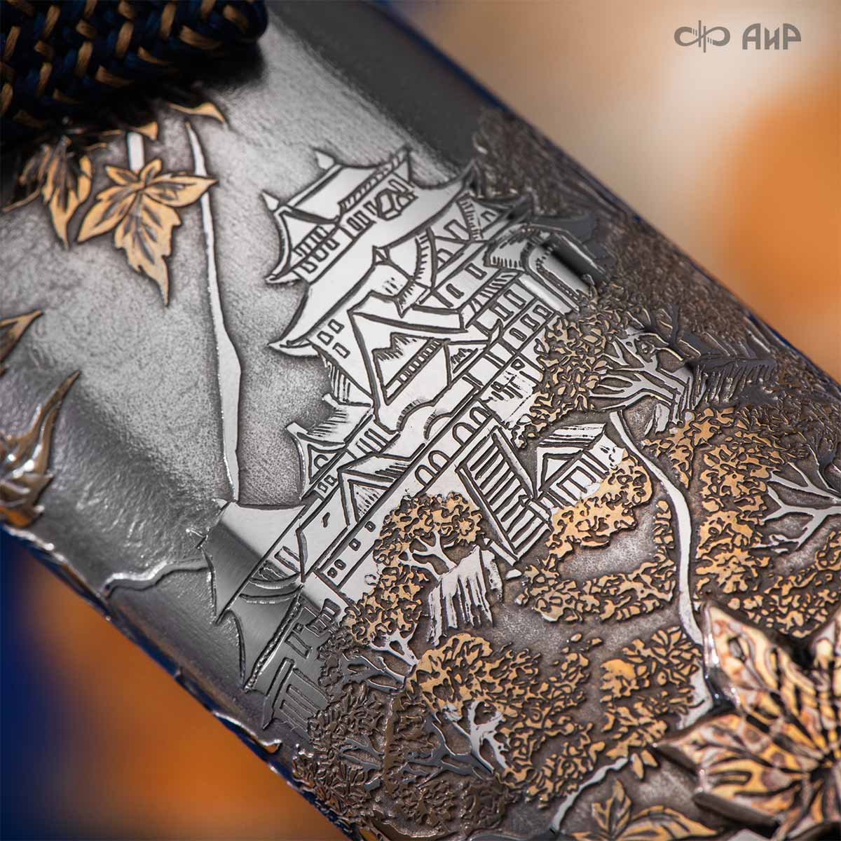 Глубоко пропустив через себя эту притчу, мастера «АиР» создали поистине произведение оружейного искусства. Клинок из дамасской стали ZLADINOX ZDI-1016 у основания украшен мокуме гане. Рукоять и цельнометаллические ножны символизируют собой подлунный мир, в котором красота может быть такой хрупкой, с одной стороны, а с другой стороны – способна смягчить сердце императора-самурая. Танто изысканно украшен тонкими резными кленовыми листочками золотистого и серебристого цвета. Весь фон рукояти и ножен богато проработан для придания различной фактуры, напоминающей и землю, и камни, и ковер из листьев, и пепел. На ножнах тщательно прорисован дворец мудрого правителя в обрамлении кленовых ветвей. При одном только взгляде на танто замирает сердце и становится понятно, почему японский народ умеет ценить совершенство оружия и созерцать бесконечную красоту окружающей природы.