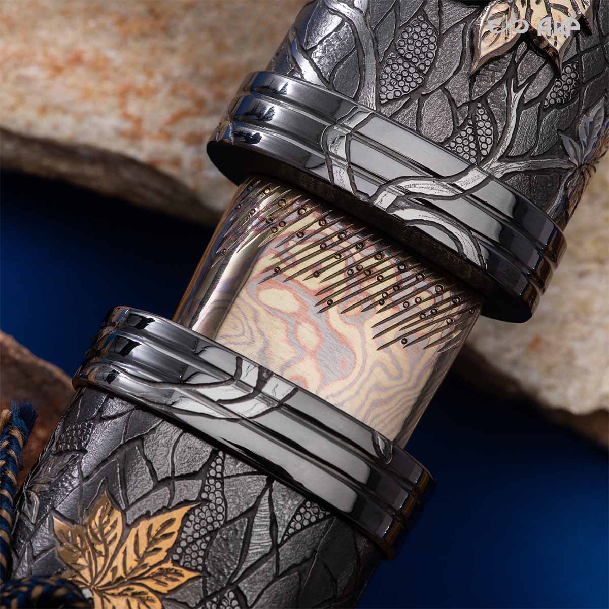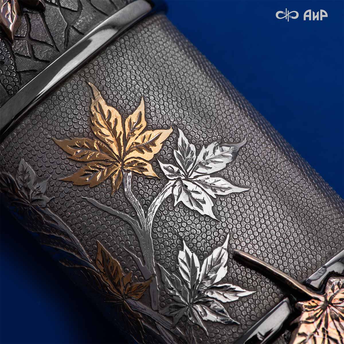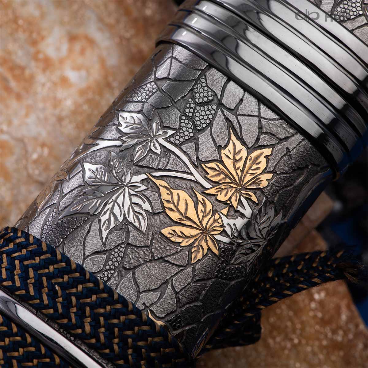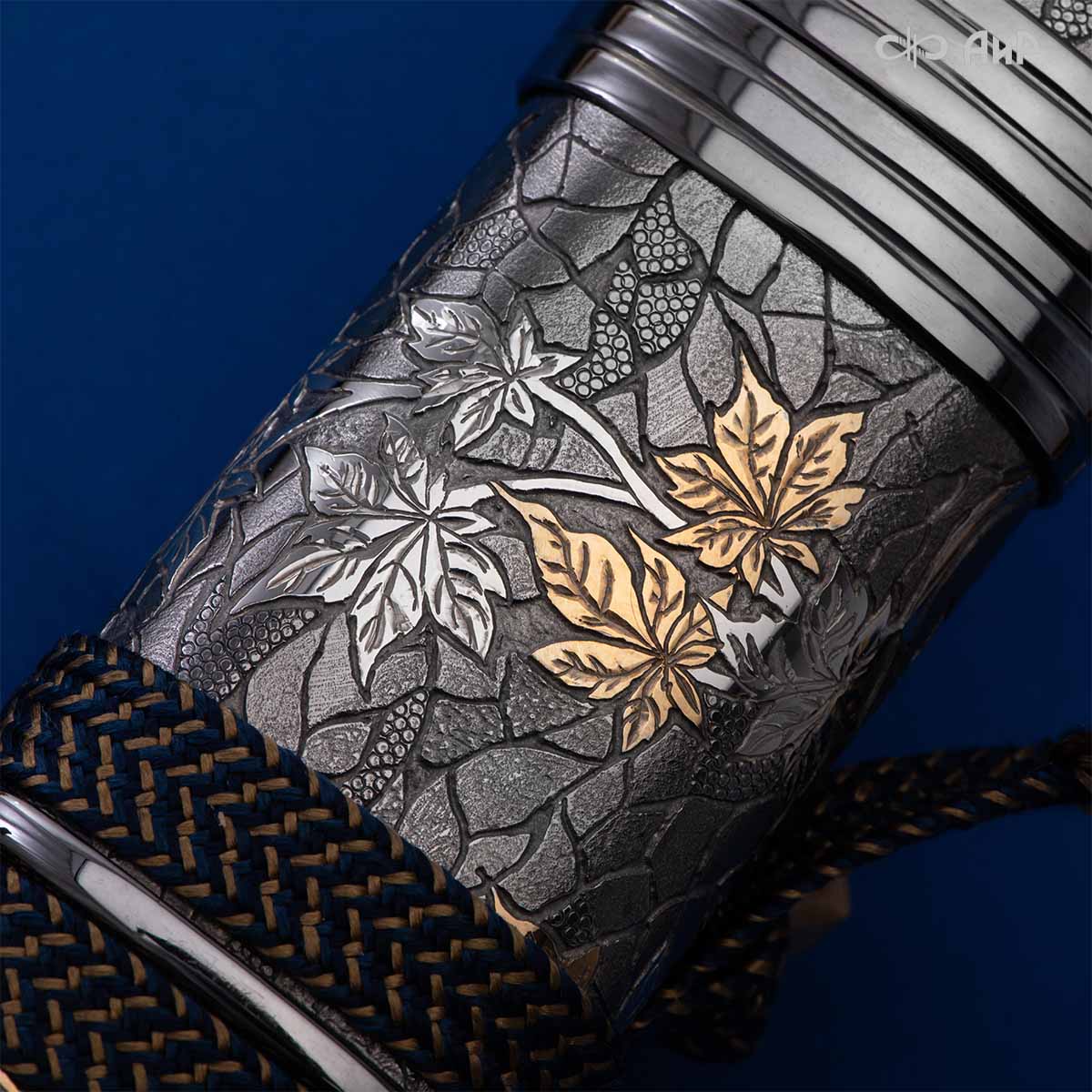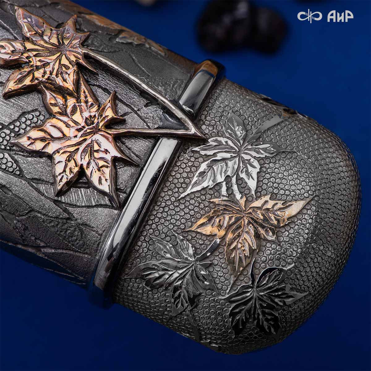 Глубоко пропустив через себя эту притчу, мастера «АиР» создали поистине произведение оружейного искусства. Клинок из дамасской стали ZLADINOX ZDI-1016 у основания украшен мокуме гане. Рукоять и цельнометаллические ножны символизируют собой подлунный мир, в котором красота может быть такой хрупкой, с одной стороны, а с другой стороны – способна смягчить сердце императора-самурая. Танто изысканно украшен тонкими резными кленовыми листочками золотистого и серебристого цвета. Весь фон рукояти и ножен богато проработан для придания различной фактуры, напоминающей и землю, и камни, и ковер из листьев, и пепел. На ножнах тщательно прорисован дворец мудрого правителя в обрамлении кленовых ветвей. При одном только взгляде на танто замирает сердце и становится понятно, почему японский народ умеет ценить совершенство оружия и созерцать бесконечную красоту окружающей природы.